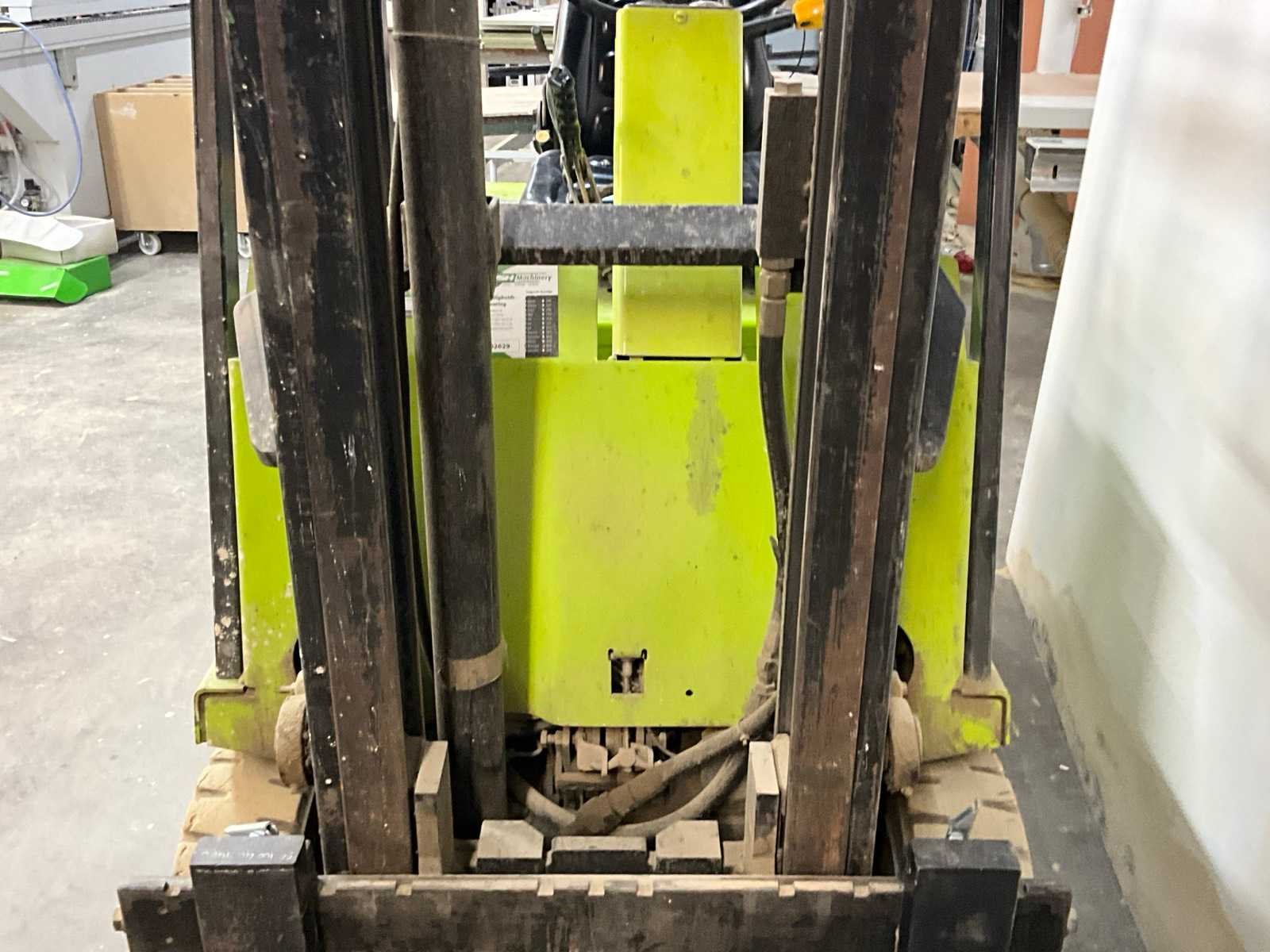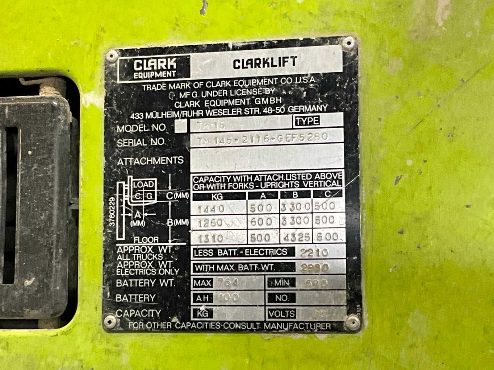 Merk: Clark Type: TM 15 Serienummer: TM 145. 2116.GEF5280 Soort band: Volrubber banden Aantal wielen: 3 Afgelezen urenstand: 4773 Accu lader: true Duplex mast: true Eigen gewicht: 2900kg Hefvermogen: 1440kg Lepellengte: 1400mm Hefhoogte: 3300mm Minimale doorrijhoogte: 2300mm Totale afmeting L: 3300mm Totale afmeting Breedte: 970mm Totale afmeting Hoogte: 2300mm