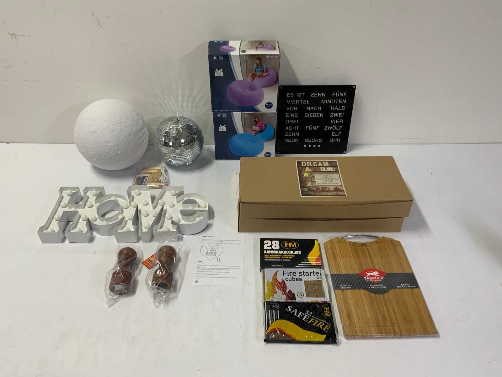 1e: Tekst klok 2e: "Home" LED verlichting 3e: Maan lamp kleur verstelbaar 4e: Opblaas zitzakken 5e: Peper- en zoutstel 6e: BBQ 7e: Snijplank 8e: Discobal