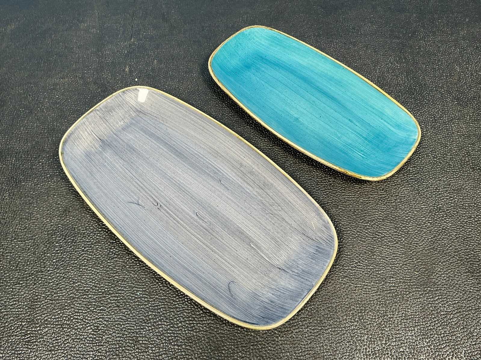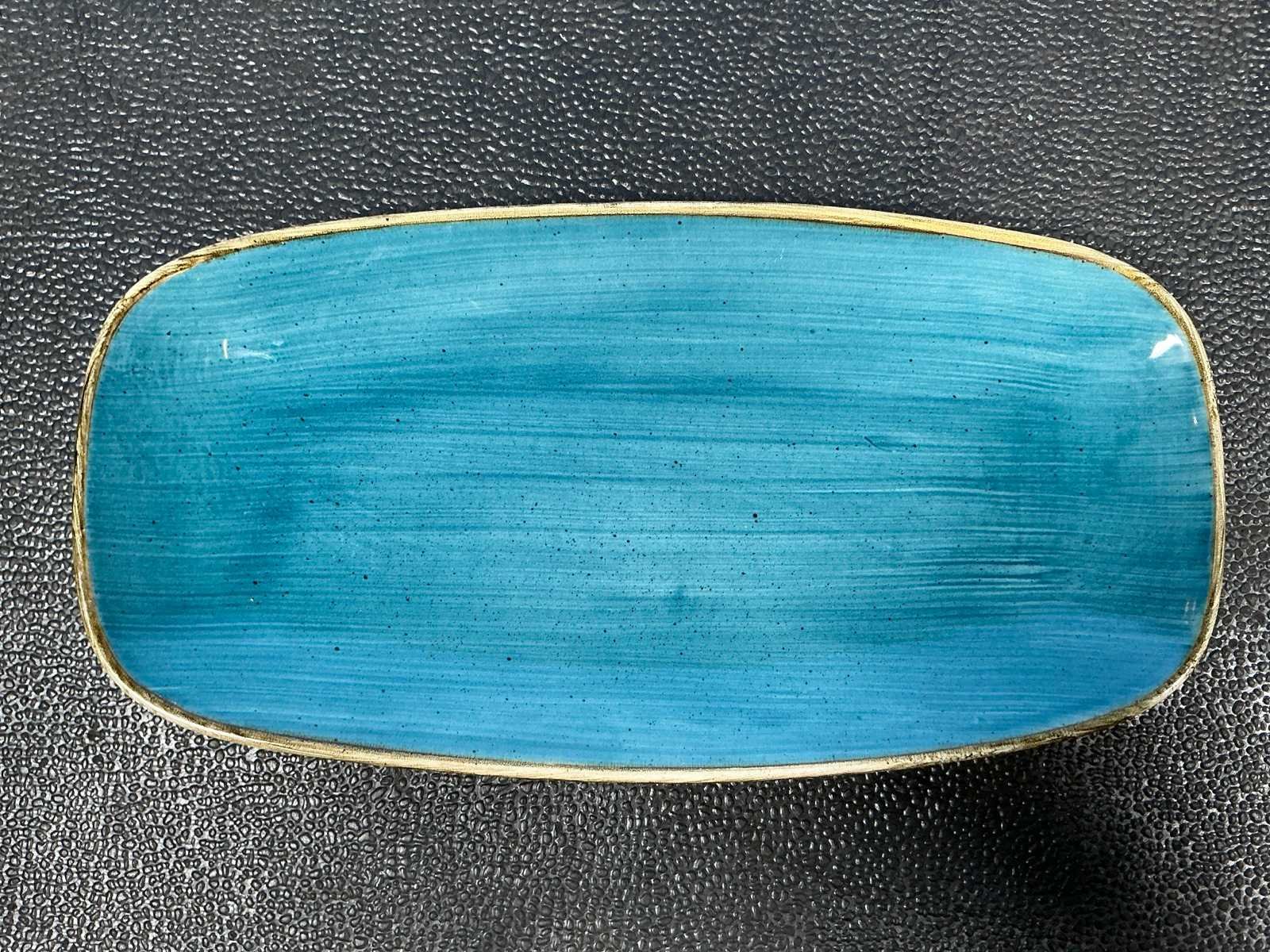 Bestaande uit: 30x Churchill Stonecast Chefs oblong bord Blueberry 35,5x19cm, 30x Churchill Stonecast Chefs oblong bord Java Blue 30,5x15,3cm. In en met 2 kratten. Merk: Churchill Model: Stonecast Materiaal: Super Vitrified porselein