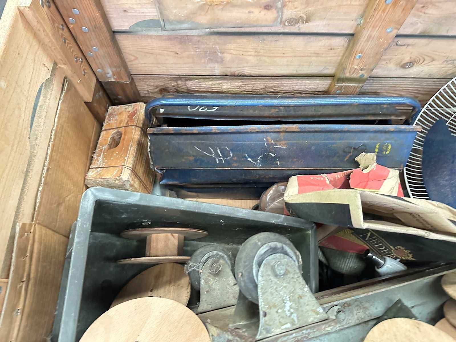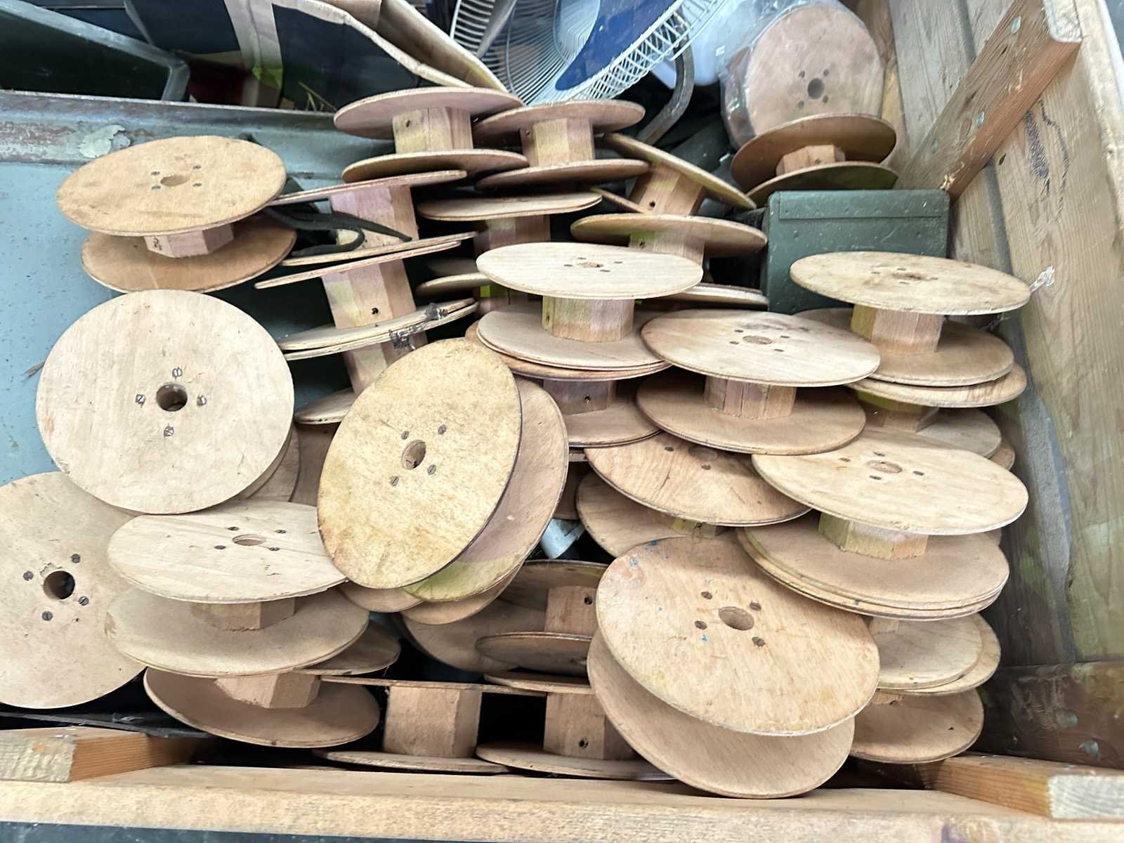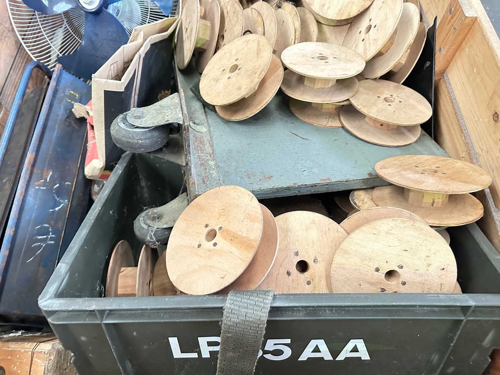 Deze partij bestaat uit lege houten haspels, ventilator, gereedschapskist, en diverse overige magazijninventaris.