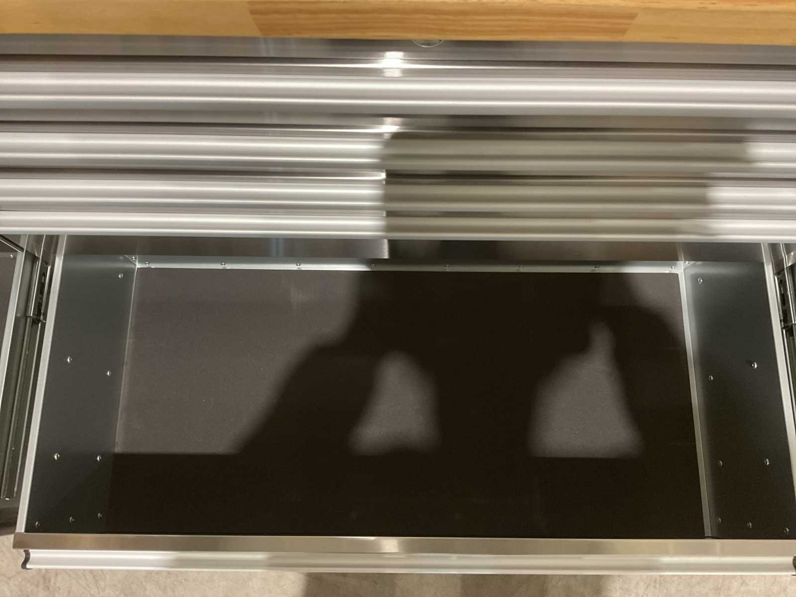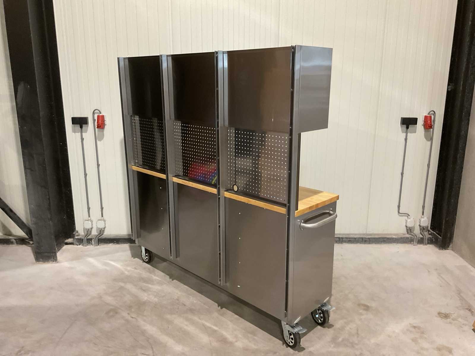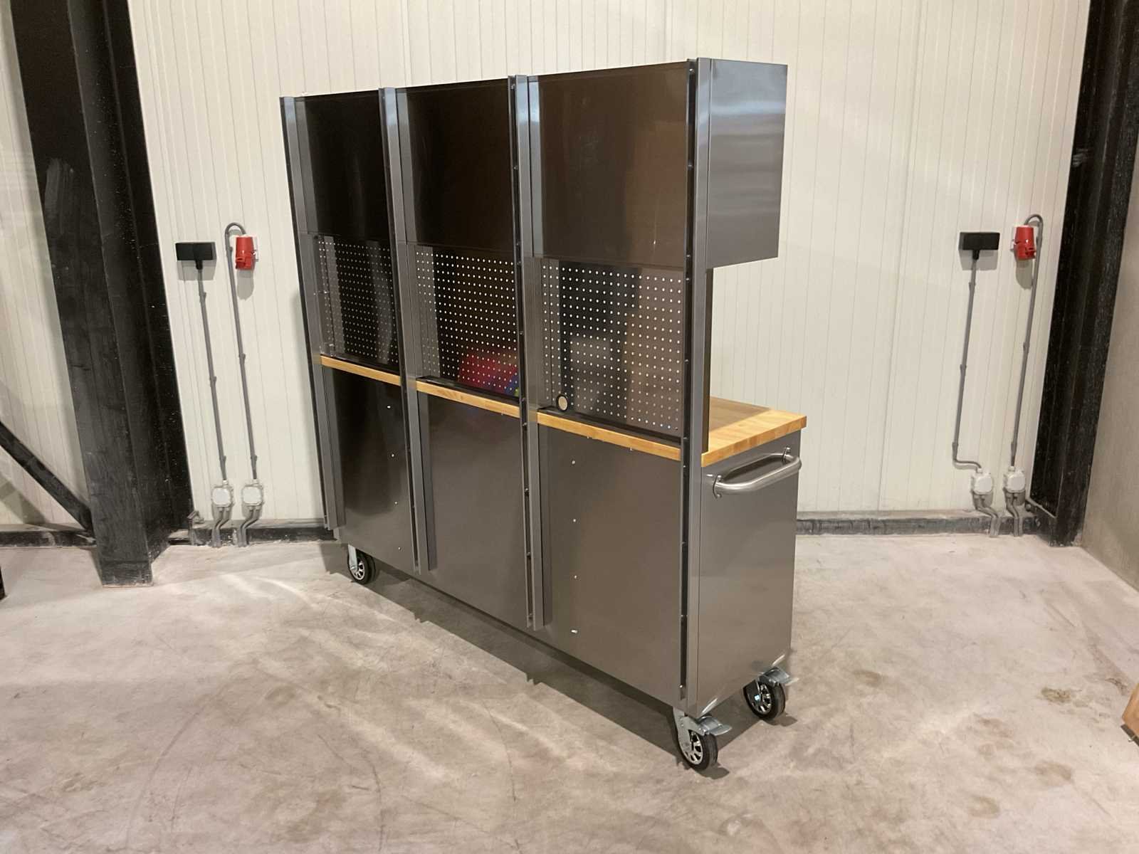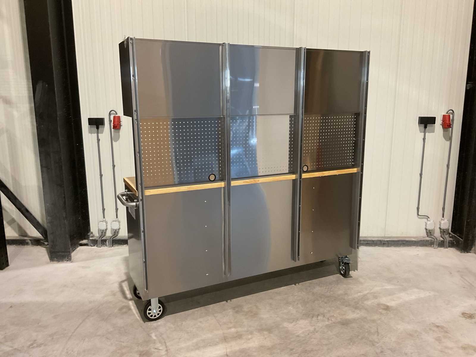 Voorzien van all 430 anti-fingerprint stainless steel; 15 laden; 3 hoge kasten; achterwand; 35 mm houten werkblad; 2 handvaten; 4 x 6 inch wielen waarvan 2 wielen met rem; afsluitbaar door middel van sleutel; ongebruikt in doos (transport afmetingen 190x55x130 cm) Merk: Stahlworks Model: Deluxe RVS 72 inch high Product type: 15 laden Gewicht: 179kg Lengte: 1830mm Hoogte: 1870mm Materiaal: RVS