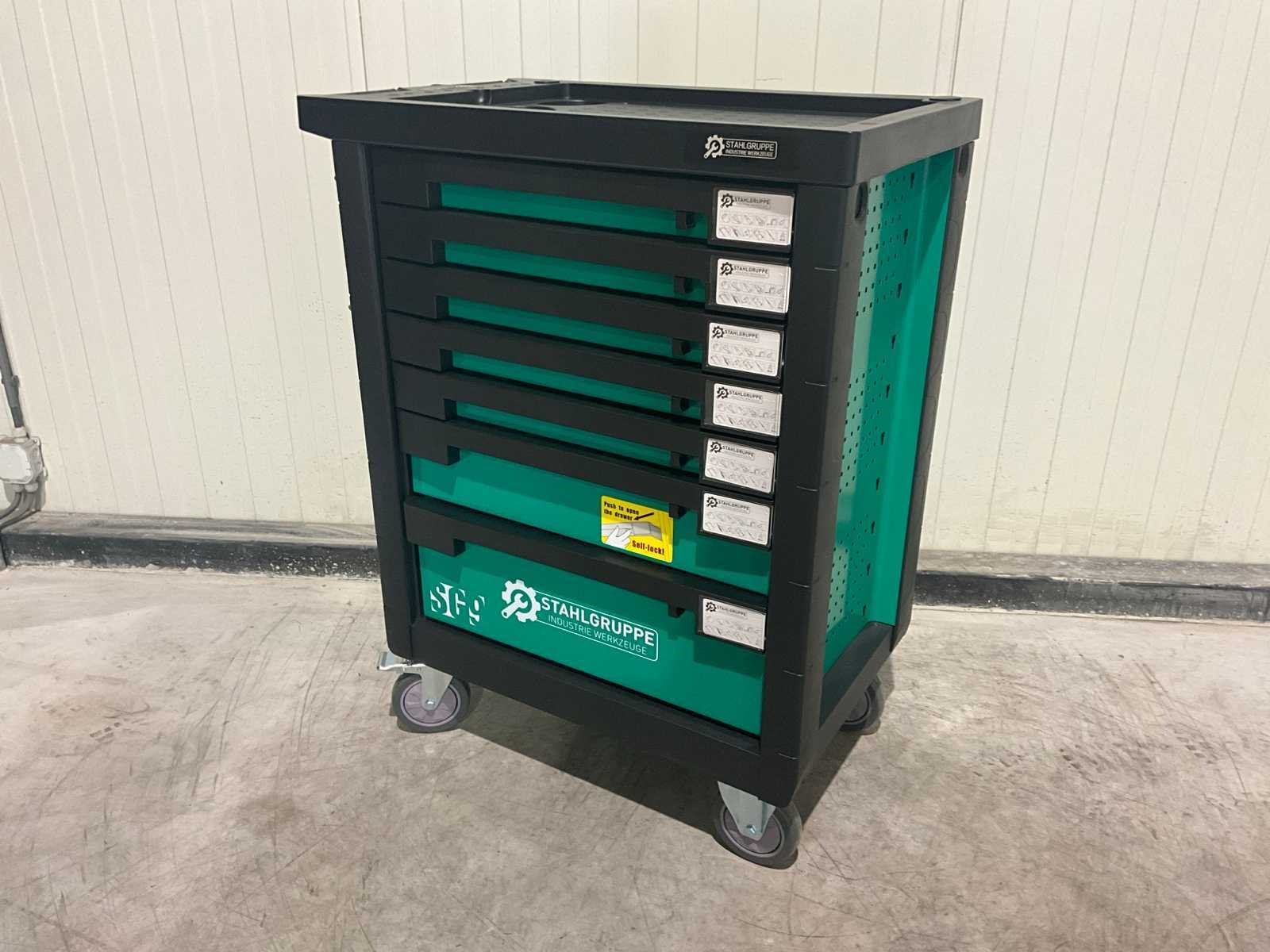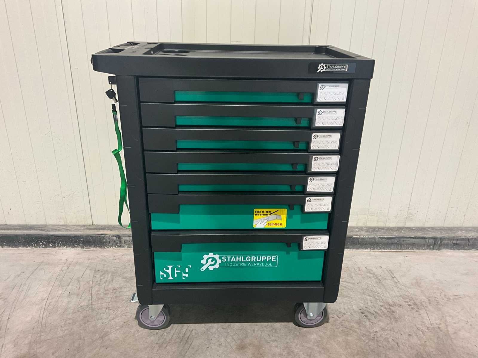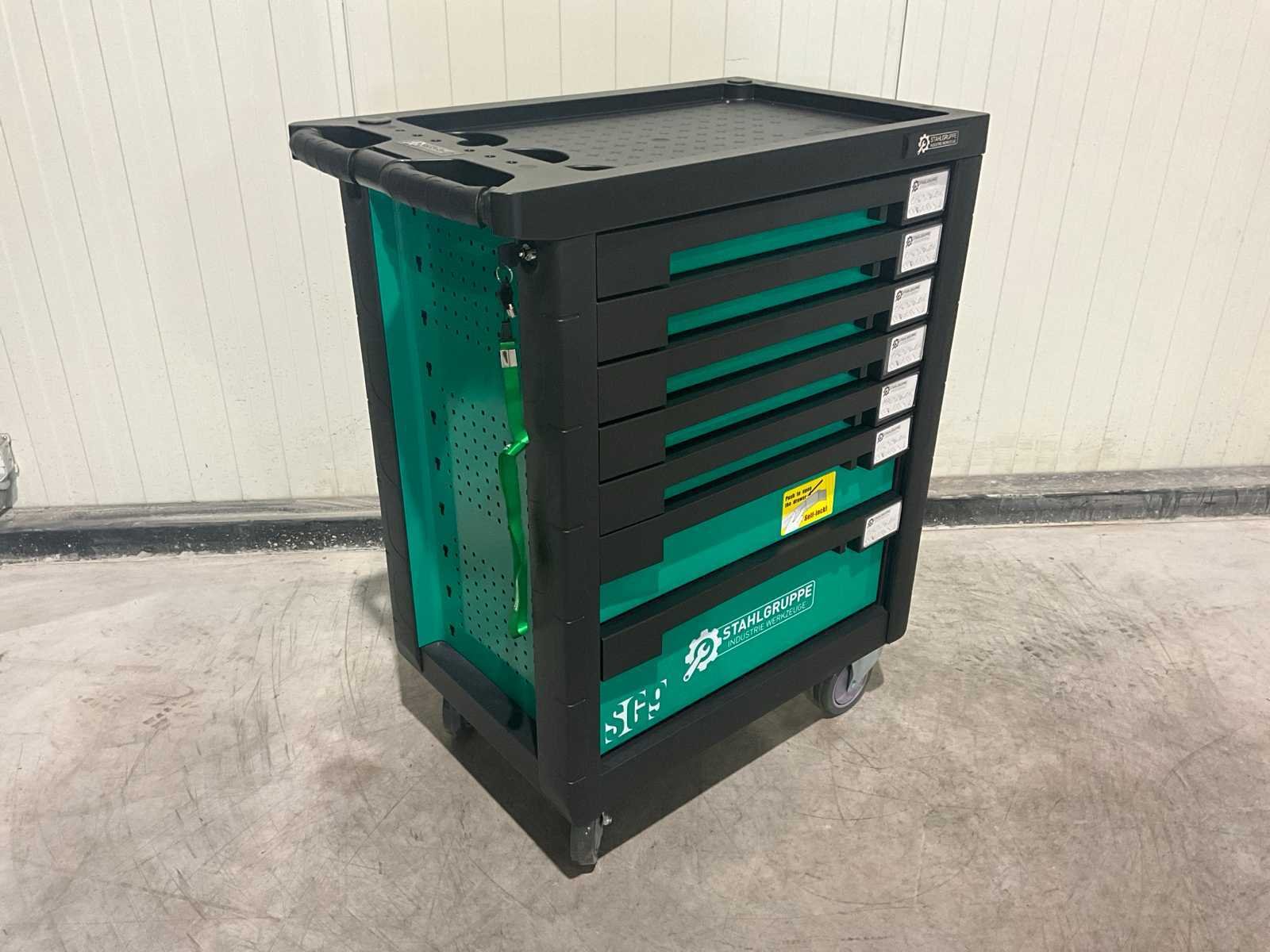 Voorzien van 7 lades waarvan 5 gevuld met gereedschap; professioneel chroom-vanadium gereedschap; heavy duty gereedschapswagen; stevig werkblad; 4 wielen; stevig handvat; ongebruikt in doos (transport afmetingen 80x50x105 cm) Merk: Stahlgruppe Type: SG9 Bouwjaar: 2025 Aantal laden: 7 Met inhoud: true Eigen gewicht: 78kg Totale afmeting L: 800mm Totale afmeting Breedte: 500mm Totale afmeting Hoogte: 1050mm