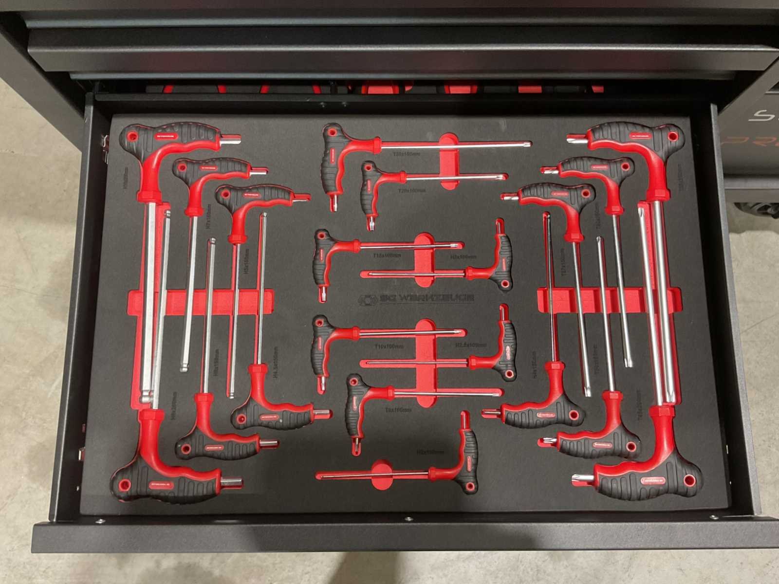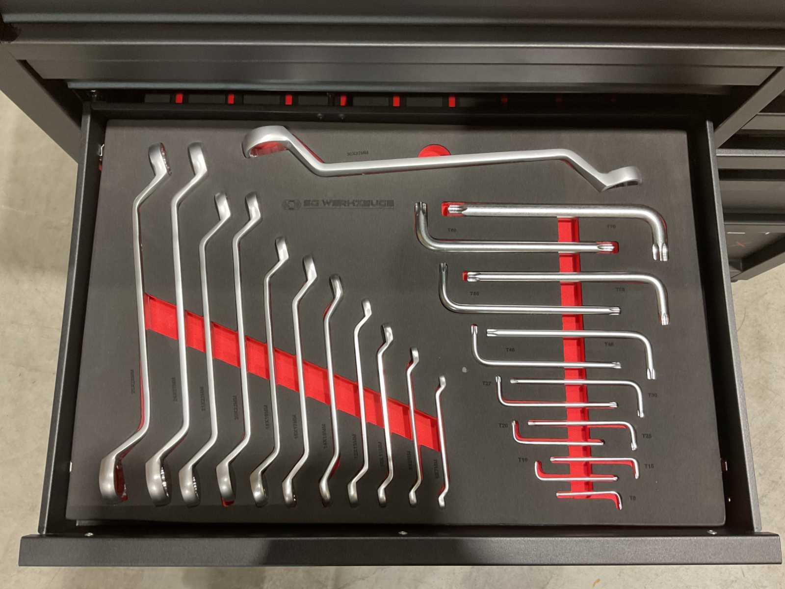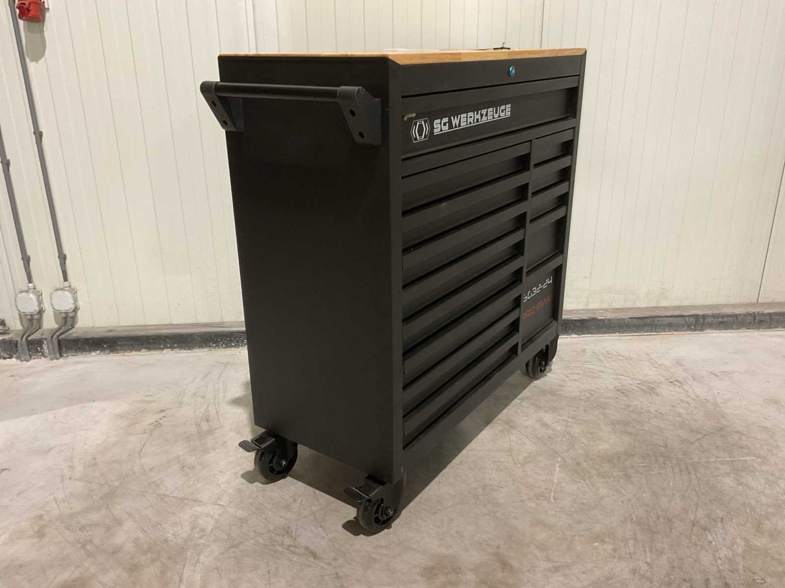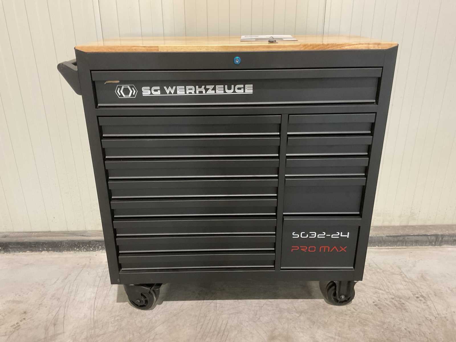 Voorzien van 14 lades waarvan 11 gevuld met gereedschap; professioneel chroom-vanadium gereedschap; heavy duty gereedschapswagen; houten werkblad; 4 wielen; stevig handvat; ongebruikt in doos (transport afmetingen 110x50x100 cm) Merk: SG Werkzeuge Type: SG32-24 Pro Max Bouwjaar: 2025 Aantal laden: 14 Met inhoud: true Eigen gewicht: 159kg Totale afmeting L: 1100mm Totale afmeting Breedte: 500mm Totale afmeting Hoogte: 1000mm
