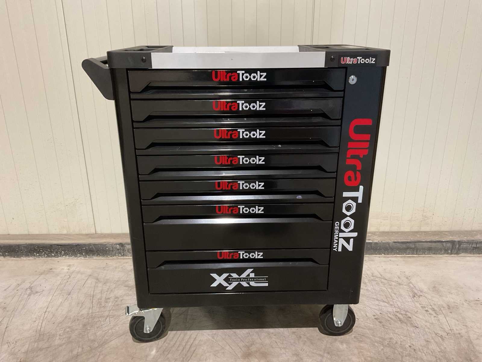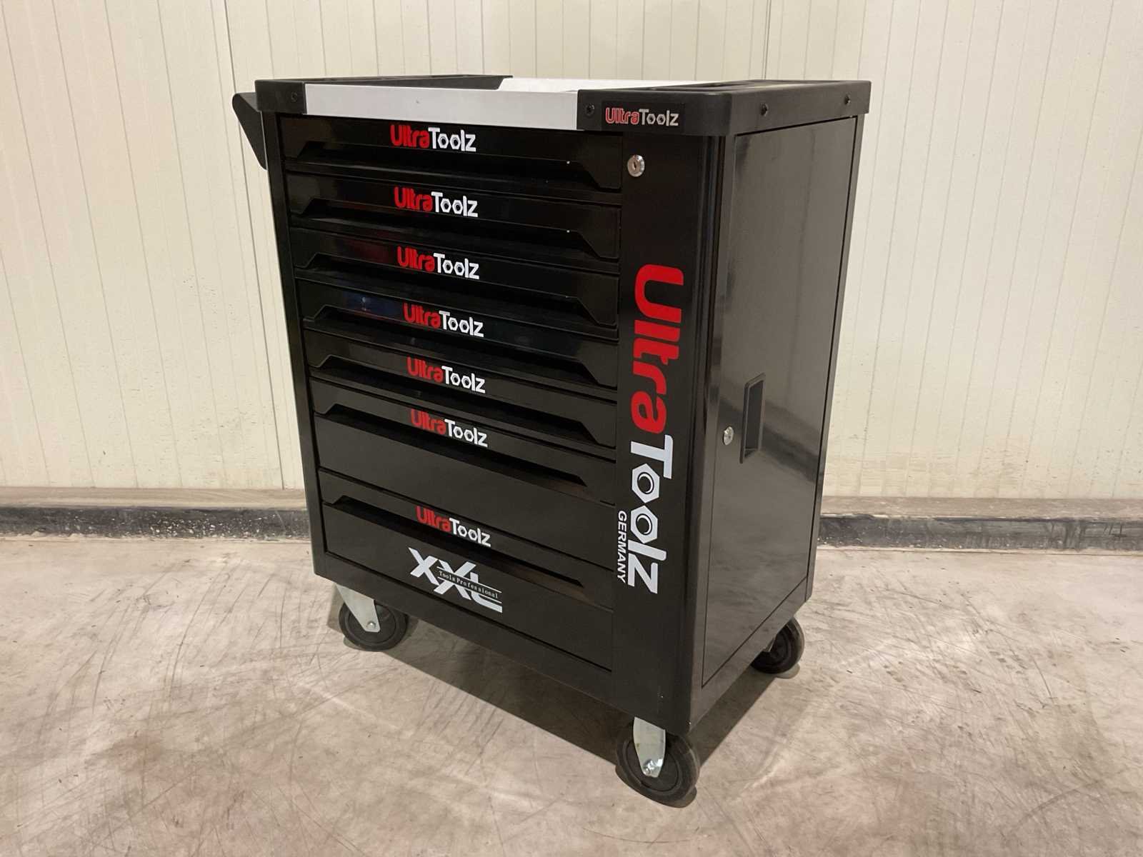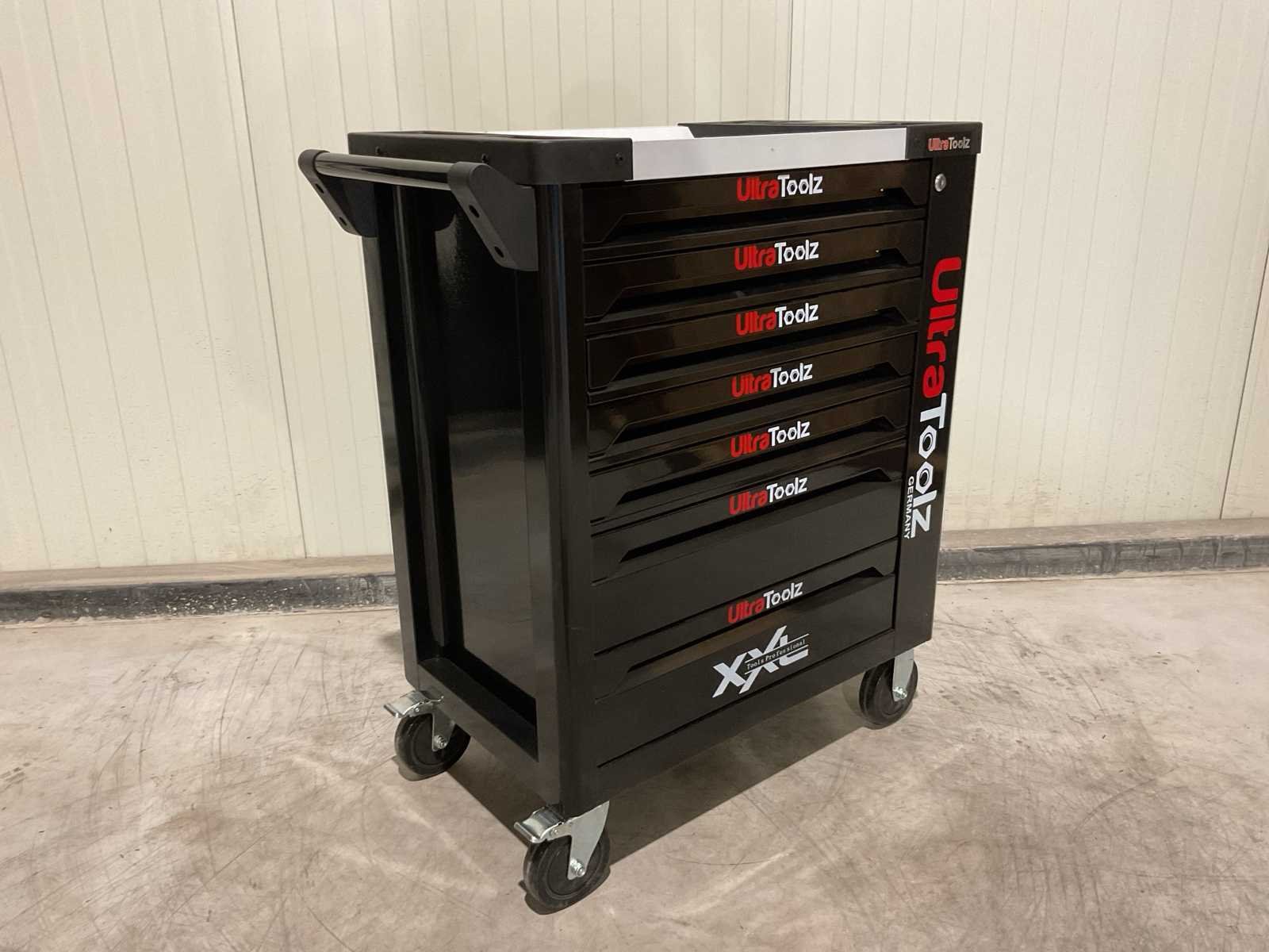 Voorzien van 7 lades waarvan 7 gevuld met vrgereedschap; professioneel chroom-vanadium gereedschap; heavy duty gereedschapswagen; stevig werkblad; 4 wielen; stevig handvat; ongebruikt in doos (transport afmetingen 80x50x85 cm) Merk: UltraToolz Type: Germany 7/7 ZW Bouwjaar: 2025 Aantal laden: 7 Met inhoud: true Eigen gewicht: 76kg Totale afmeting L: 800mm Totale afmeting Breedte: 500mm Totale afmeting Hoogte: 850mm