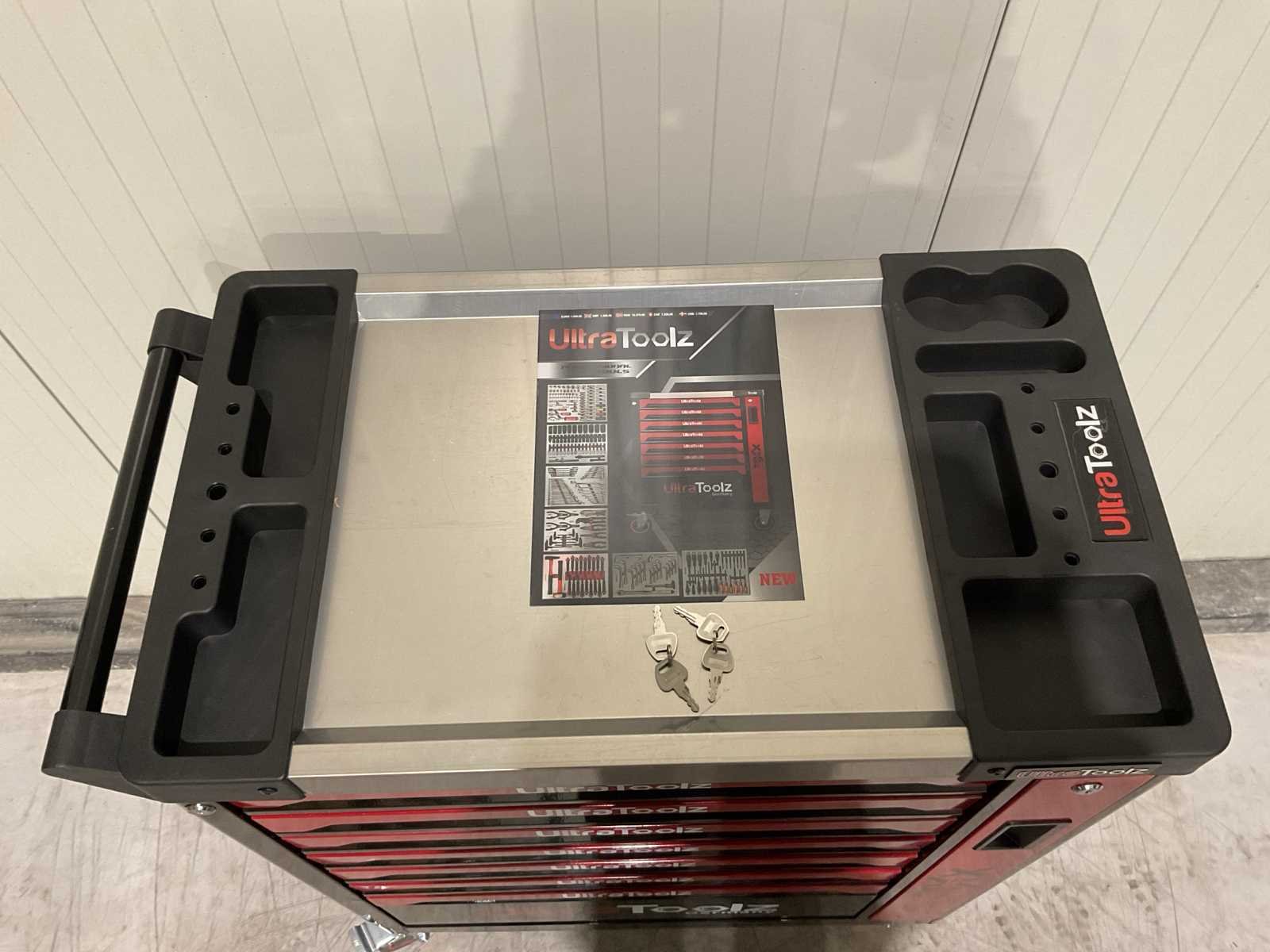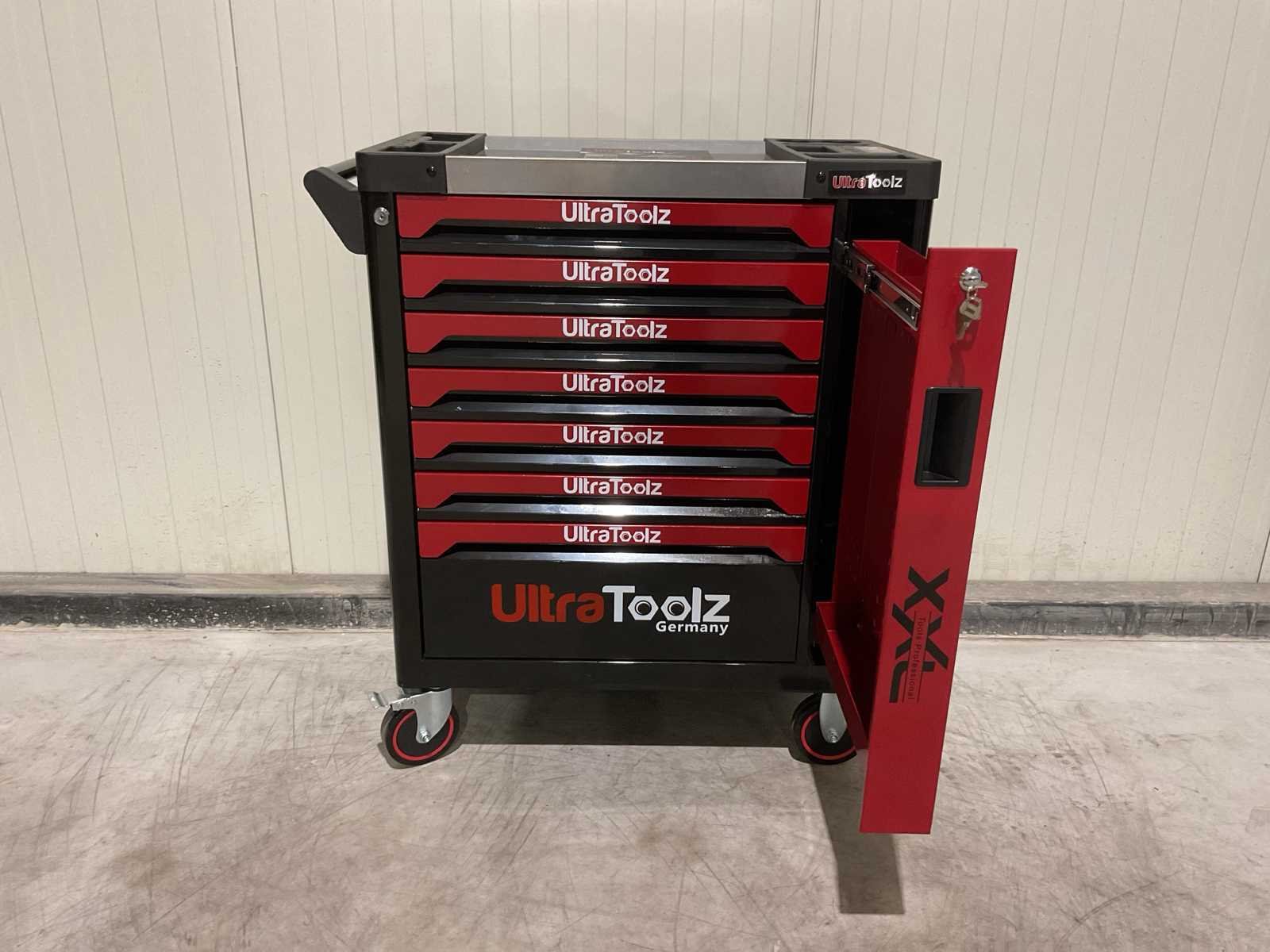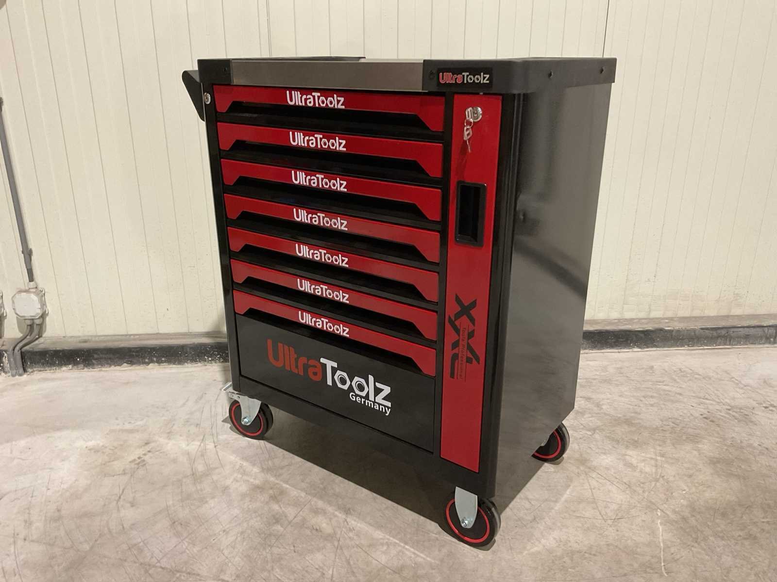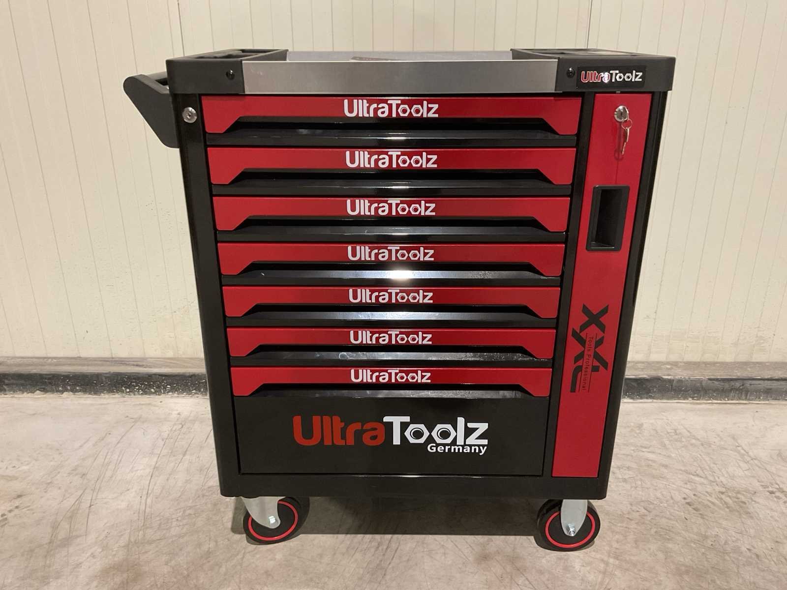 Voorzien van 7 lades waarvan 7 gevuld met gereedschap; zij lade; professioneel chroom-vanadium gereedschap; heavy duty gereedschapswagen; stevig werkblad; 4 wielen; stevig handvat; ongebruikt in doos (transport afmetingen 80x50x85 cm) Merk: UltraToolz Type: Germany 7/7 pro Bouwjaar: 2025 Aantal laden: 7 Met inhoud: true Eigen gewicht: 80kg Totale afmeting L: 800mm Totale afmeting Breedte: 500mm Totale afmeting Hoogte: 850mm