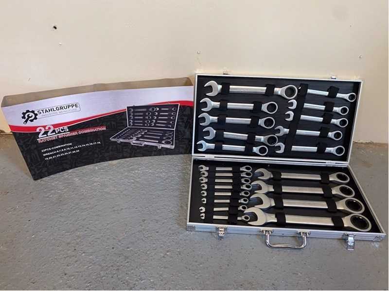 Voorzien van steek met ringratel sleutel set; maten 6, 7, 8, 9, 10, 11, 12, 13, 14, 15, 16, 17, 18, 19, 20, 21, 22, 23, 24, 27, 30, 32; ongebruikt in verpakking Merk: Stahlgruppe Set: true Delig: 22 Bouwjaar: 2024 Type: 22 delig