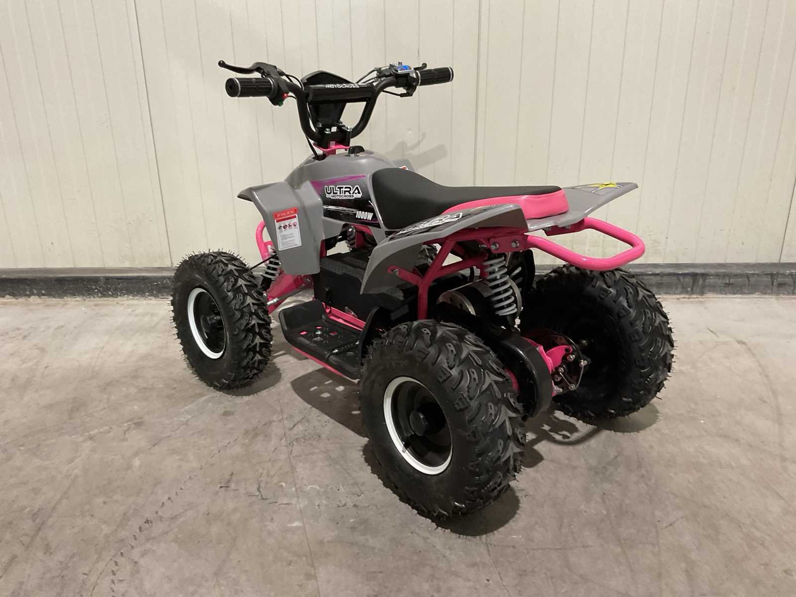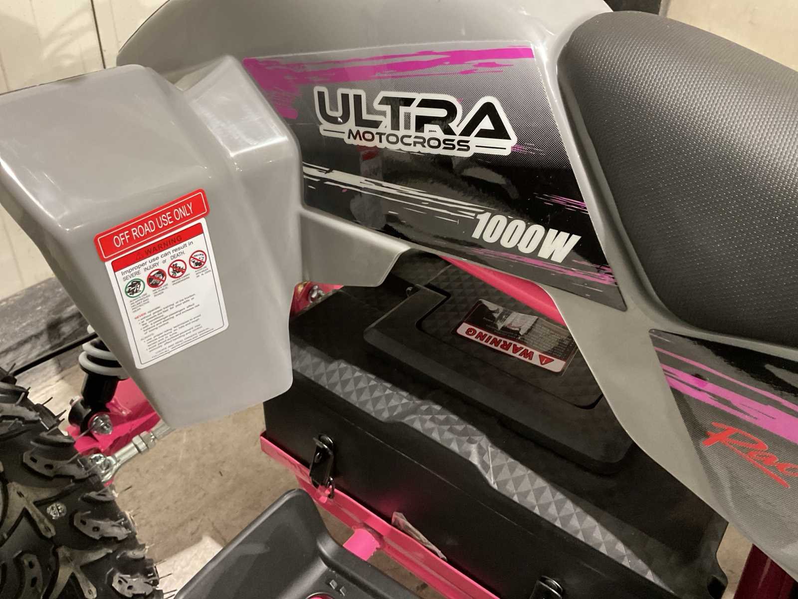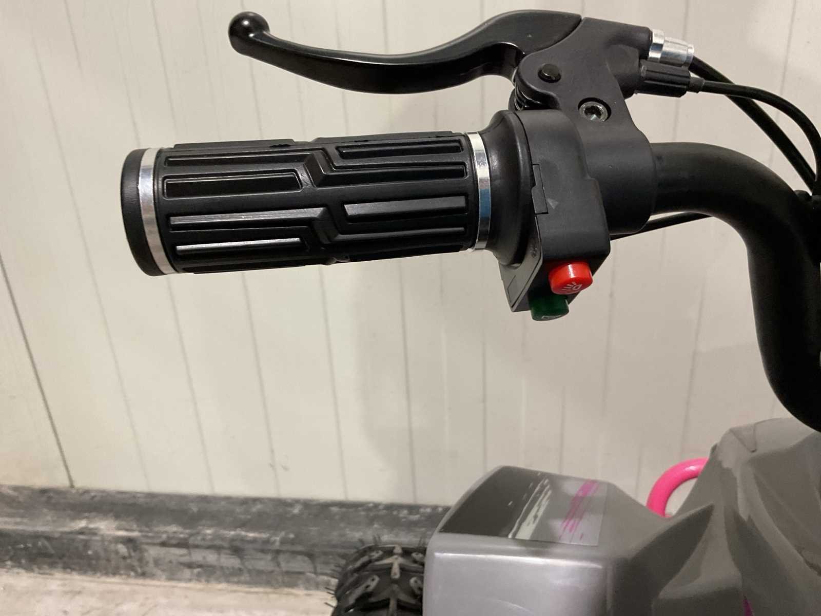 Voorzien van Krachtige 1000W motor; 36V accu; Snelheidsregelaar met 2 standen (10, 25 km/h); Achteruitschakelaar; Verlichting; Schijfremmen voor & achter; Ongebruikt Merk: Ultra Motocross Model: MA05E RZ Product type: 1000W Kleur: Grijs/Roze