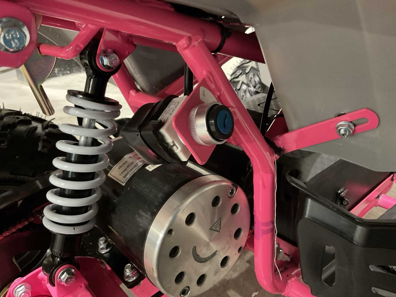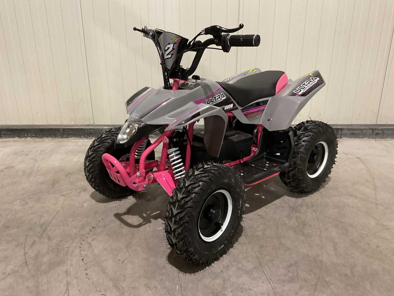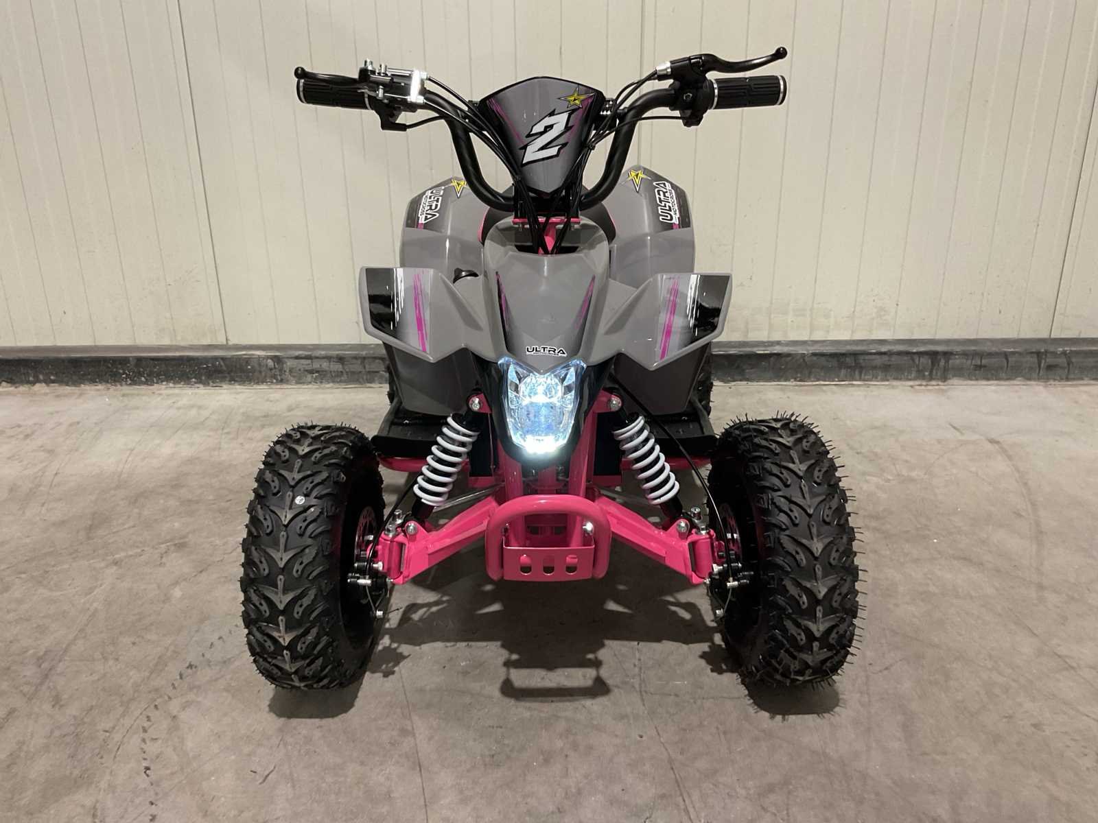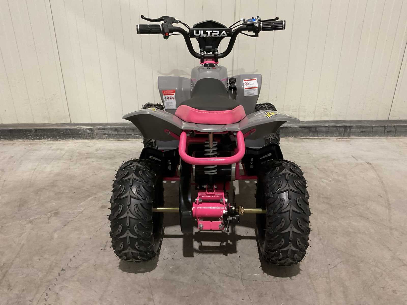 Voorzien van Krachtige 1000W motor; 36V accu; Snelheidsregelaar met 2 standen (10, 25 km/h); Achteruitschakelaar; Verlichting; Schijfremmen voor & achter; Ongebruikt Merk: Ultra Motocross Model: MA05E RZ Product type: 1000W Kleur: Grijs/Roze