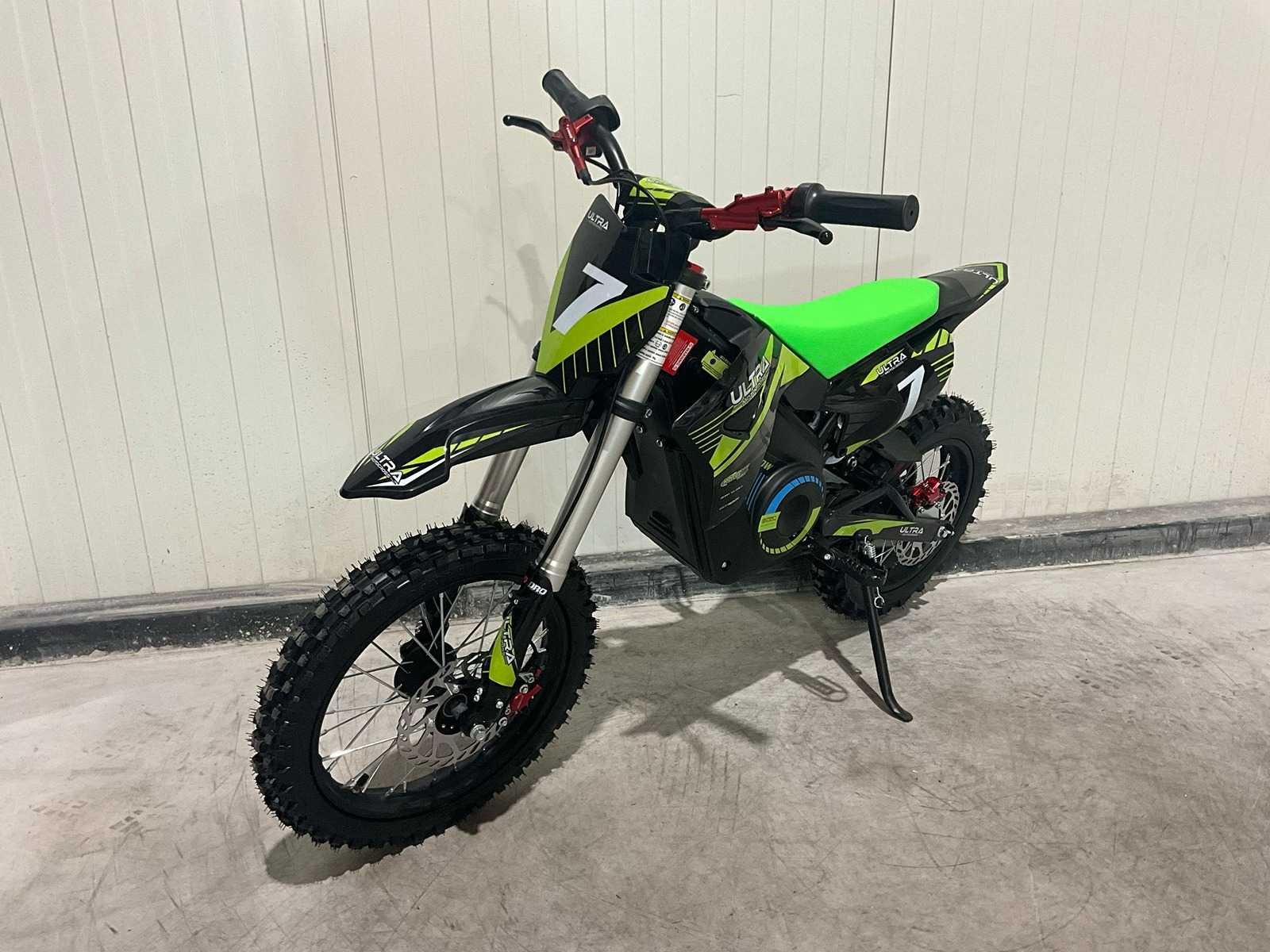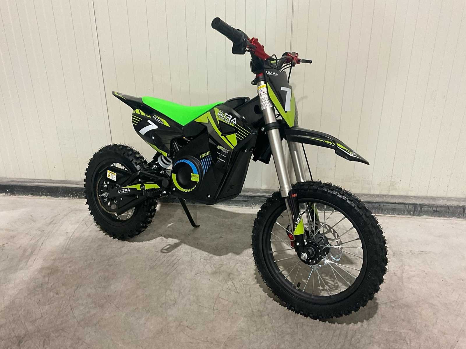 Voorzien van Accu: 48V13Ah lithium; Transmissie: intelligente controller, instelbaar in 2 functies; Gasrespons instelbaar van 0,2S tot 1,0S; Maximale snelheid instelbaar van 10 km/u - 55 km/u (1800W); Eindaandrijving: voor 10T / achter 76T; Actieradius per volle lading (13Ah lithium accu): ~24 km; Velg & banden: Velg met stalen spaken, voor 14" en achter 12"; Band: voor 2,75-14" / achter 3,00-12"; Max. Snelheid: 55 km/u (1800 W); Max. draagvermogen: 65 kg; Remsysteem: mechanische rem/schijf voor en achter (Ø 180 mm); Vering: hydraulische upside-down vork en monoshock achter; Afmetingen (L*B*H): 1470*640*920 mm; Wielbasis: 1010 mm; Zithoogte: 680 mm; Minimale bodemvrijheid: 300 mm; Gewicht: 38 kg; Ongebruikt in doos (Transport afmetingen .. x .. x .. ) Merk: Ultra Motocross Model: ULD01 GR Type: 1800W 48v Brandstof: Electrisch Gewicht: 38kg Kleur: Groen Bouwjaar: 2025