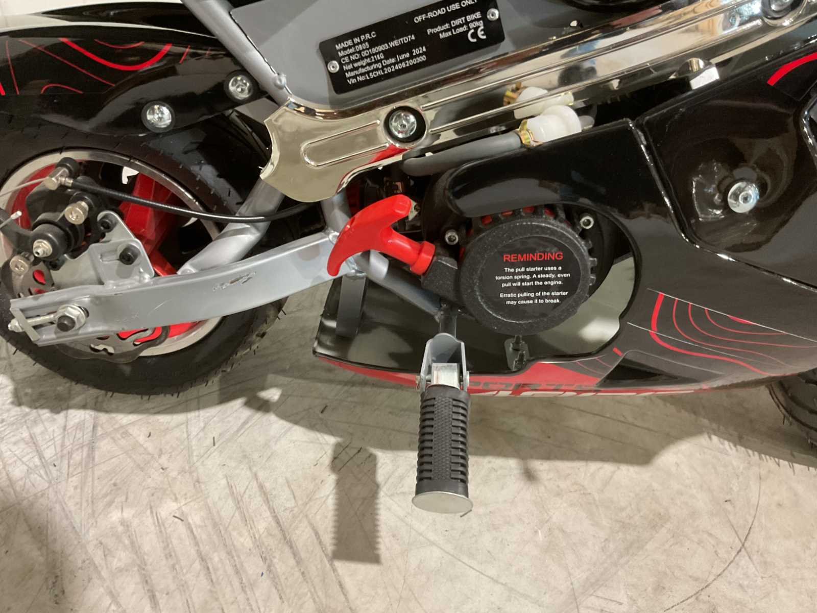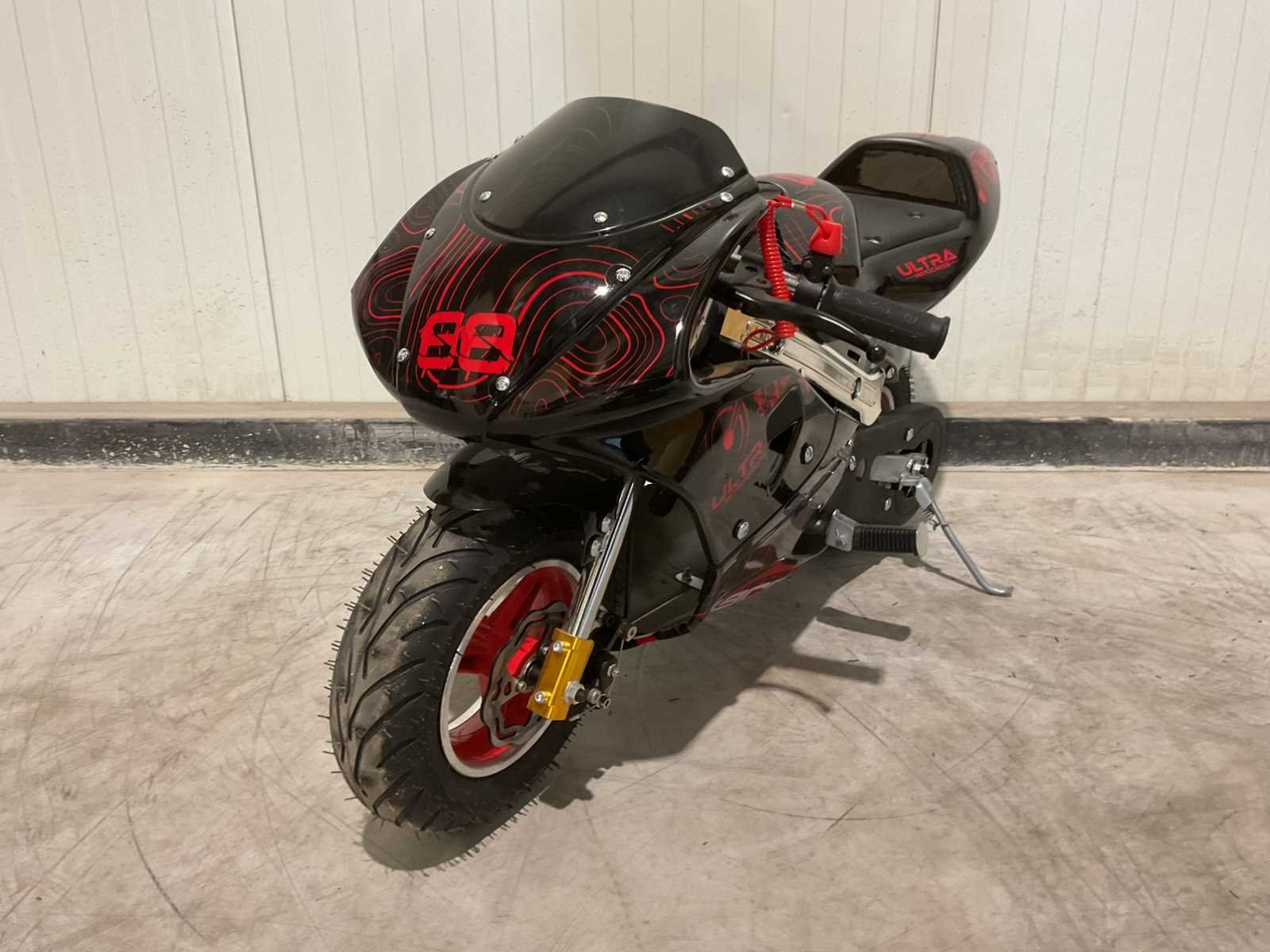 Voorzien van 49cc motor; 2 takt; 3,5 HP; schijfremmen; bandenmaat 6,5” inch; ongebruikt in doos (transport afmetingen 105x35x55 cm) Merk: Ultra Motocross Type: Pocket bike mini Cilinderinhoud: 49cc Gewicht: 24kg Transmissie: Automaat Aantal sleutels: 2 Bouwjaar: 2025