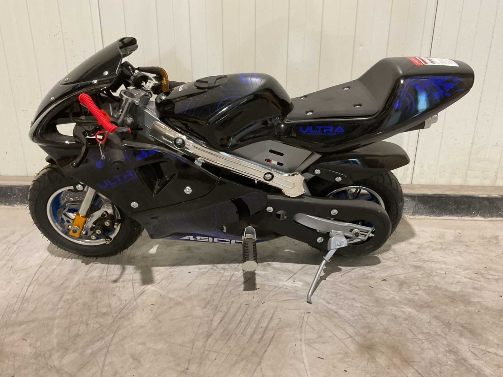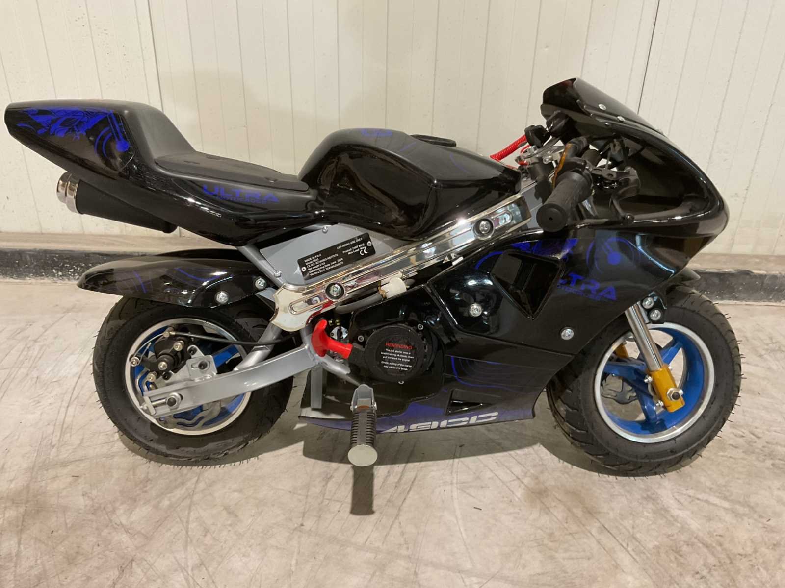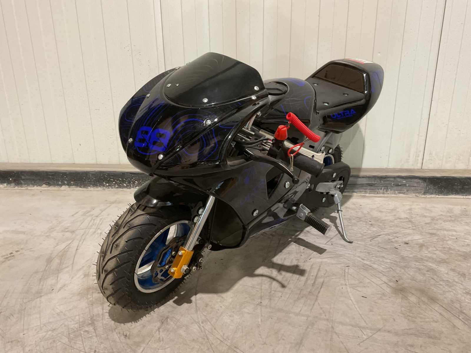 Voorzien van 49cc motor; 2 takt; 3,5 HP; schijfremmen; bandenmaat 6,5” inch; ongebruikt in doos (transport afmetingen 105x35x55 cm) Merk: Ultra Motocross Type: Pocket bike mini Cilinderinhoud: 49cc Gewicht: 24kg Transmissie: Automaat Aantal sleutels: 2 Bouwjaar: 2025