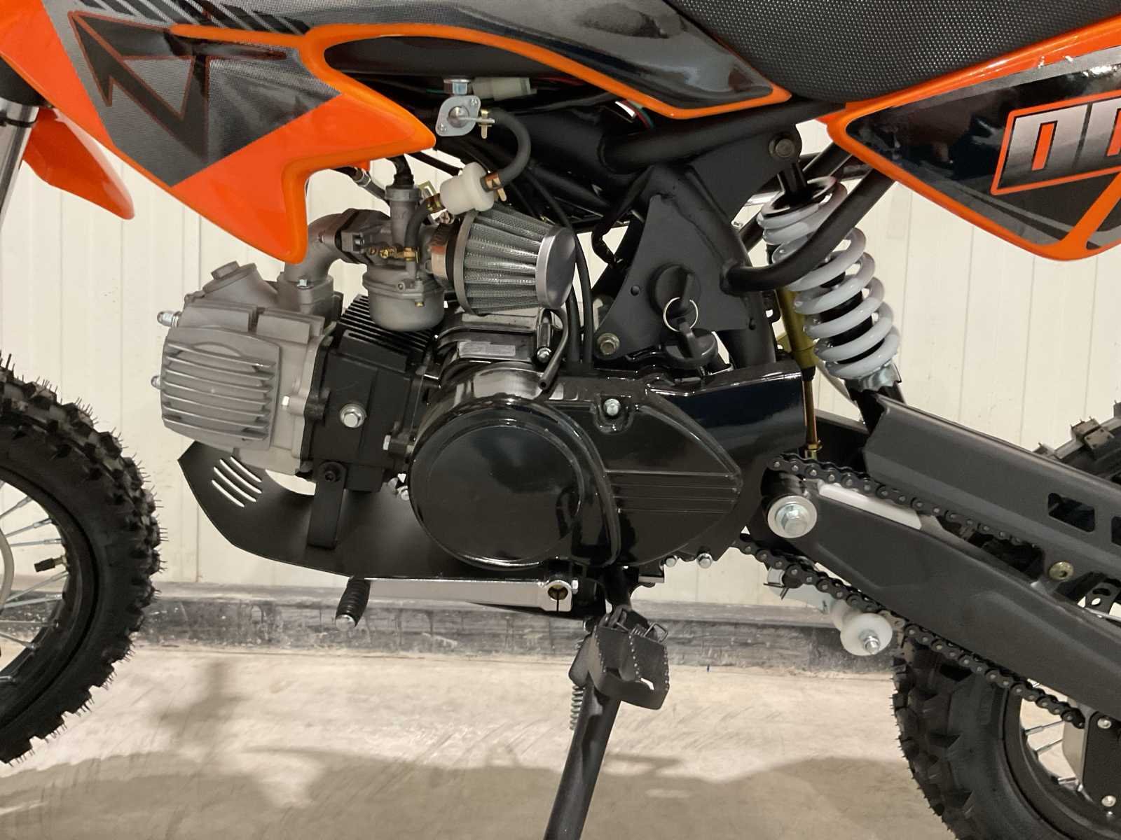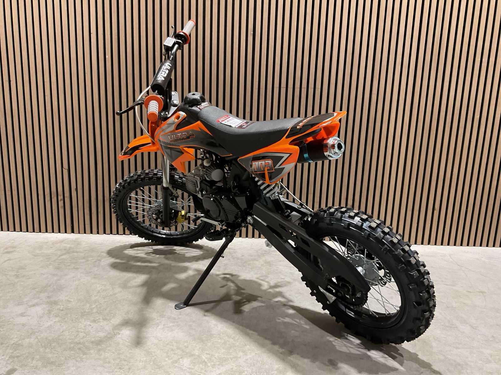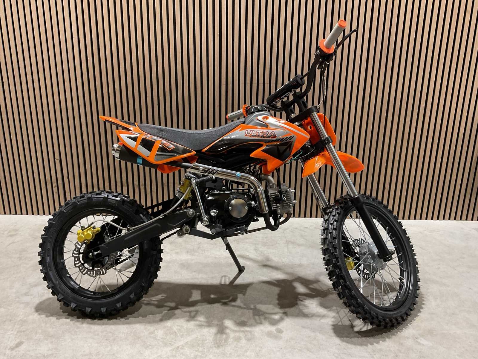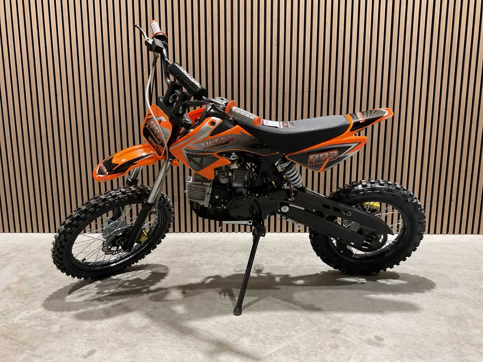 Voorzien van 110cc motor; Manuele koppeling; kickstart; Wiel/velg: V: 90/100-14 (14") A: 70/100-17 (17"); Hydraulische schijfrem; olieschokdemper; Enkele stalen uitlaatpijp; Maximale snelheid: 70 km/u; Ongebruikt in doos (Transport verpakking: 1295 x 375 x 620 mm) Merk: Ultra Motocross Model: DB001 OR Type: 110CC Cilinderinhoud: 110cc Kleur: Oranje zwarte zadel Transmissie: Manuele Bouwjaar: 2025