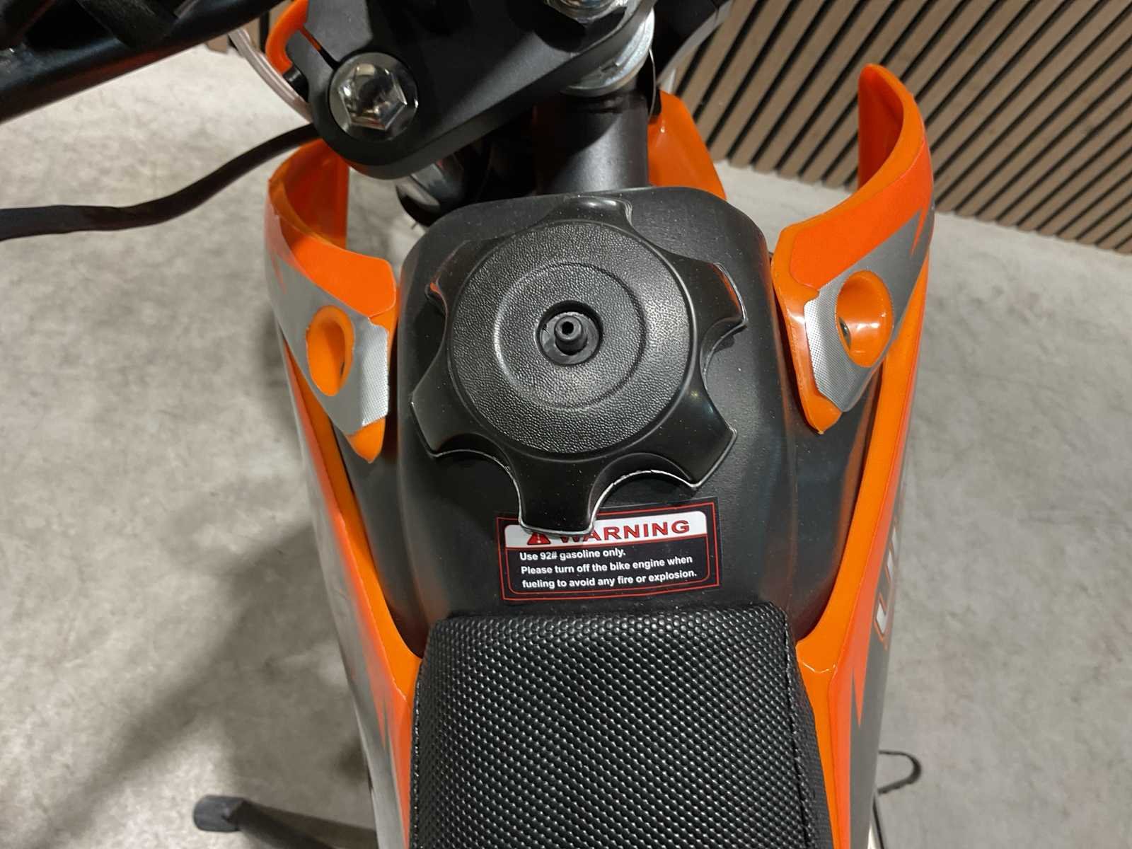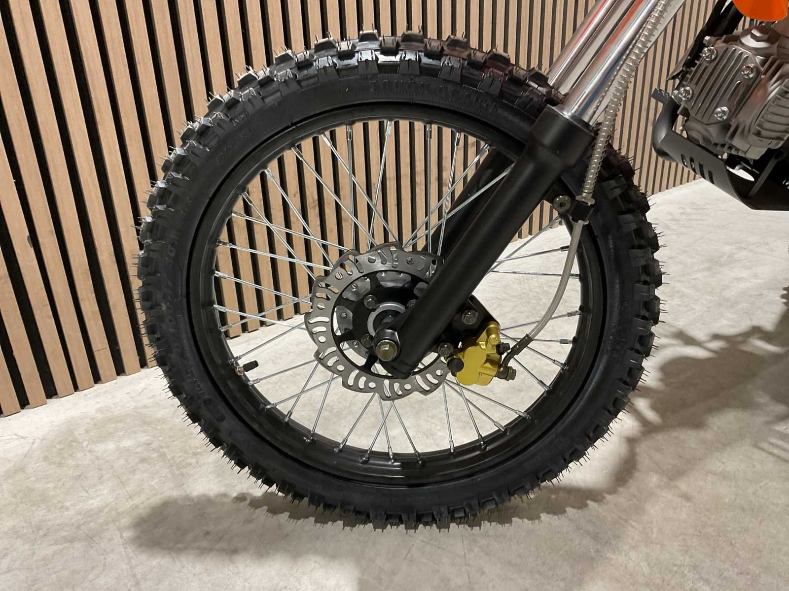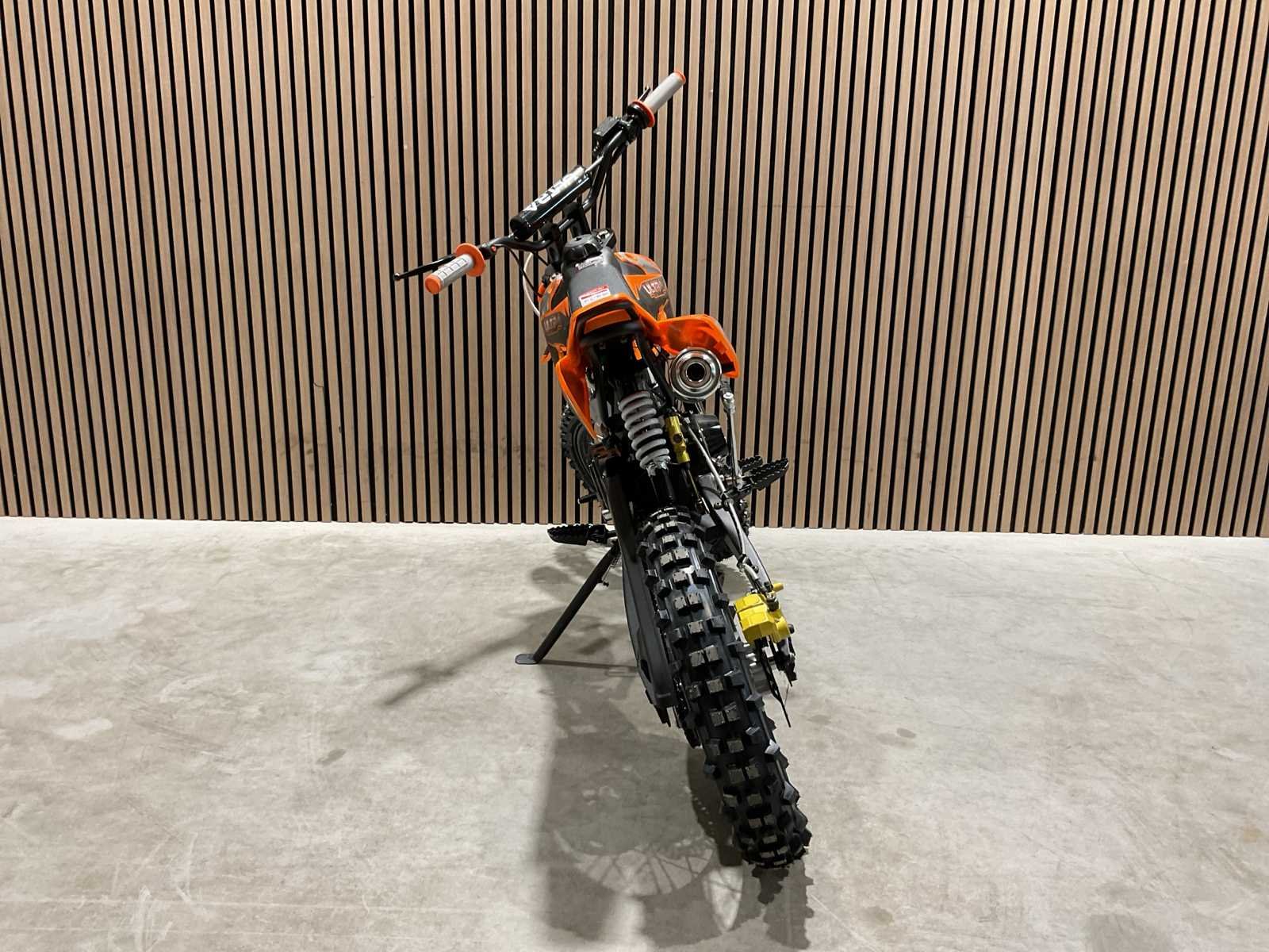 Voorzien van 110cc motor; Manuele koppeling; kickstart; Wiel/velg: V: 90/100-14 (14") A: 70/100-17 (17"); Hydraulische schijfrem; olieschokdemper; Enkele stalen uitlaatpijp; Maximale snelheid: 70 km/u; Ongebruikt in doos (Transport verpakking: 1295 x 375 x 620 mm) Merk: Ultra Motocross Model: DB001 OR Type: 110CC Cilinderinhoud: 110cc Kleur: Oranje zwarte zadel Transmissie: Manuele Bouwjaar: 2025