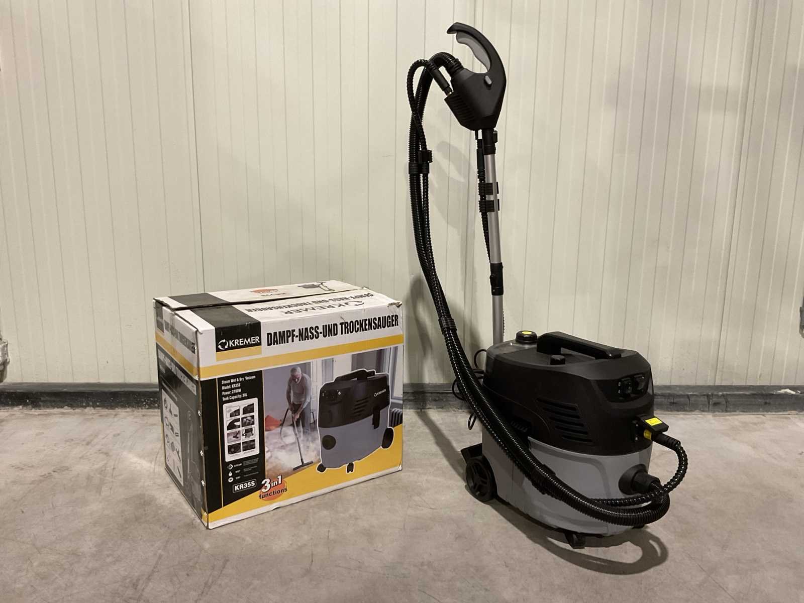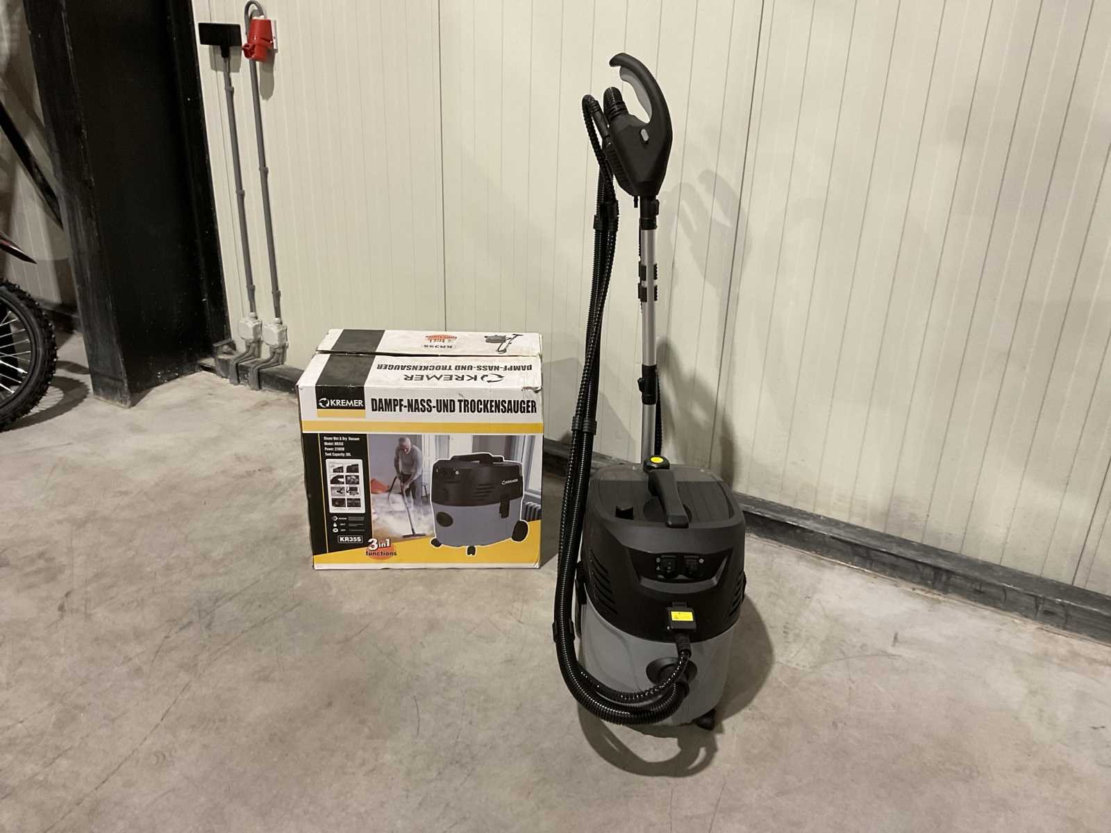Voorzien van nat en droog functie; bescherming tegen oververhitting; Nat- en droog stofzuiger; Stoom functie; Sproei functie; Inhoud 30 Liter; Kunststof Ketel; 2100W; 2 Zwenkwielen; 2 Starre wielen spray en zuig functie; Ongebruikt in doos (Afmeting transport verpakking 615x435x545 mm lxbxh, gewicht 13.8 kg) Merk: Kremer Type: KR35S Bouwjaar: 2025 Capaciteit.: 30l/hr Mobiel: true Vermogen: 2100kW Aansluiting: 220V Eigen gewicht: 13.8kg Totale afmeting L: 615mm Totale afmeting Breedte: 435mm Totale afmeting Hoogte: 545mm