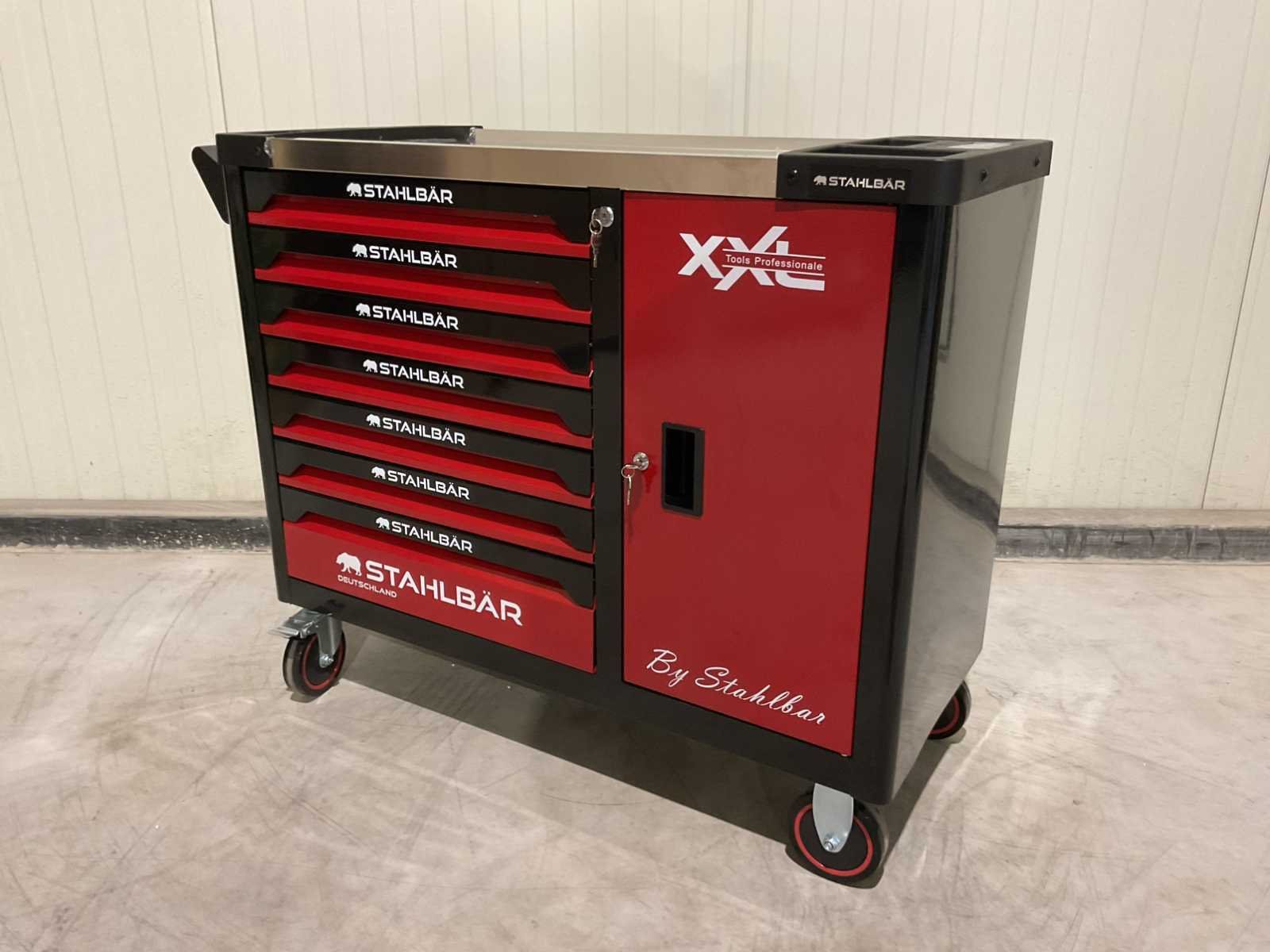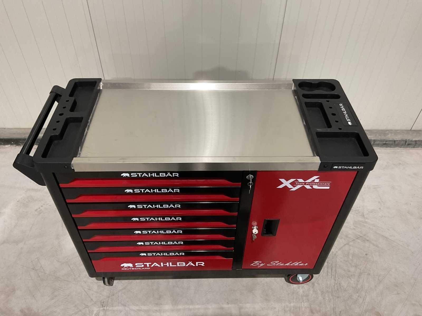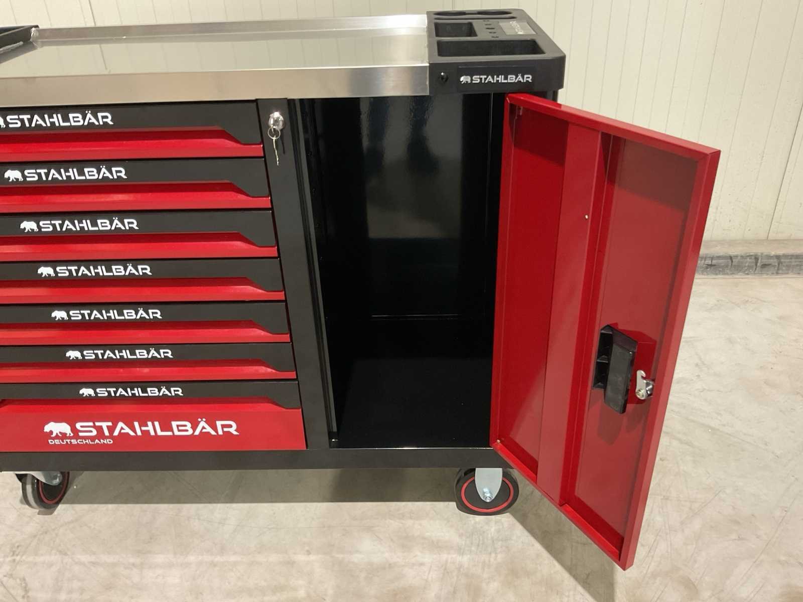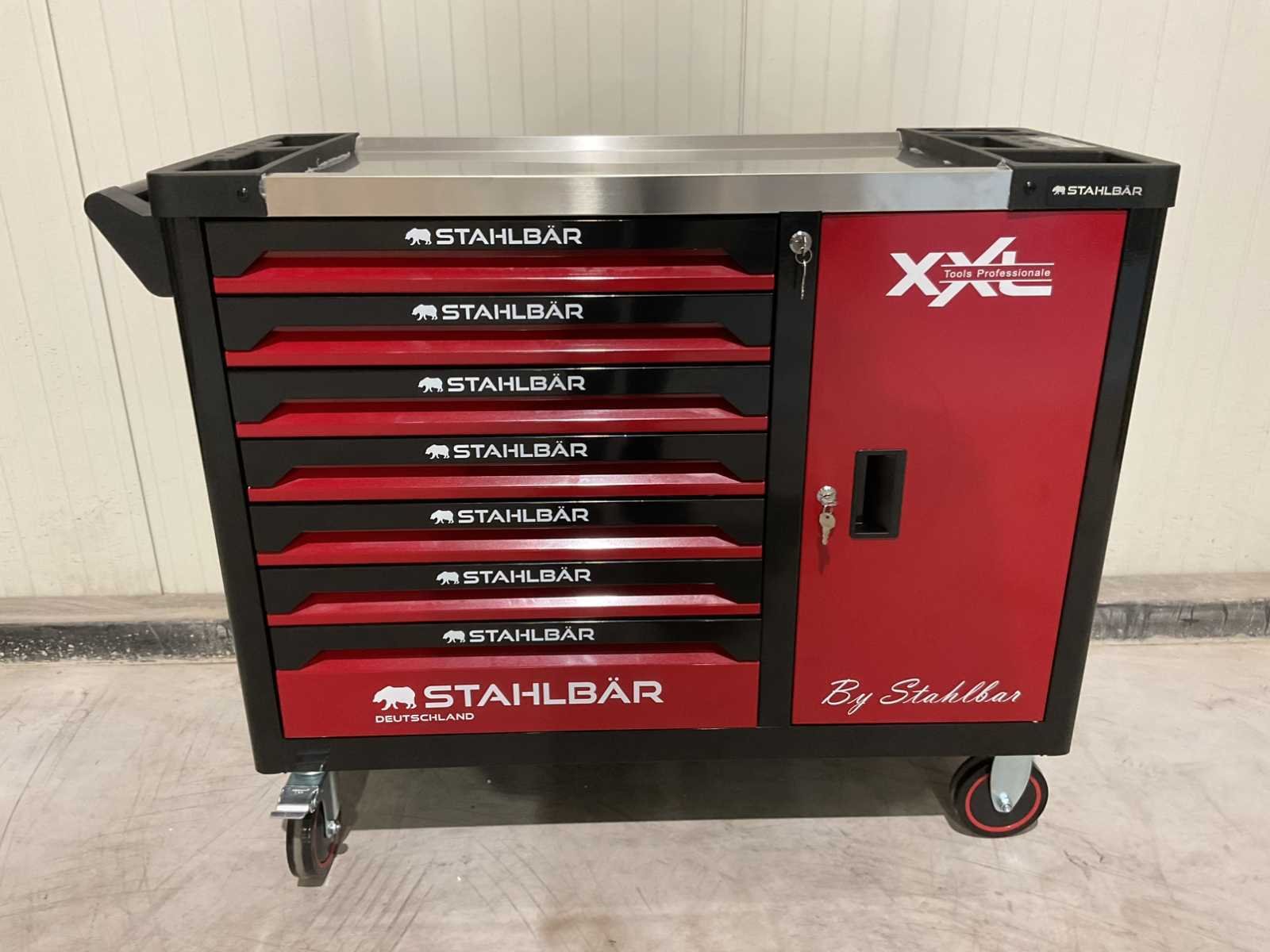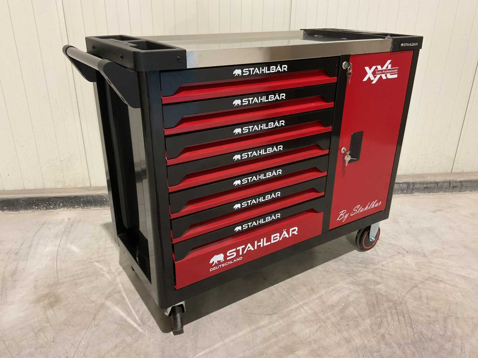 Voorzien van 7 lades waarvan 7 gevuld met gereedschap; zijdeur; professioneel chroom-vanadium gereedschap; heavy duty gereedschapswagen; 4 wielen; stevig handvat; ongebruikt in doos (transport afmetingen 110x50x80 cm) Merk: Stahlbär Type: Deutschland jumbo ZW/RD Bouwjaar: 2025 Aantal laden: 7 Met inhoud: true Eigen gewicht: 75kg Totale afmeting L: 1100mm Totale afmeting Breedte: 500mm Totale afmeting Hoogte: 800mm