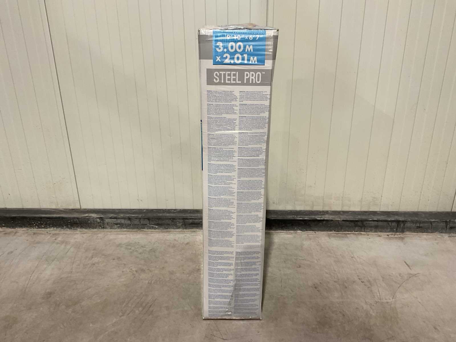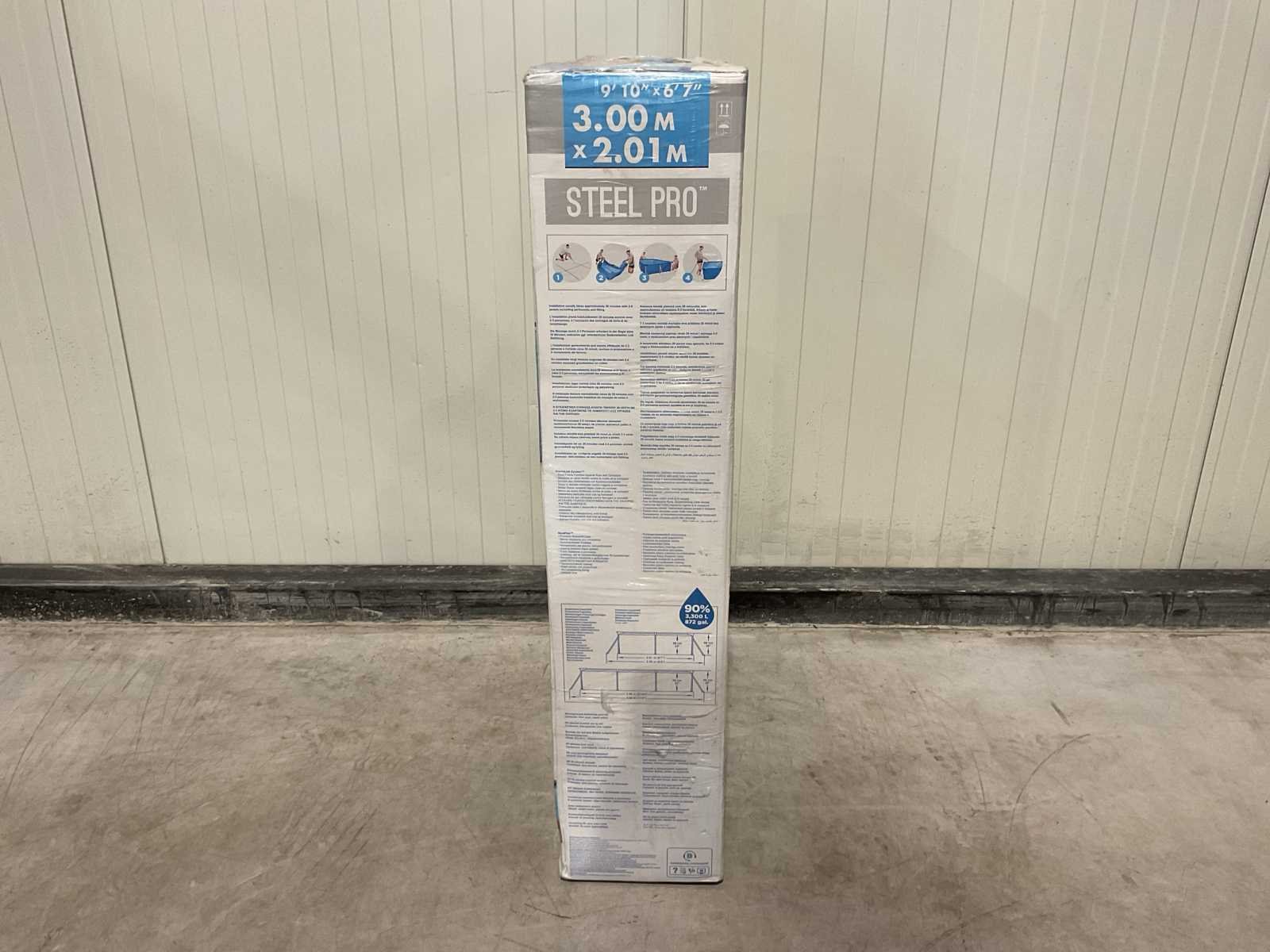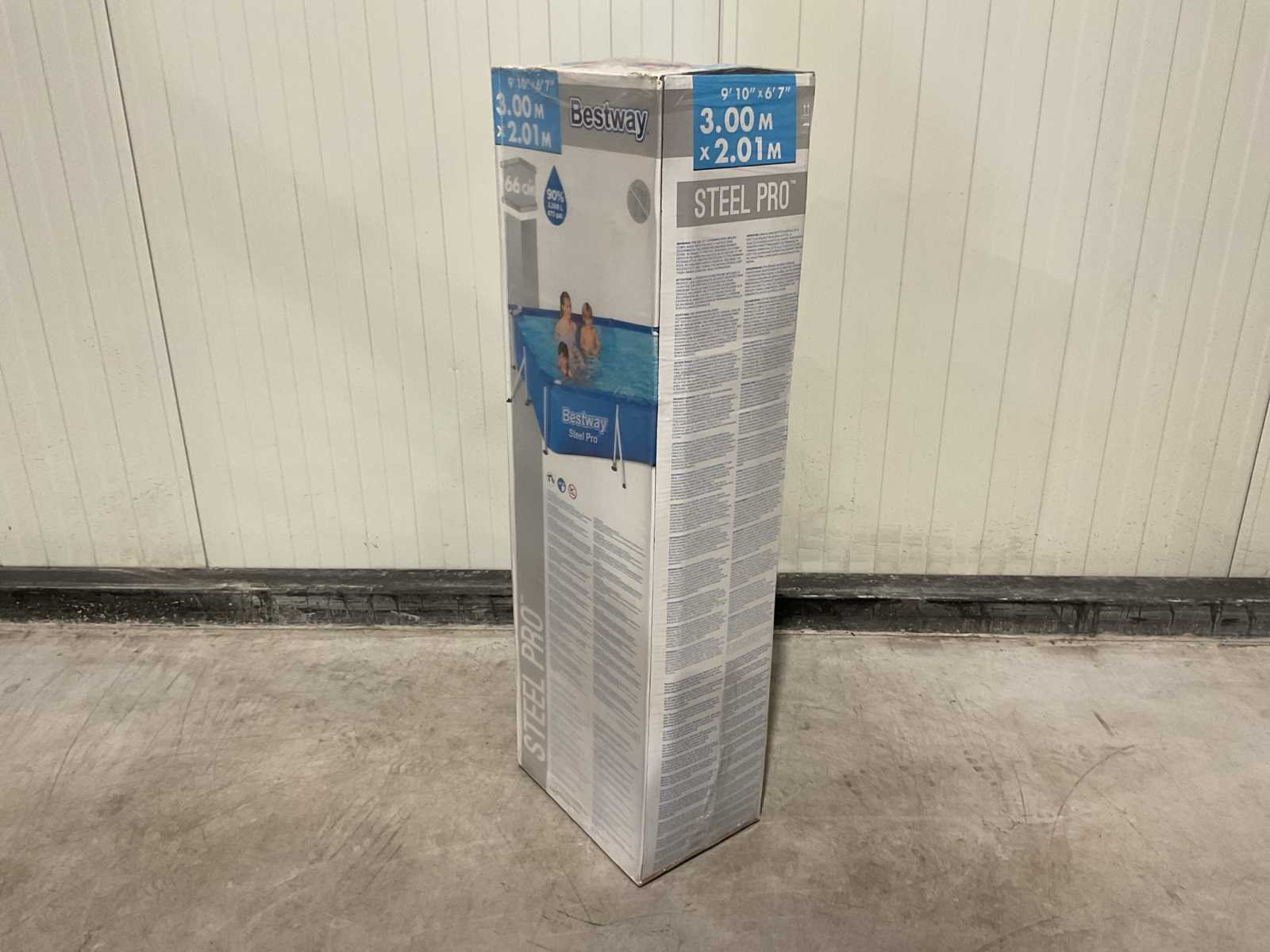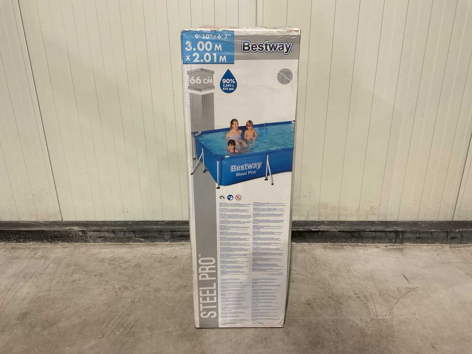 Voorzien van Opzetzwembad; 3-laags PVC met gerasterde polyester tussenlaag; Frame gepoedercoat staal; Vorm: Rechthoek; Inhoud 3300 liter; Aanbevolen waterdiepte (cm) 51; 3 persoons; Pompaansluiting (mm) 32; Lengte (cm) 300; Breedte (cm) 201; Buitenafmeting lxb (cm) 355x255; Hoogte (cm) 66; Dikte liner wand (mm) 0,56; Dikte liner bodem (mm) 0,50; Reparatieset; Ongebruikt in doos Merk: Bestway Model: 56404 steel pro Product type: 3M Kleur: Blauw Gewicht: 25.5kg Lengte: 35.6cm Breedte: 34cm Hoogte: 87.6cm