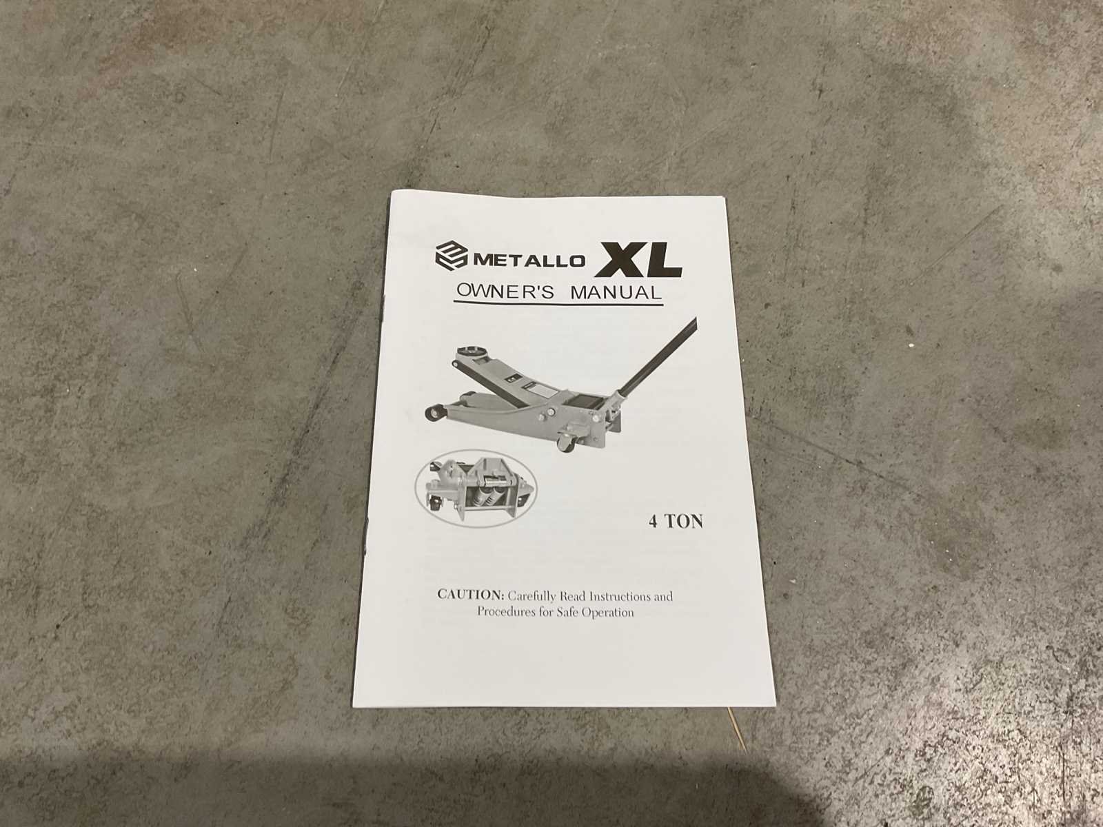 Voorzien van garagekrik maximale belasting van 4 ton; Kleur zwart; Max. werkhoogte 50 cm; Maximaal draagvermogen 4000 kg; Maximale hoogte 500; Min. werkhoogte 7.5; Minimale hoogte 7.5 cm Merk: Metallo Type: XL 4 TON Bouwjaar: 2025 Capaciteit.: 4t Eigen gewicht: 33.6kg Totale afmeting L: 78mm Totale afmeting Breedte: 39mm Totale afmeting Hoogte: 190mm