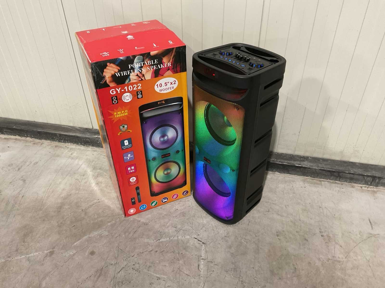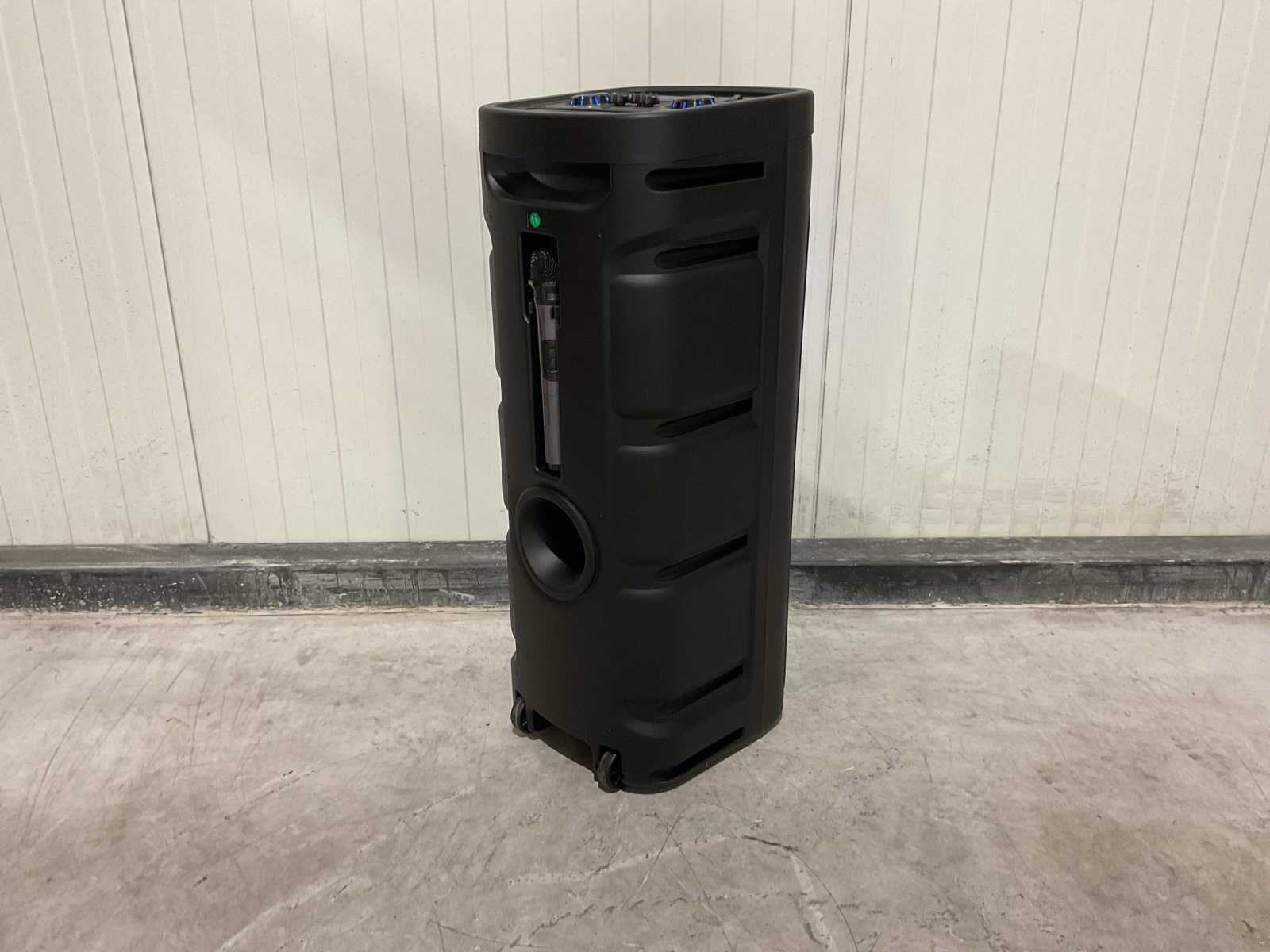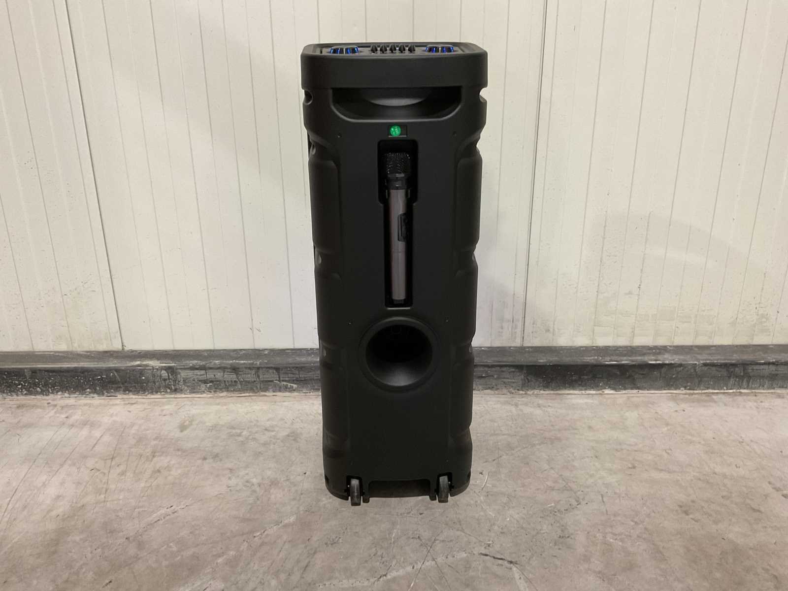 Voorzien van 2x50w speakers; 10,5”speaker Horns; Aansluitingen: USB, TF card, BT, AUX; Draadloze microfoon; afstandsbediening; Party verlichting; meerdere microfoon aansluitingen; Ongebruikt in doos. Merk: Portable wireless speaker Type: GY-1022 Bouwjaar: 2025 Vermogen: 50W Aansluiting: 13.5V Totale afmeting L: 345mm Totale afmeting Breedte: 320mm Totale afmeting Hoogte: 730mm Eigen gewicht: 10kg