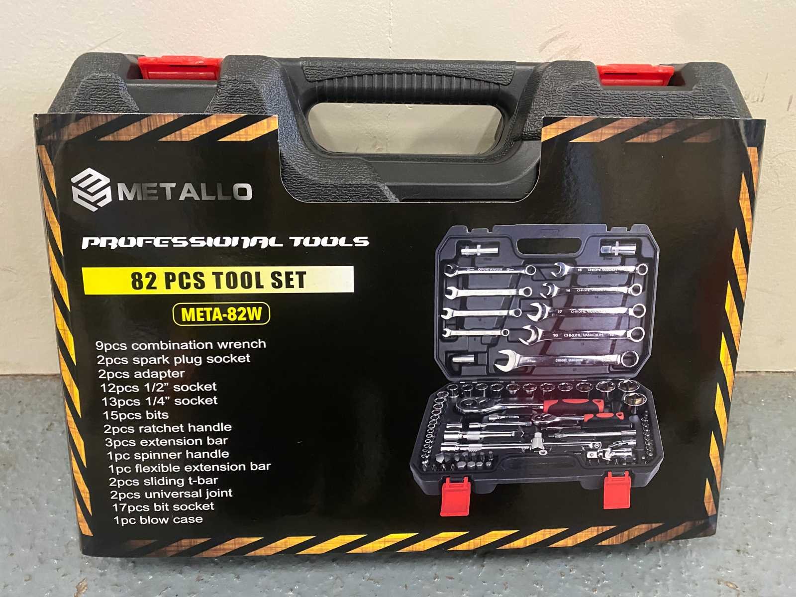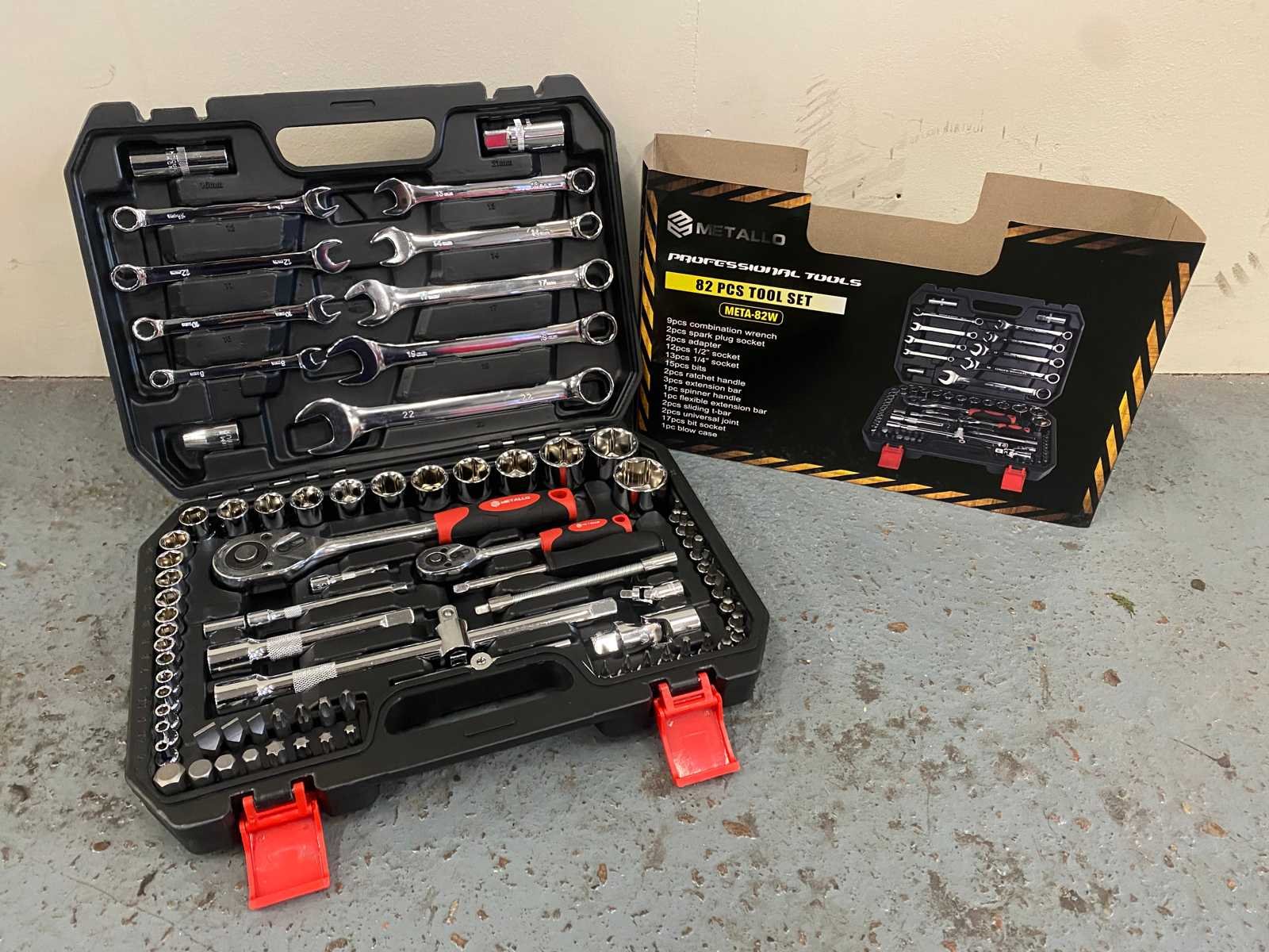 Voorzien van 82 delige gereedschapskoffer; divers professioneel gereedschap; chroom-vanadium; ongebruikt in verpakking Merk: Metallo Type: META-82W Kunststof: true Met inhoud: true