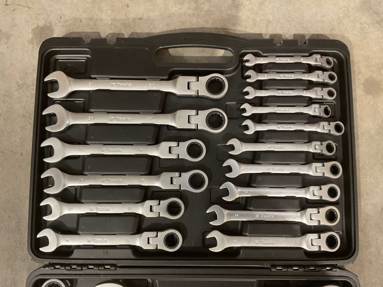 Voorzien van Steek/Ratelringsleutel maten: 6, 7, 8, 9, 10, 11, 12, 13, 14, 15, 16, 17, 18, 19, 20, 21, 22, 23, 24, 27, 30, 32mm; Kunstof koffer; Ongebruikt (Transport Afmeting 500 x 70 x 360mm, Gewicht: 8,84 kg) Merk: F Tools Professional Set: true Delig: 22 Bouwjaar: 2025 Type: 22PCS Flexible Gear Wrench