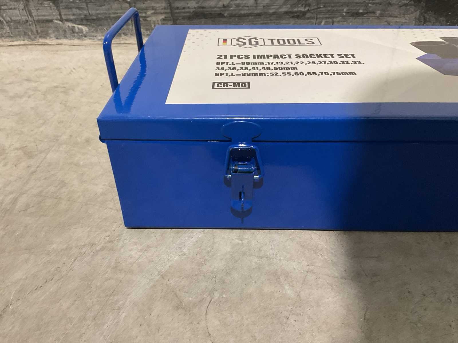Voorzien van Krachtdoppenset; 3/4" maten: 17, 19, 21, 22, 24, 27, 30, 32, 33, 34, 36, 38, 41, 46, 50 mm; 1" doppen: 52, 55, 60, 65, 70, 75 mm; Ongebruikt in doos (gewicht inclusief verpakking 22,90 kg) Merk: SG Tools Delig: 21 Krachtdop uitvoering: true Type: 21 PCS impact Socket Set1 Bouwjaar: 2025