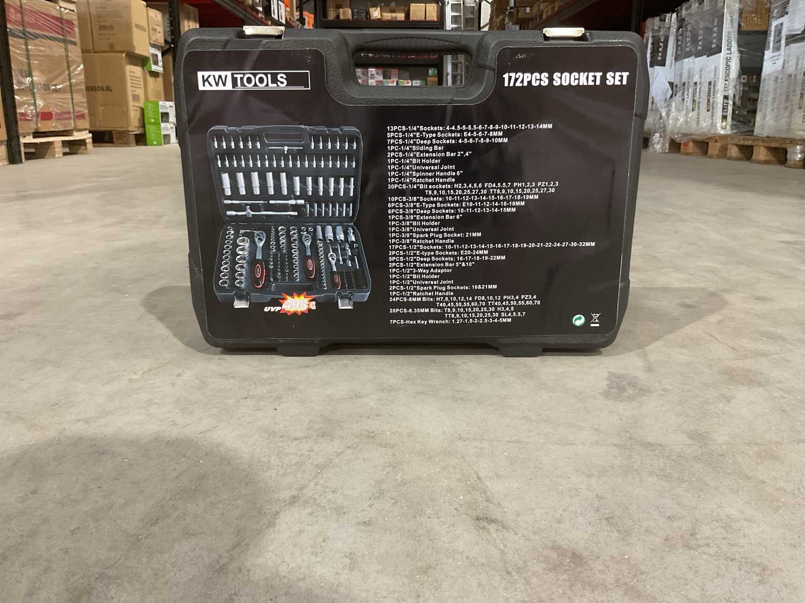 13 stuks 1/4 " Socket: 4,4,5,5,5,5,6,7,8,9,10,11,12,13,14 mm; 7 stuks 1/4 " diepe wandcontactdoos 4,5,6,7,8,9,10 mm; 5 stuks 1/4 " E-doppen E4, E5, E6, E7, E8; 2 stuks 1/4 " verlengstang 2 'en 4"; 1 stuk 1/4 " Sliding T-Bar; 1 stuk 1/4 " universele koppeling; 1 stuk 1/4 " koppeling; 1 stuk 1/4 " Quick Release ratelhendel; 30 stuks 1/4 " Bit-doppen; 10 stuks 3/8 " Doppen 10,11,12,13,14,15,16,17,18,19mm; 6 stuks 3/8 " Sockets 10,11,12,13,14,15; 5 stuks 3/8 " E-doppen E10, E11, E12, E14, E16, E18; 1 stuk 3/8 " Extention Bar 5"; 1 stuk 3/8 " koppeling ;1 stuk 3/8 " Bougie Dop 18 mm; 1 stuk 3/8 " Quick Release Ratchet Hanlde;18 stuks 1/2 " Sockets 10,11,12,13,14,15,16,17,18,19,20,21,22,23,24,27,30,32mm; 5 stuks 1/2 " diepe doppen 16,17,18,19,22 mm; 3 stuks 1/2 " E-doppen E20, E24; 2 stuks 1/2 " Extension Bar 5" & 10 "(met driewegadapter); 1 stuk 1/2 " universele verbinding; 1 stuk 1/2 " koppeling; 2 stuks 1/2 " Bougie Dop 16 mm en 21 mm; 1 stuk 1/2 " Quick Release ratelhendel; 1 stuk Inbussleutel Set 1,1.5,2,2.5,3,4,5mm; 20 stuks 25mm bits in bits houder; 24 stuks 30mm bits; 1 stuk spinnerhandvat; Ongebruikt in doos (Transport afmeting 460 x 95 x 350, Gewicht 8.68 KG) Merk: KW Tools Met koffer: true Delig: 172 Type: 172PCS Socket Set Bouwjaar: 2025