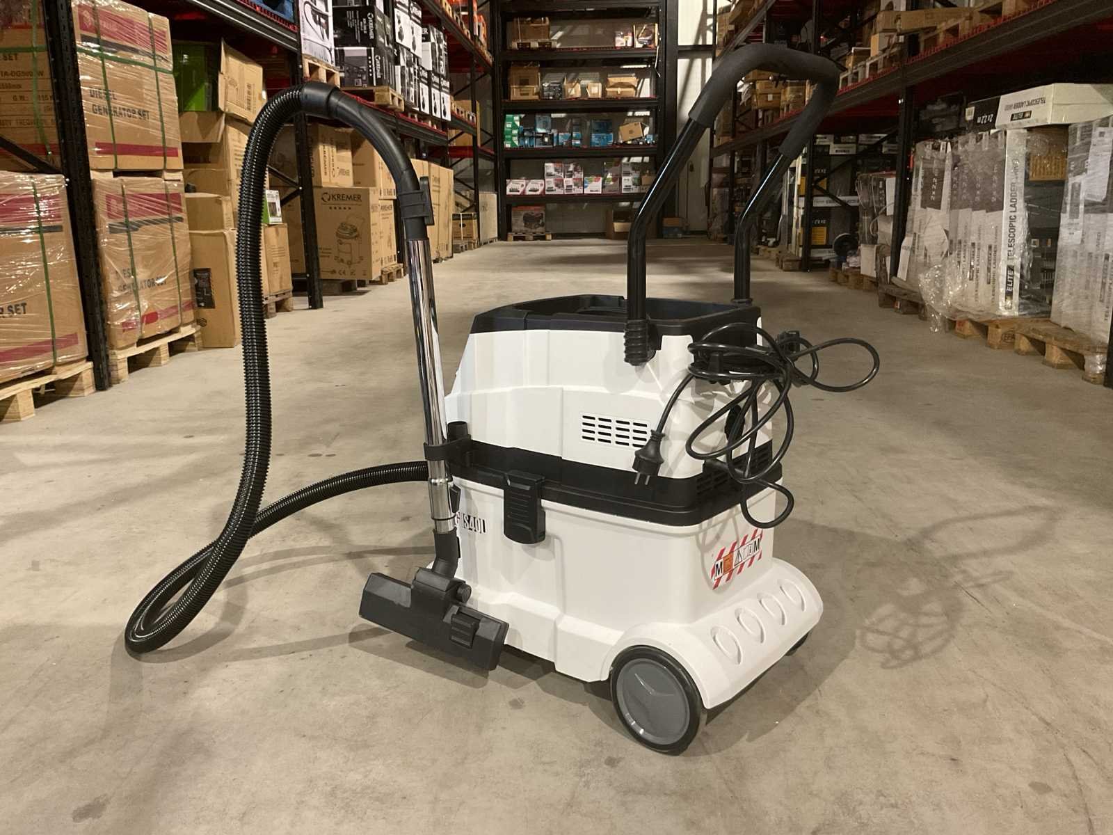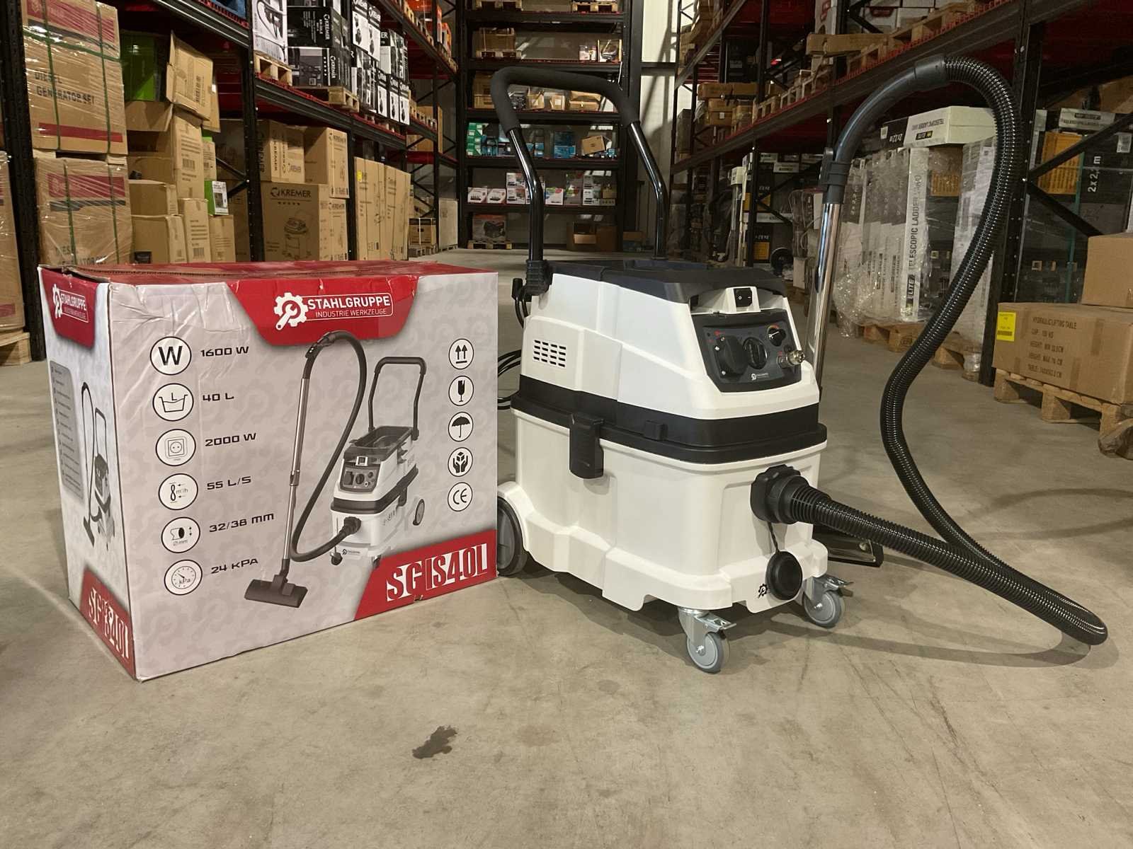 Voorzien van 4 zwenkwielen; 24kPa zuigkracht; 2000W extra stopcontact; Afstandsbediening systeem; Automtische uitschakeling; Compressoraansluiting voor pneumatische apparatuur ; 5M stroomkabel; 1,5m Stofzuiger slang; Opbergruimte voor accessoires; 40ltr tank capaciteit; RVS Tank; ongebruikt in doos (transport afmeting en gewicht 645x385x570 - 20,1kg) Merk: Stahlgruppe Type: SG IS40L Bouwjaar: 2025 Vermogen: 1600W Zakloos: true Nat/droog zuiger: true Stopcontact: true Aansluiting: 220V
