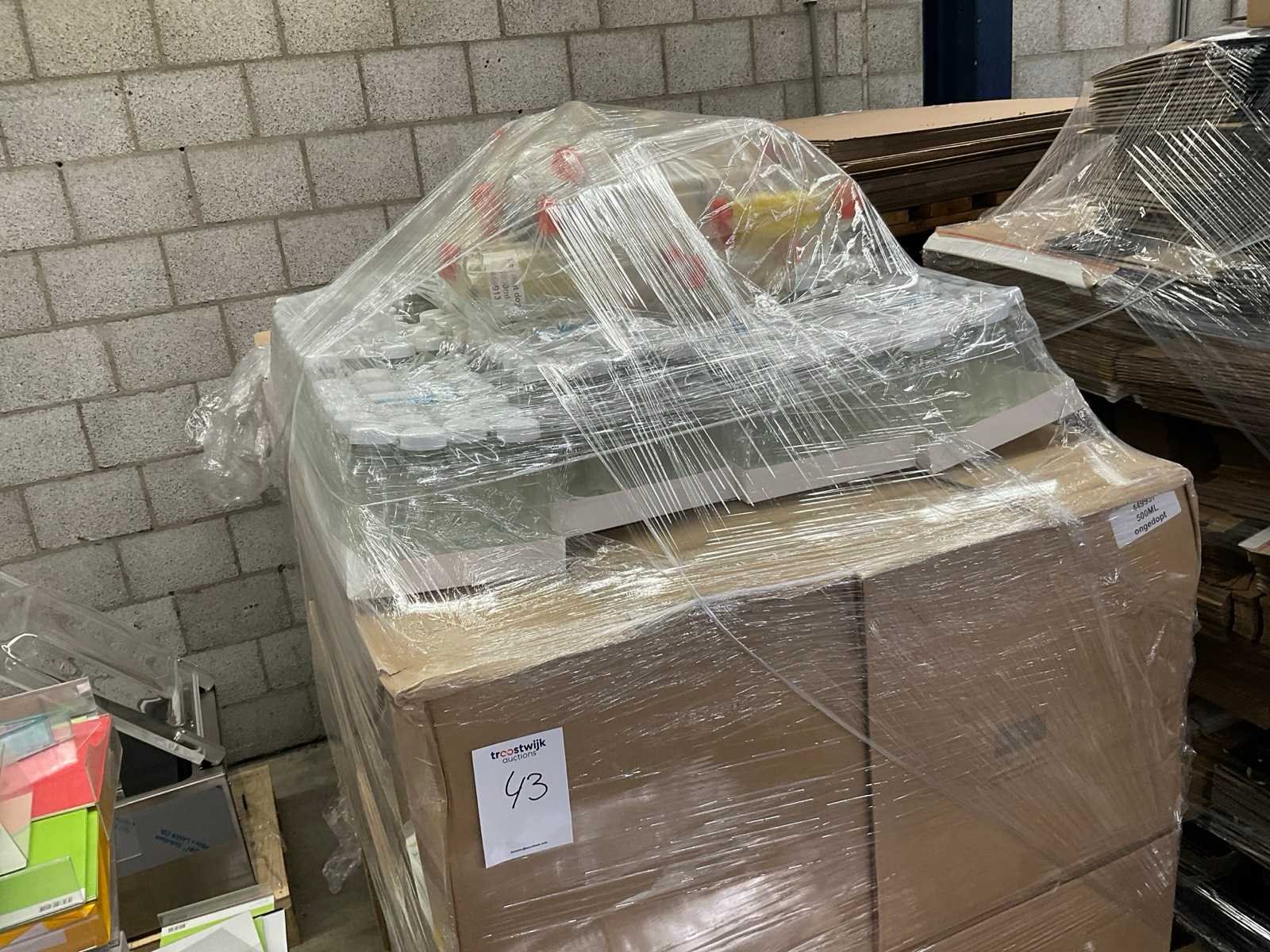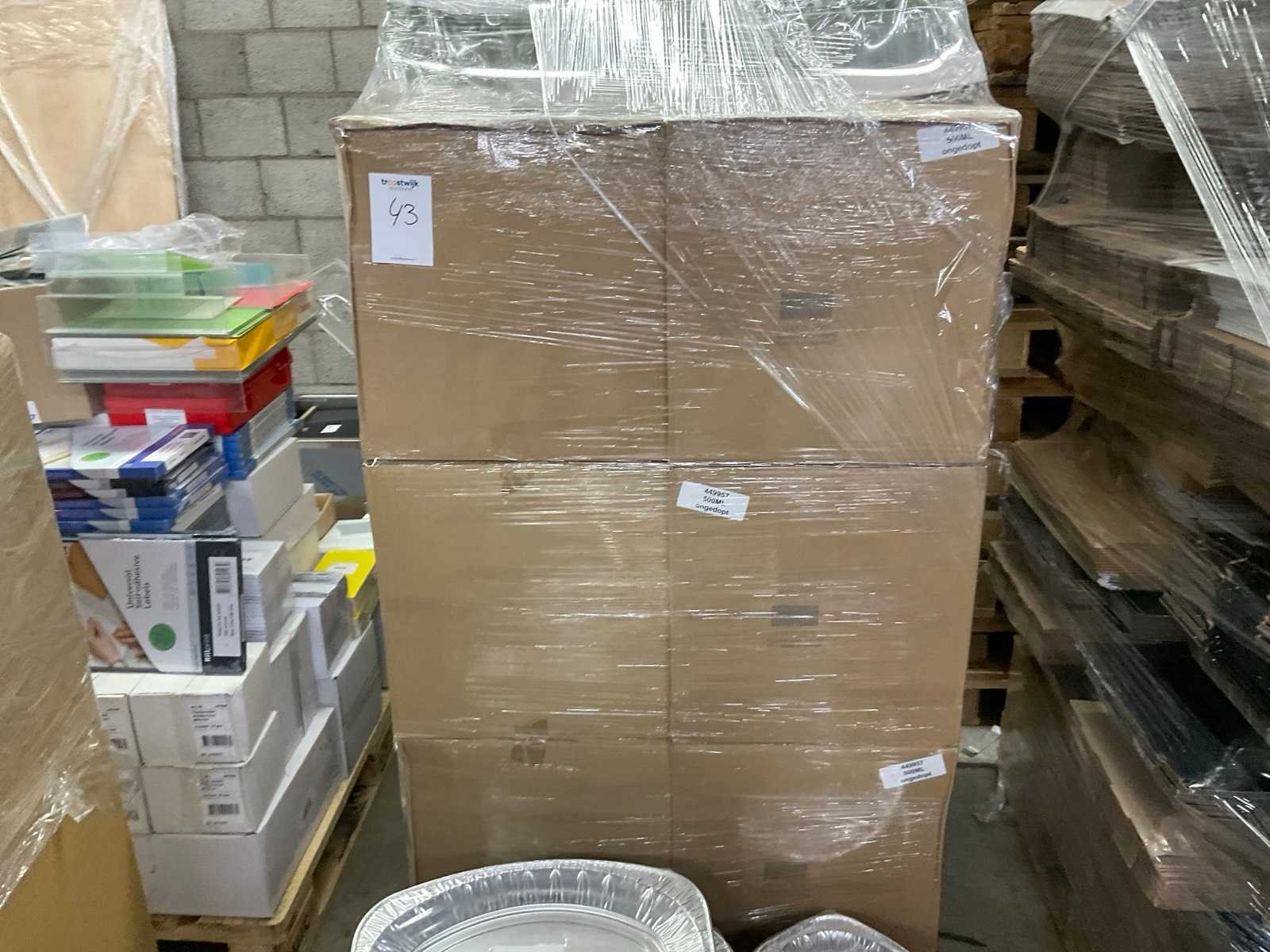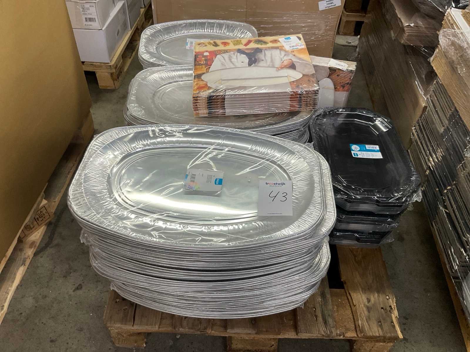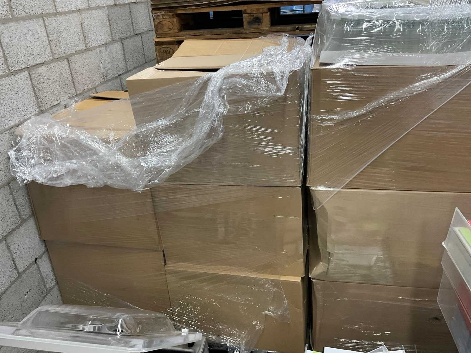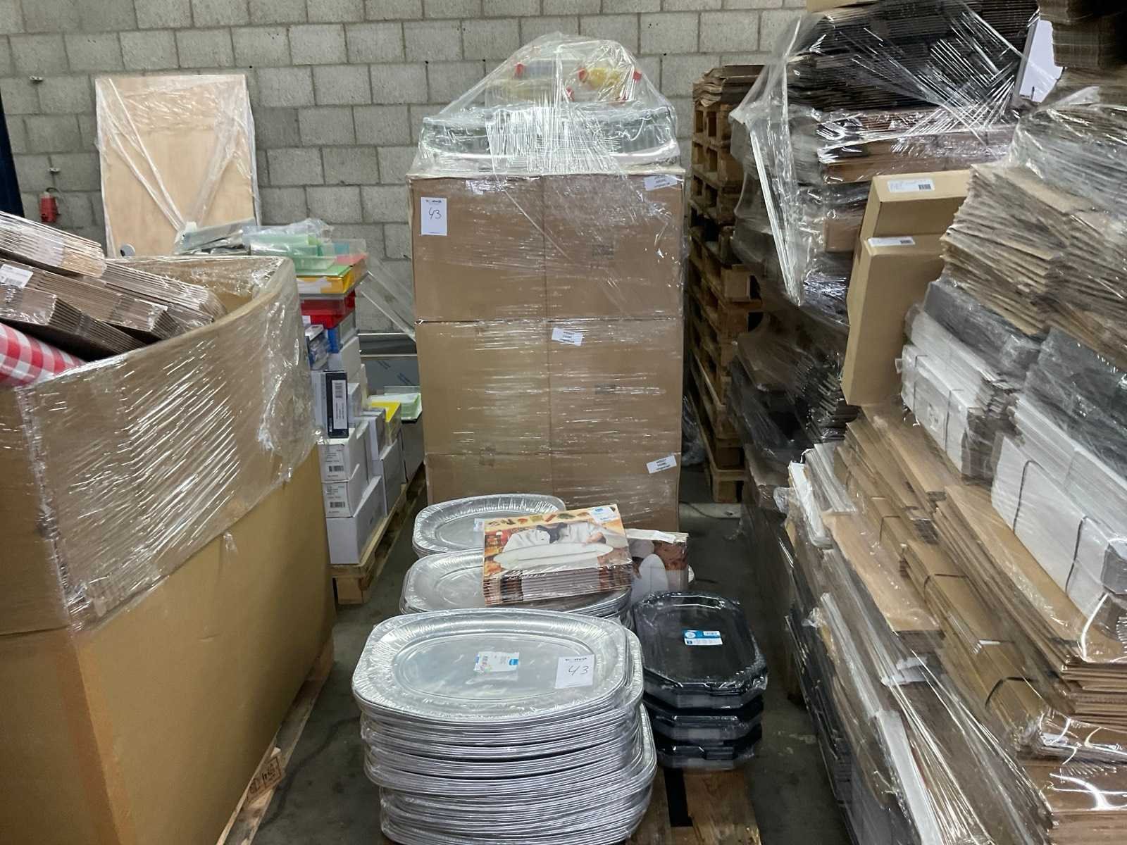 Inhoud op 3 pallets bestaande uit diverse verpakkingsmaterialen, o.a. cateringschalen, flessen gedopt en ongedopt, inclusief pallets.
