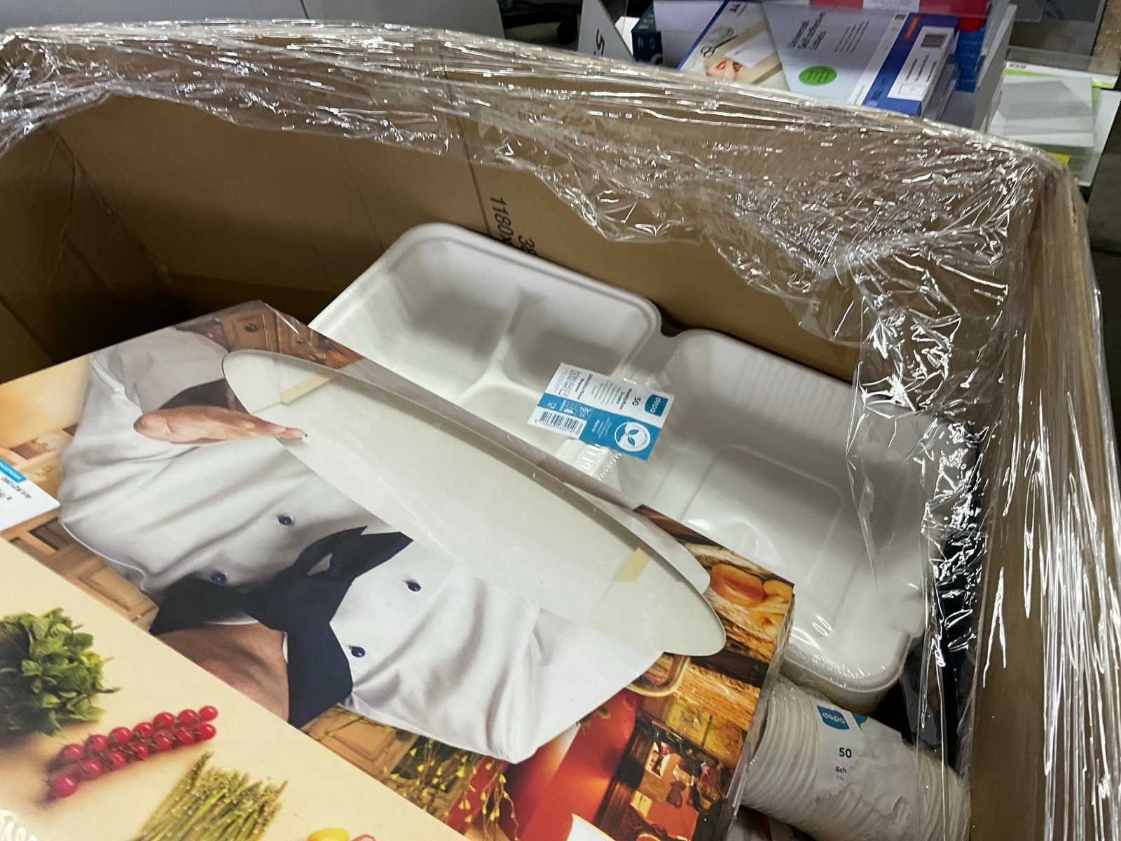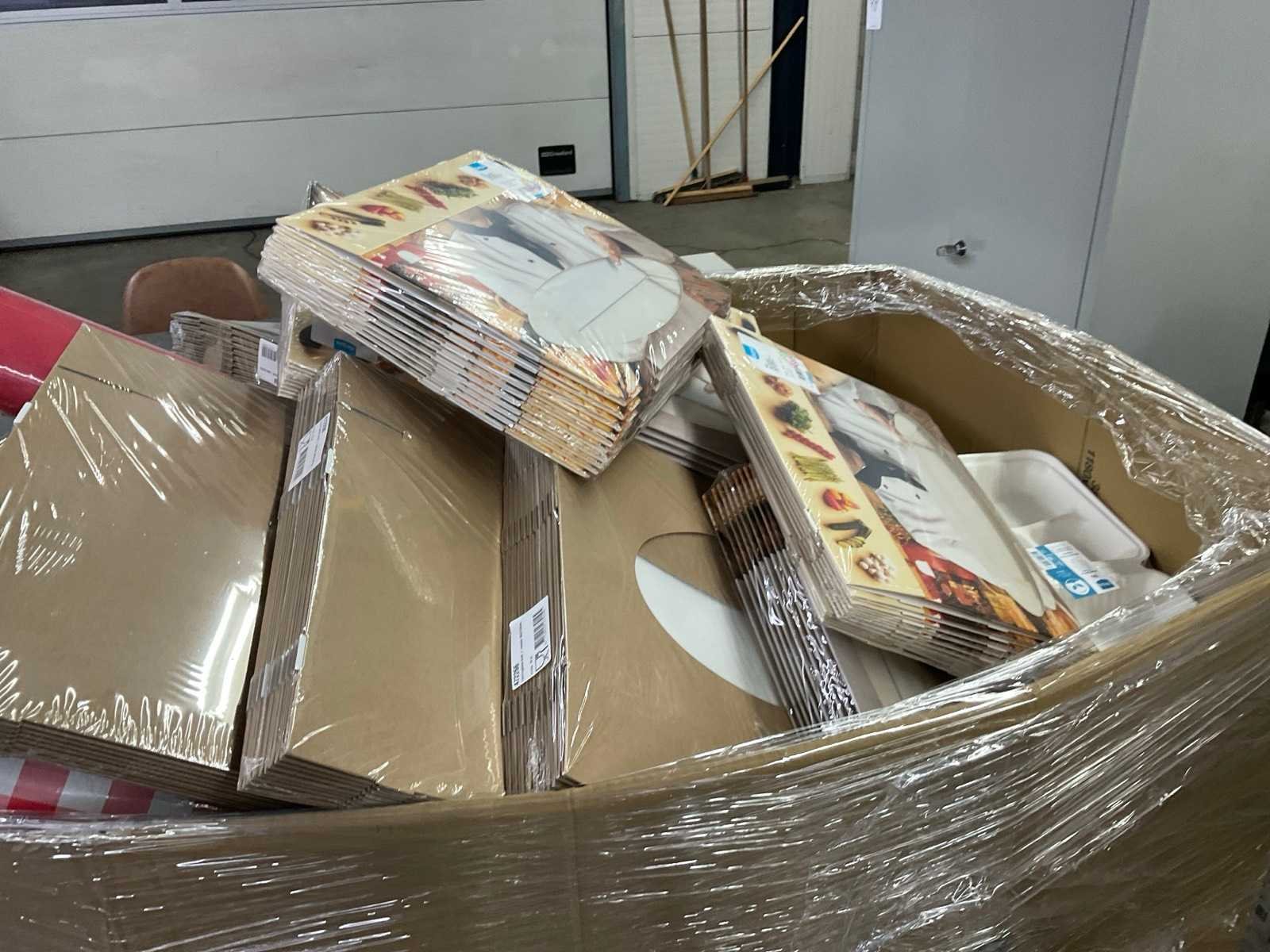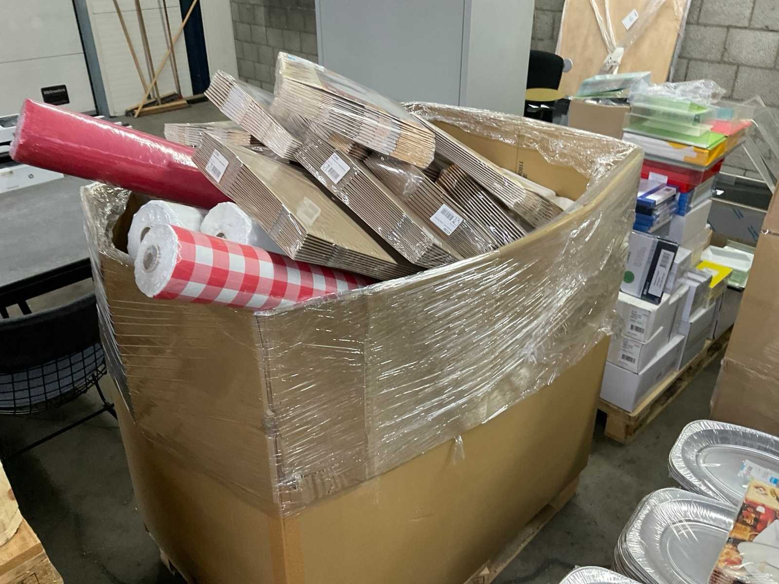 Inhoud op 1 pallets bestaande uit diverse verpakkingsmaterialen, o.a. cateringdozen en tafelpapier, inclusief pallet