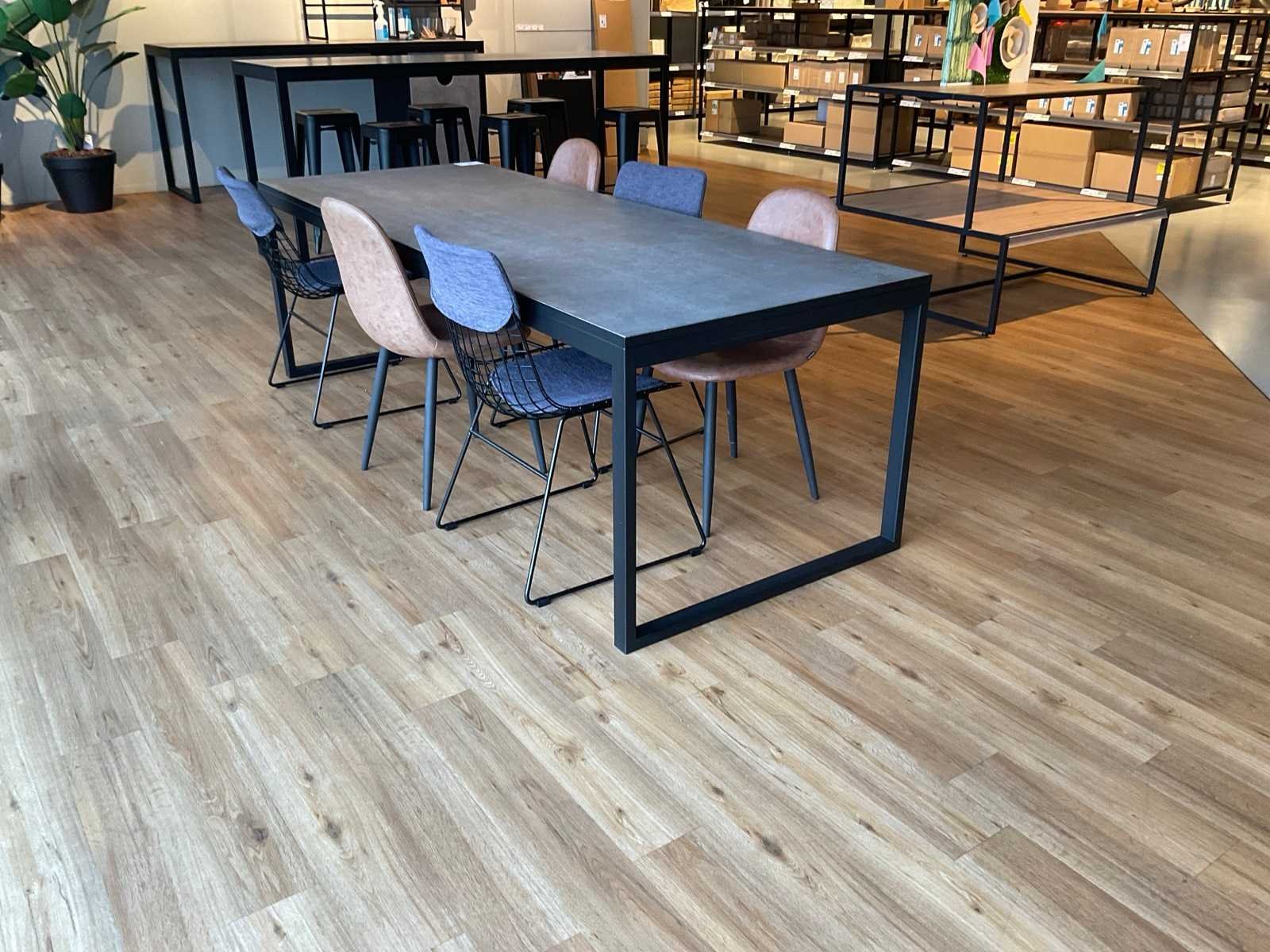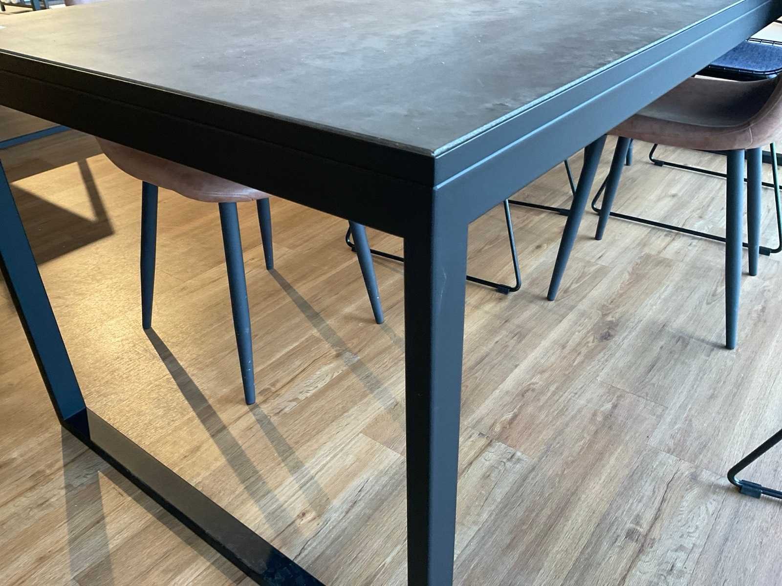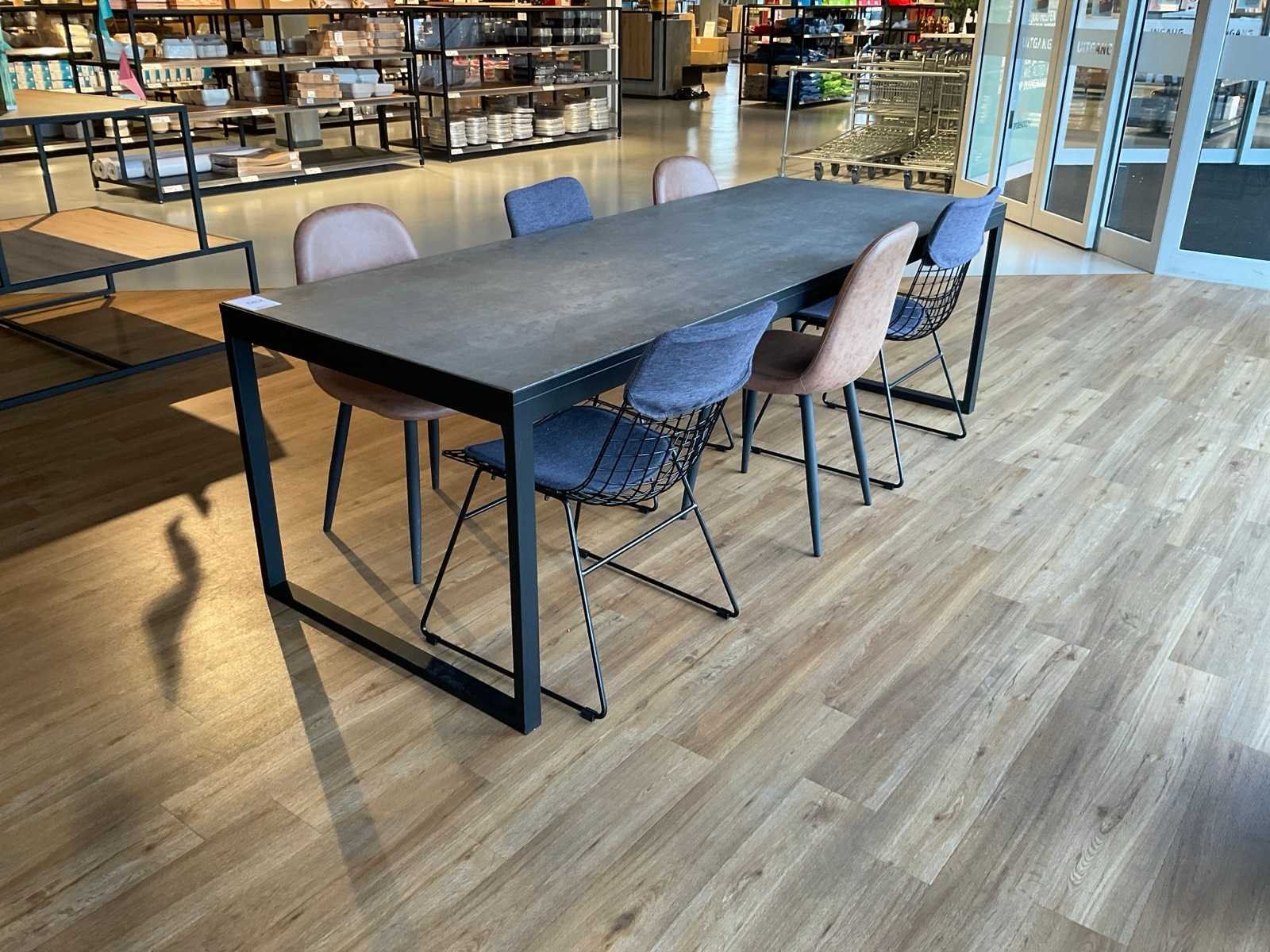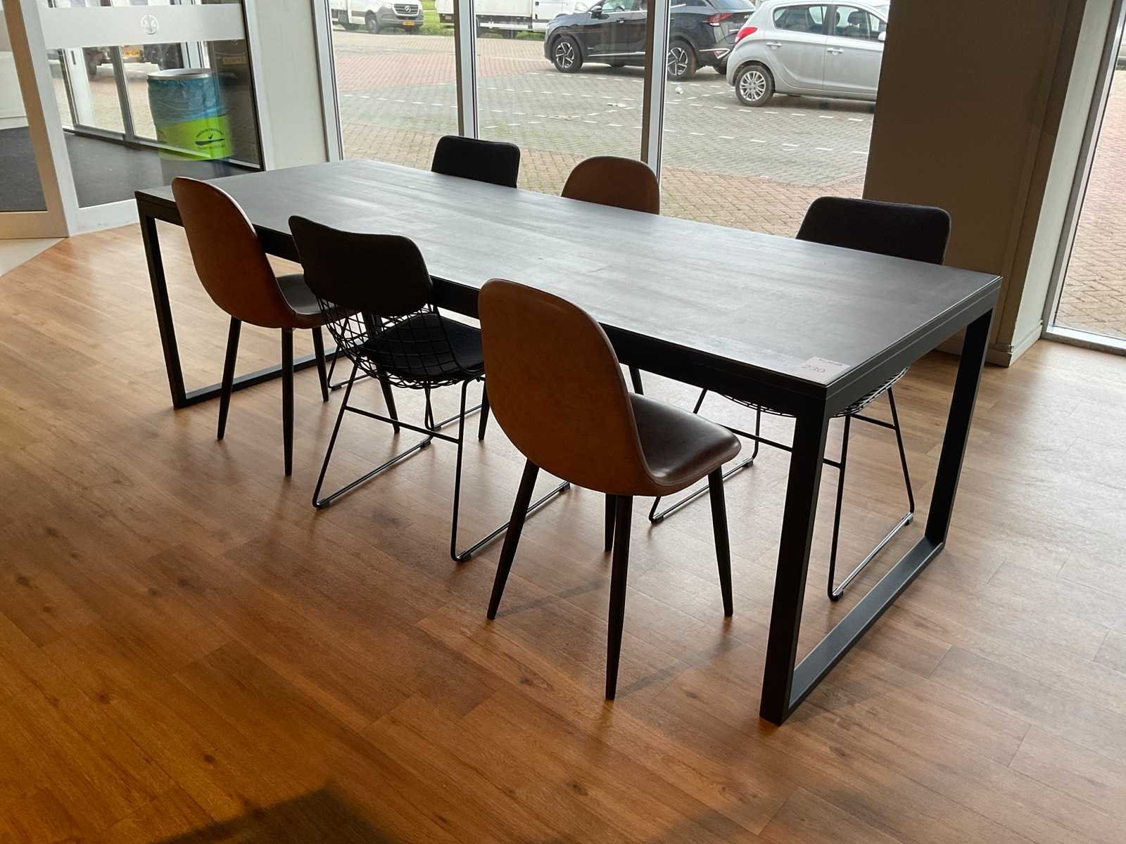 Stoelen in 2 designs, 3x metaal/gestoffeerd en 3x gestoffeerd. Zitplaatsen: 6 Lengte: 240cm Breedte: 90cm Hoogte: 75cm Materiaal: Metaal en hout