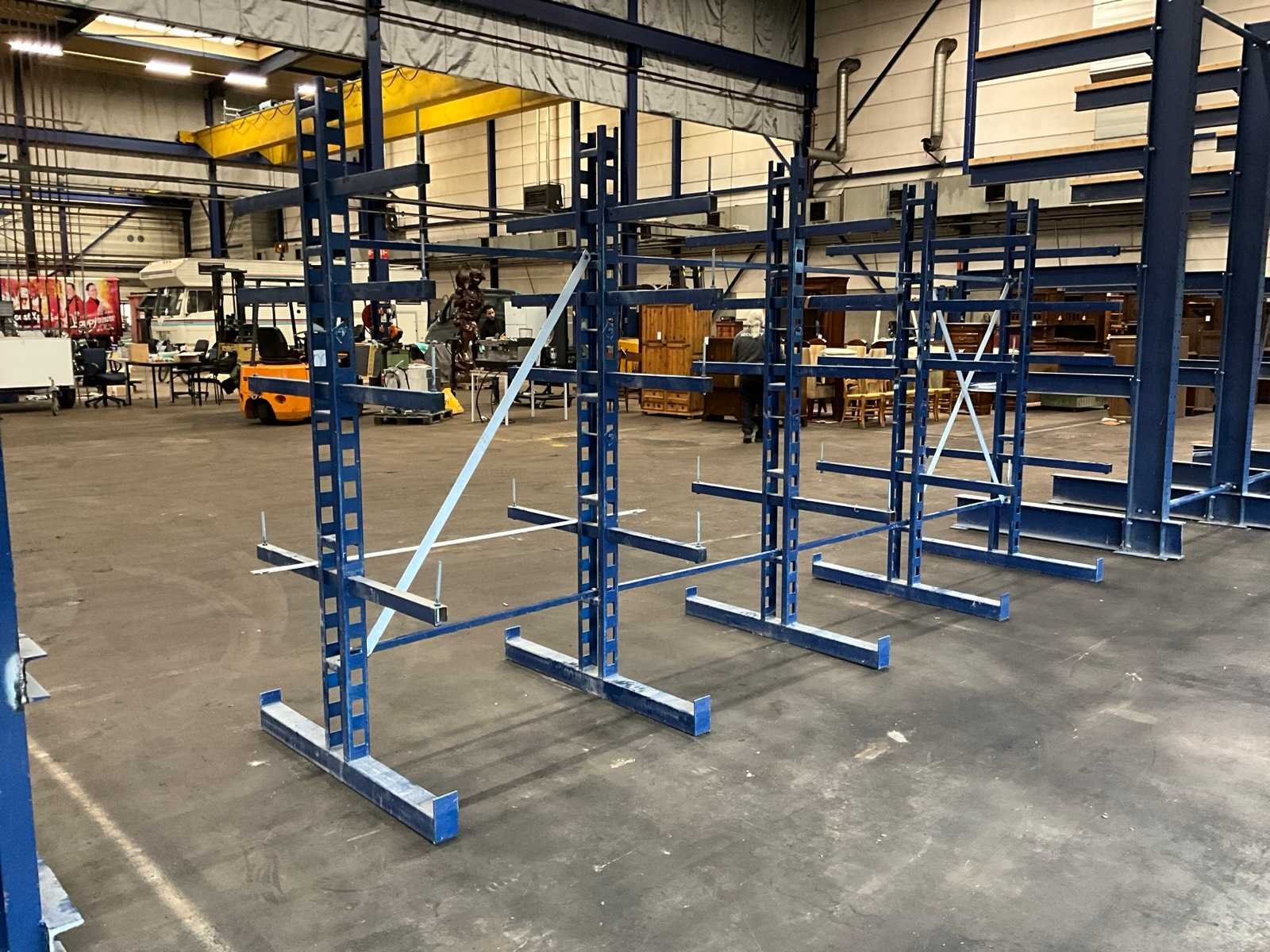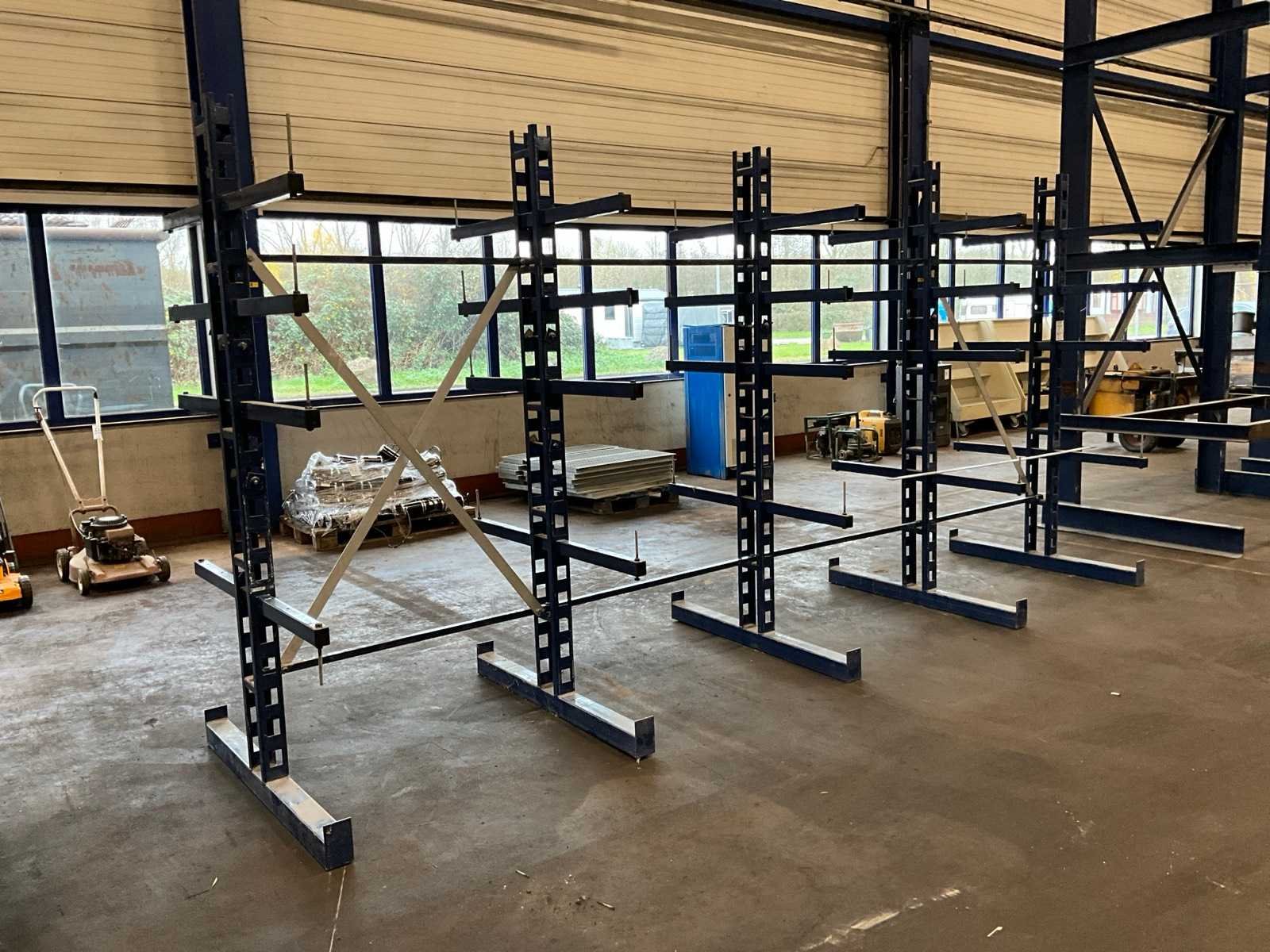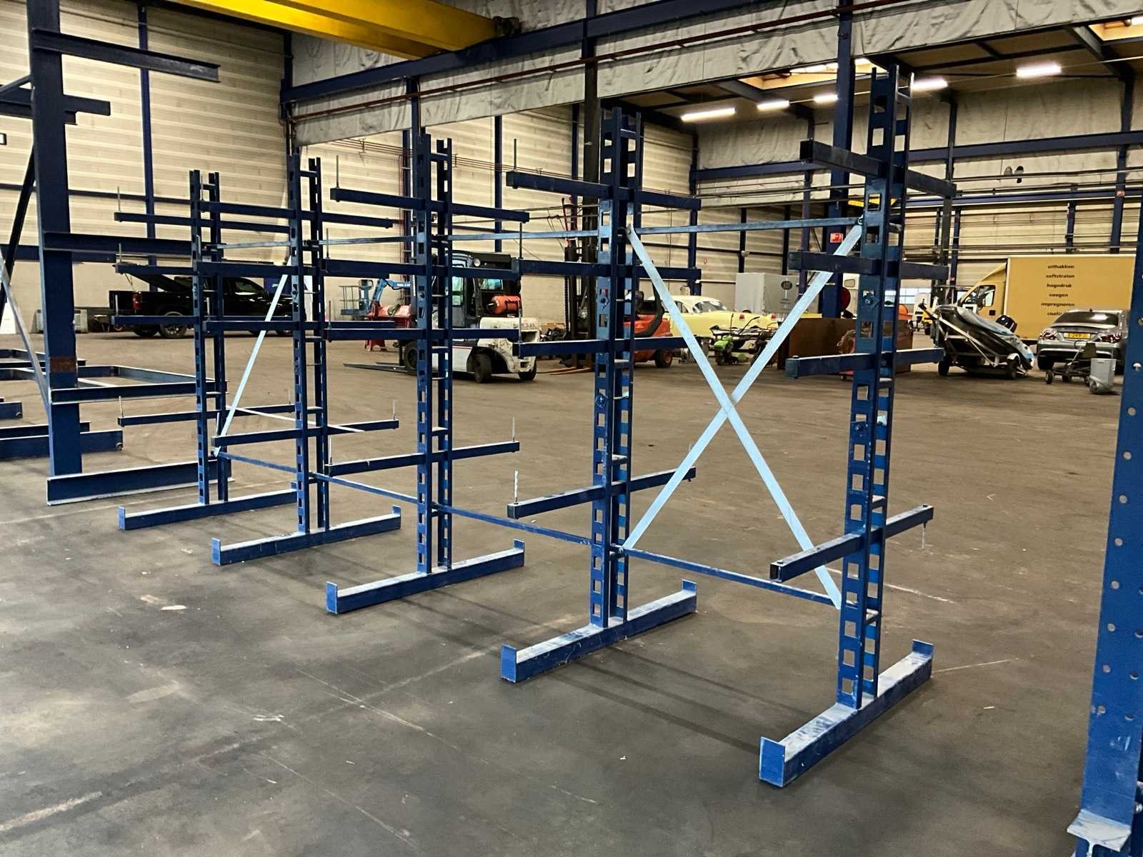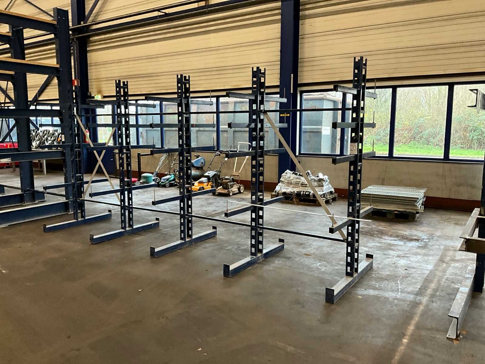 Bestaande uit 5x staander; staander afmeting 1200x2200 mm; armlengte 500 mm; armen geconstrueerd aan staander; schoren en verbindingen demonteerbaar; totaal afmeting van de opstelling 4480x1200x2200 mm