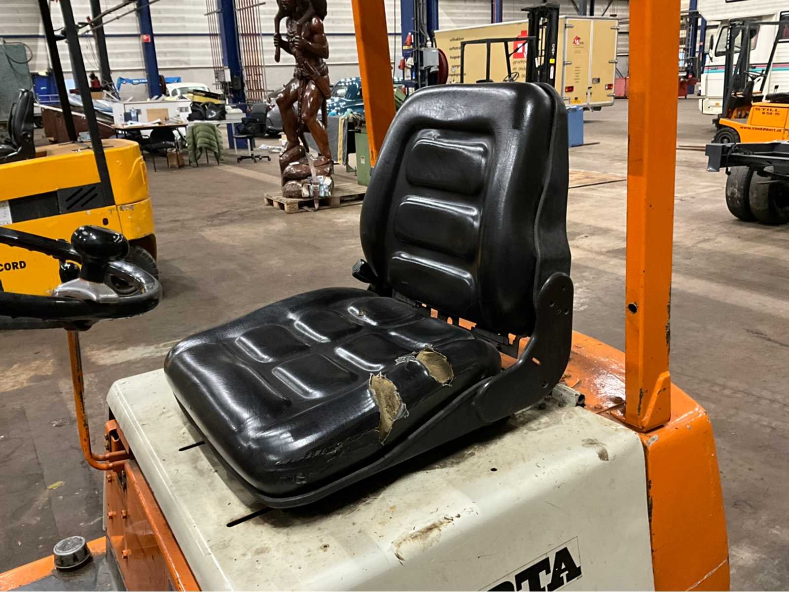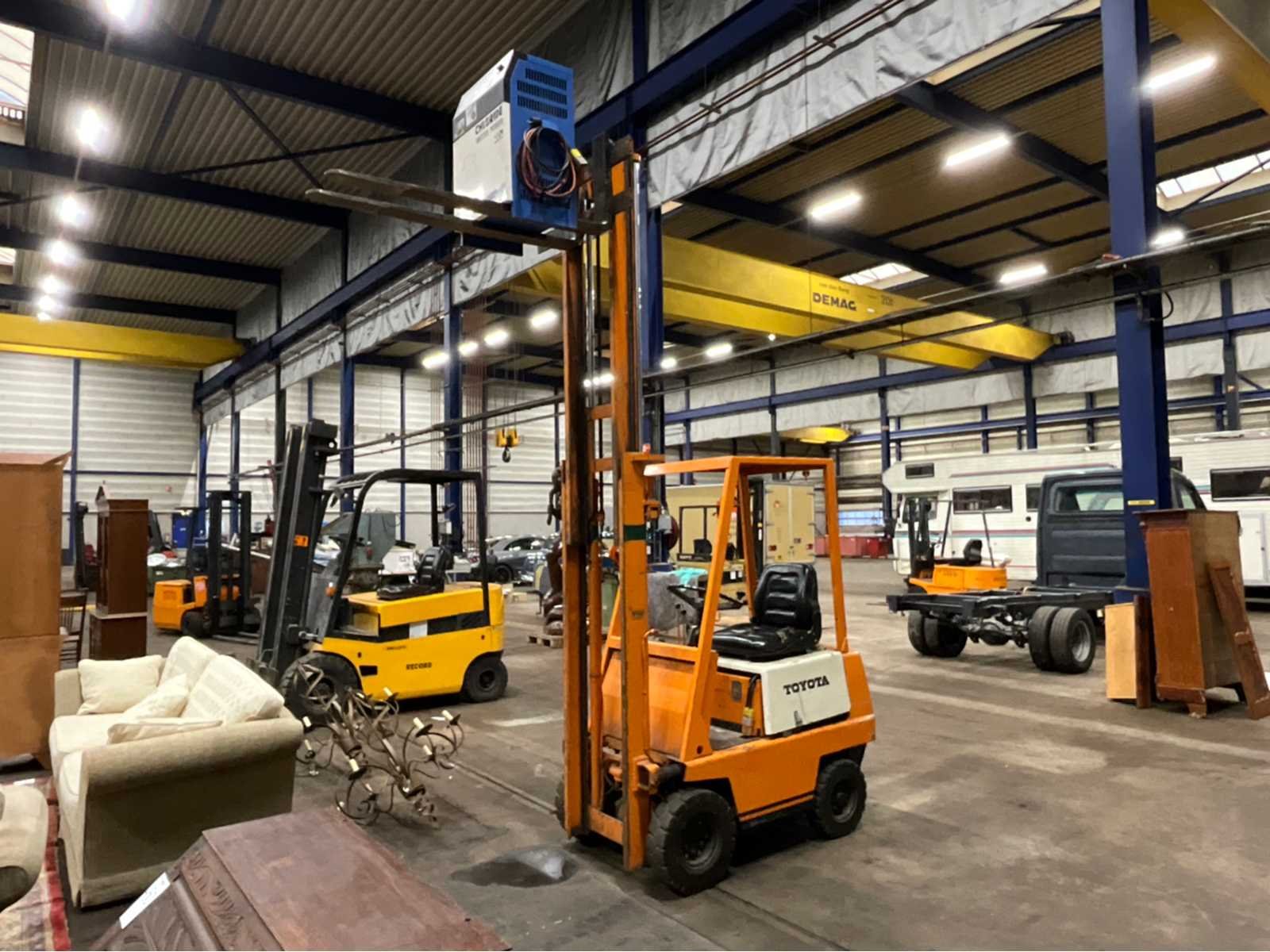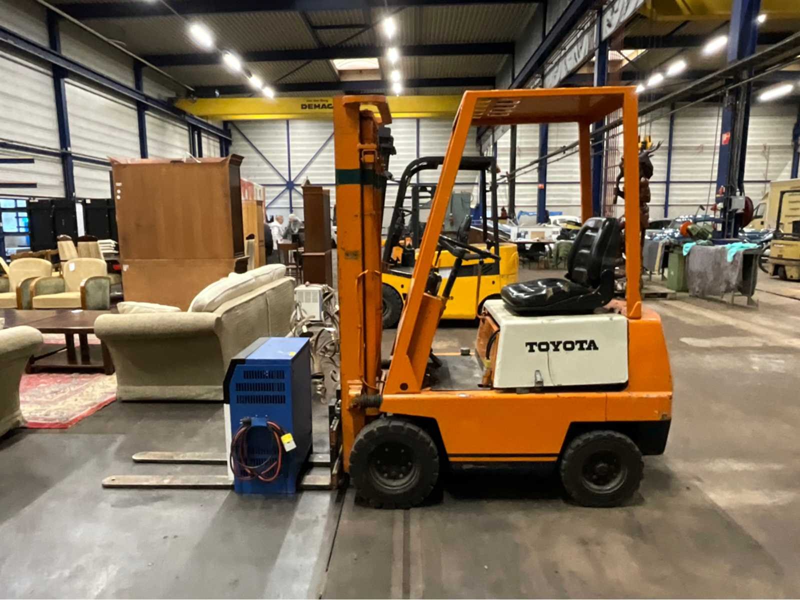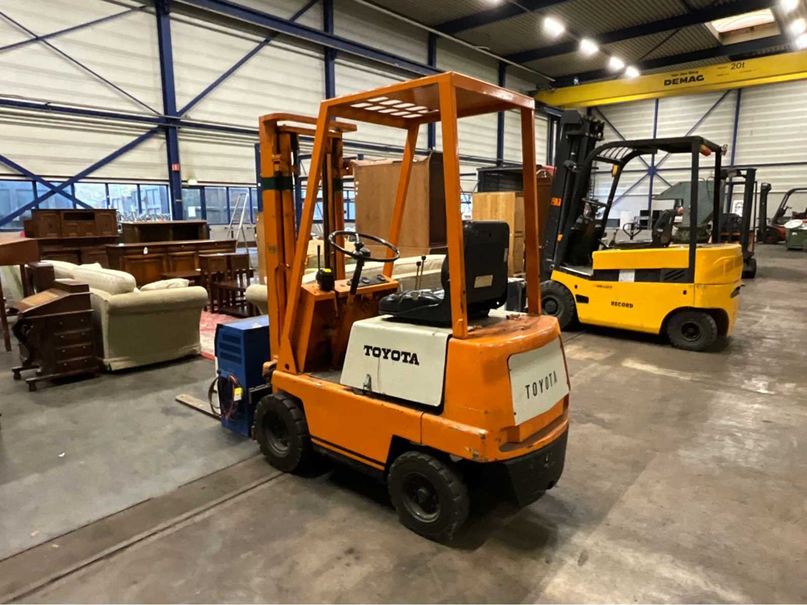 Eigen gewicht zonder accu 1370 kg; voorzien van recent vernieuwde accu; remmen te vervangen; Merk: Toyota Type: 2FB9 Brandstof: Elektrisch Mast: Duplex Soort band: Volrubber banden Aantal wielen: 4 Afgelezen urenstand: 3206 Accu lader: true Hefvermogen: 900kg Lepellengte: 1230mm Max. hefhoogte: 3000mm Hefhoogte: 3000mm Minimale doorrijhoogte: 2000mm Totale afmeting L: 3100mm Totale afmeting Breedte: 900mm Totale afmeting Hoogte: 2000mm