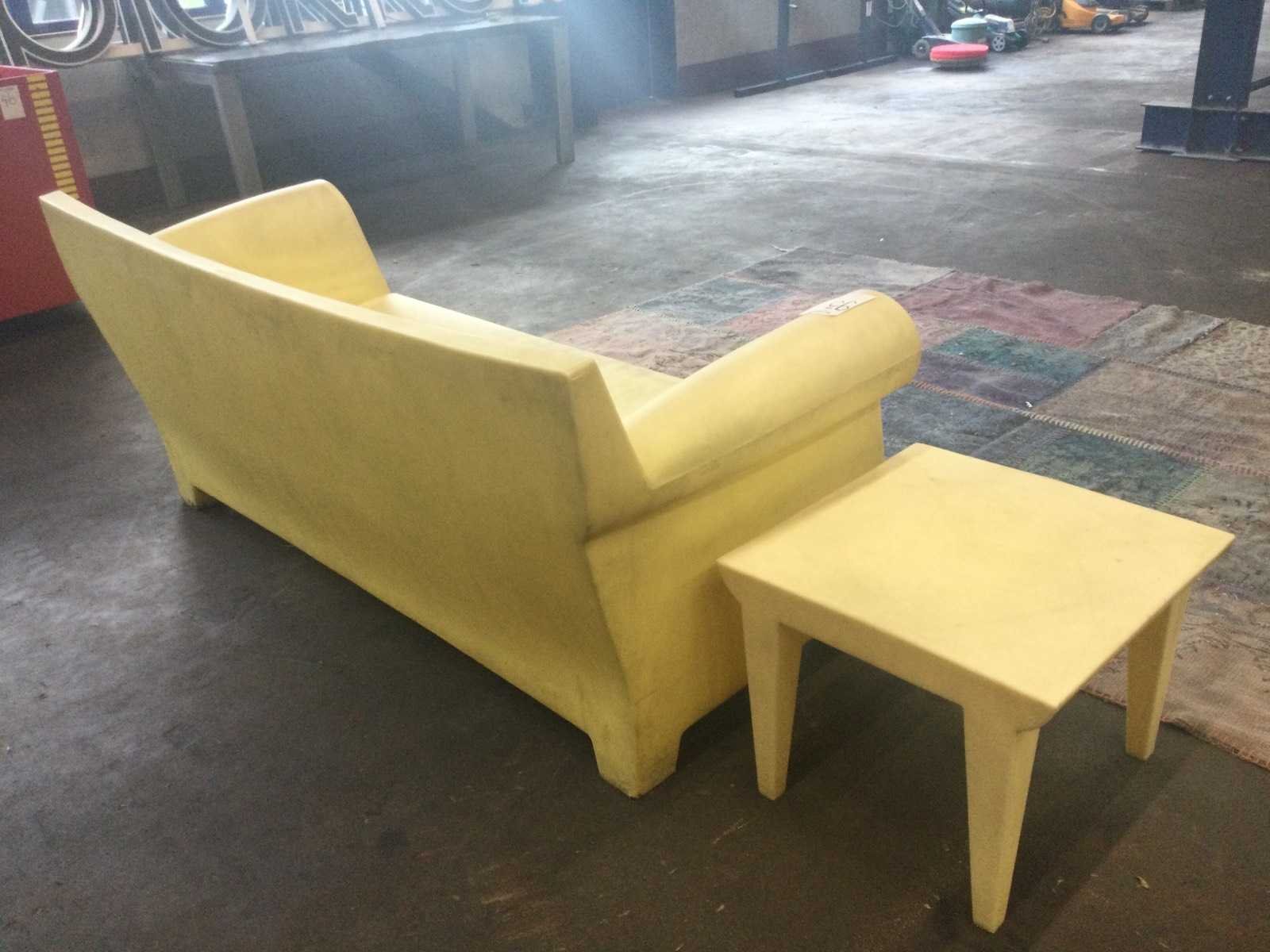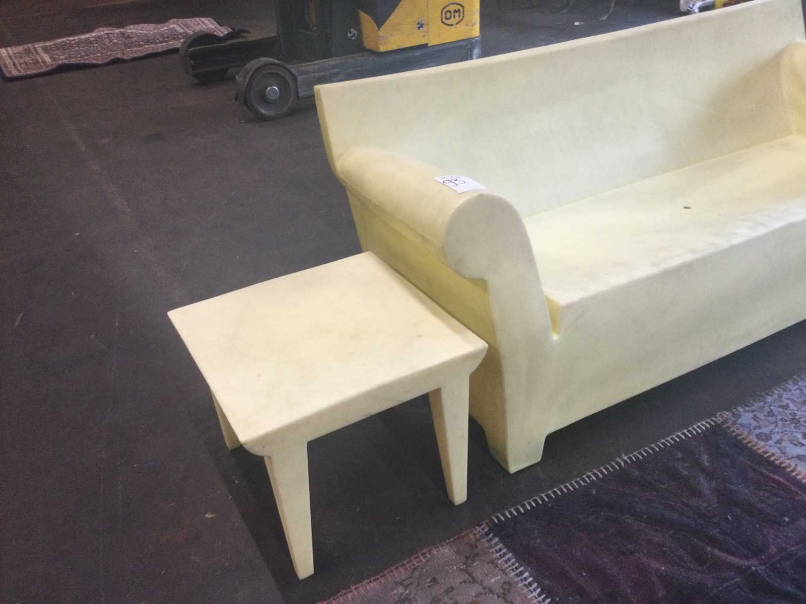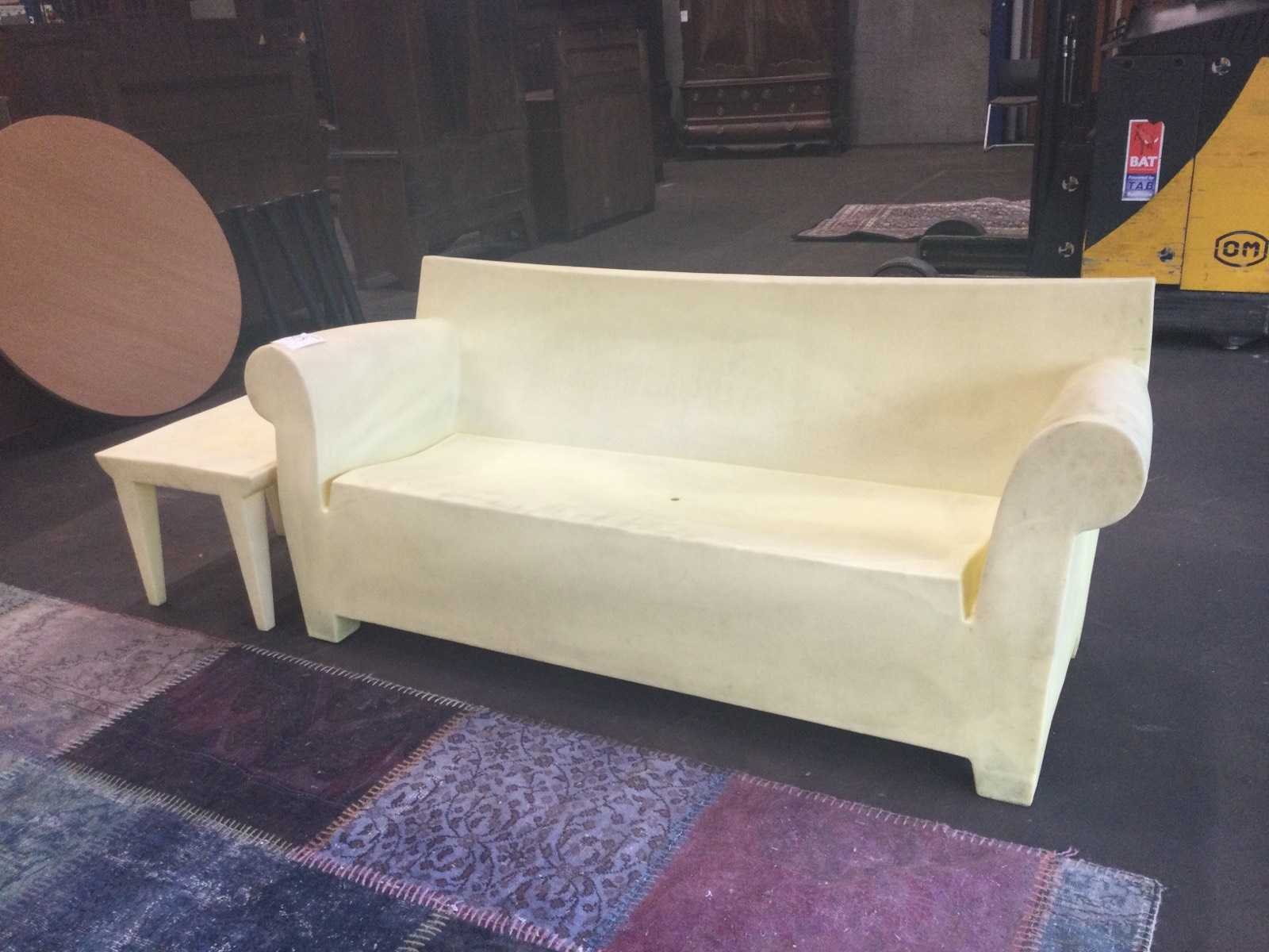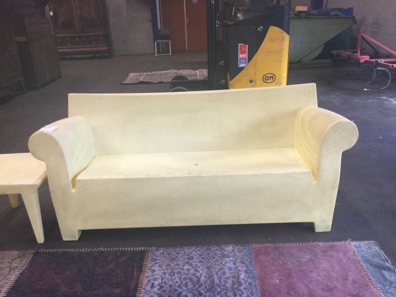 Diepte 77 cm. , zithoogte 45 cm., hoogte armleuning 70 cm., afm. bijzettafel 51 x 51 cm. Met gebruikssporen Kunstenaar: Philippe Starck Fabrikant: Kartell Materiaal: Kunststof Model: Bubble-club Hoogte: 80cm Breedte: 195cm