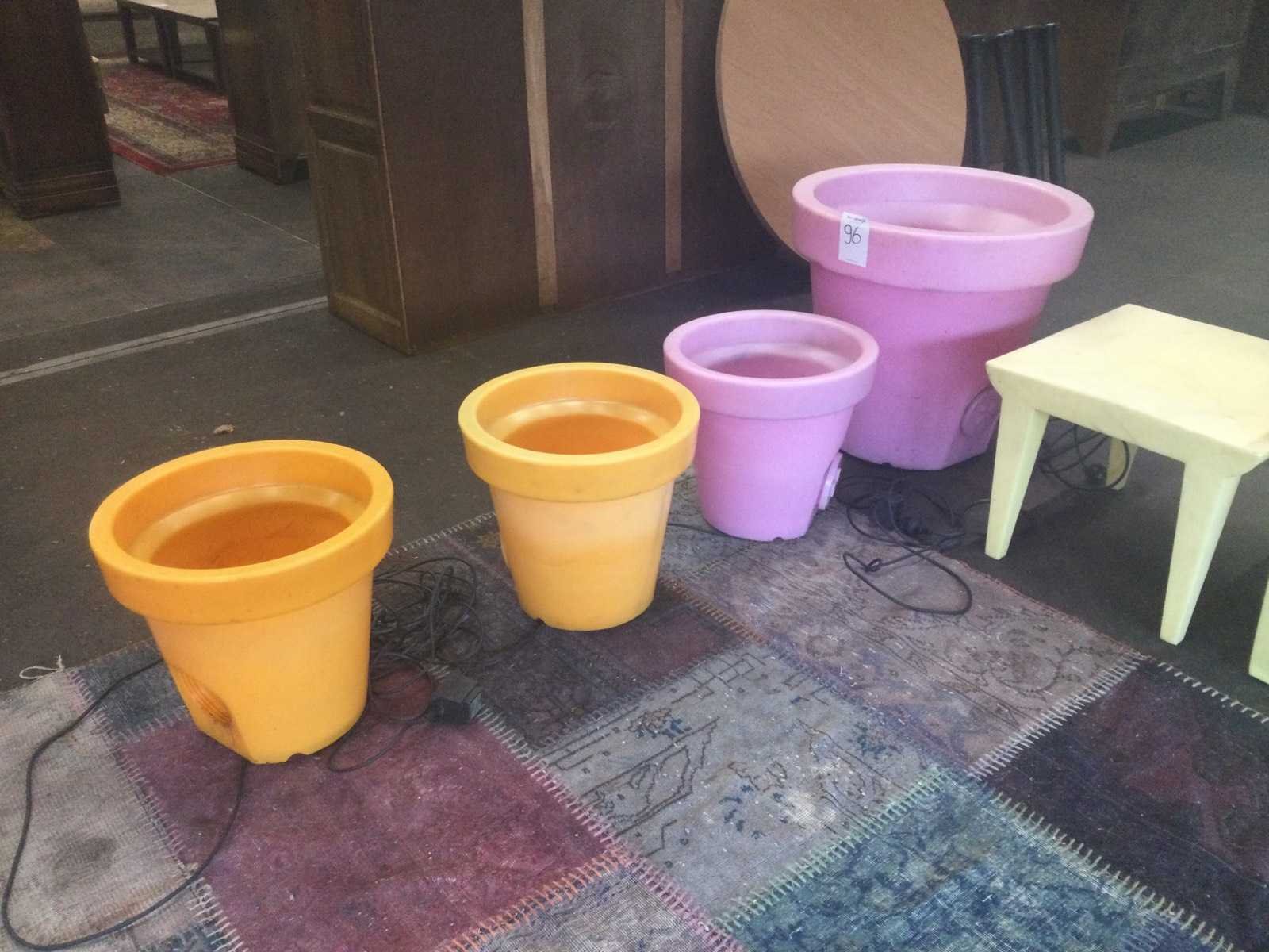 Diverse kleuren, afm. 3 stuks hoogte 40 cm. Diameter 44 cm., 1 60 cm. hoog, diameter 65 cm.. Gebruikssporen Merk: Bloom Materiaal: Kunststof