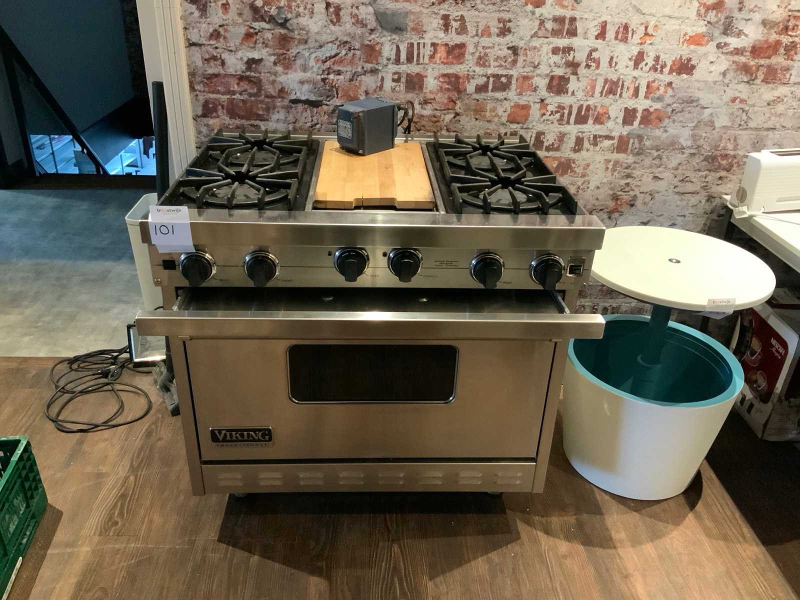 Met oven is voorzien van 4 branders en in het midden een grillplaat. Transformator is inbegrepen. Merk: Viking professional Kookzones: 4 Oven: true Vermogen: 220W Kleur: Zilver Lengte: 760mm Breedte: 910mm Hoogte: 950mm