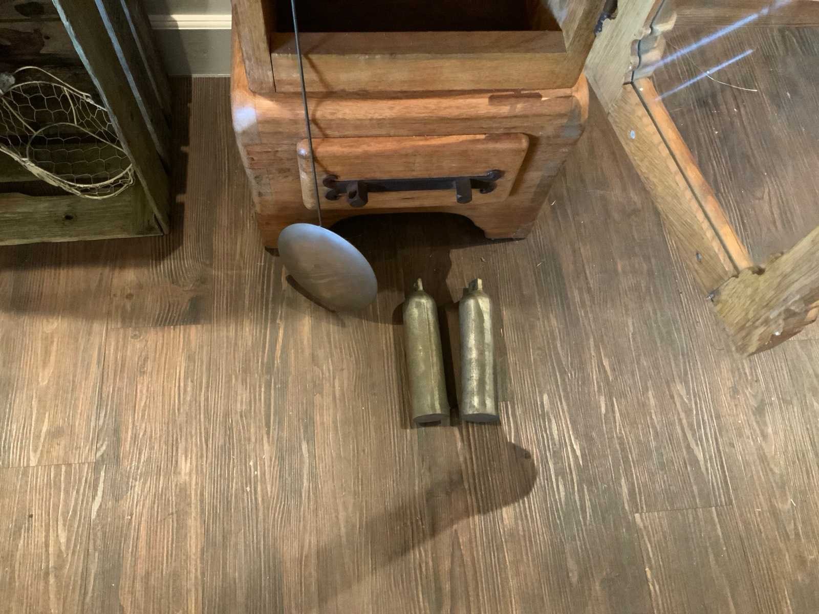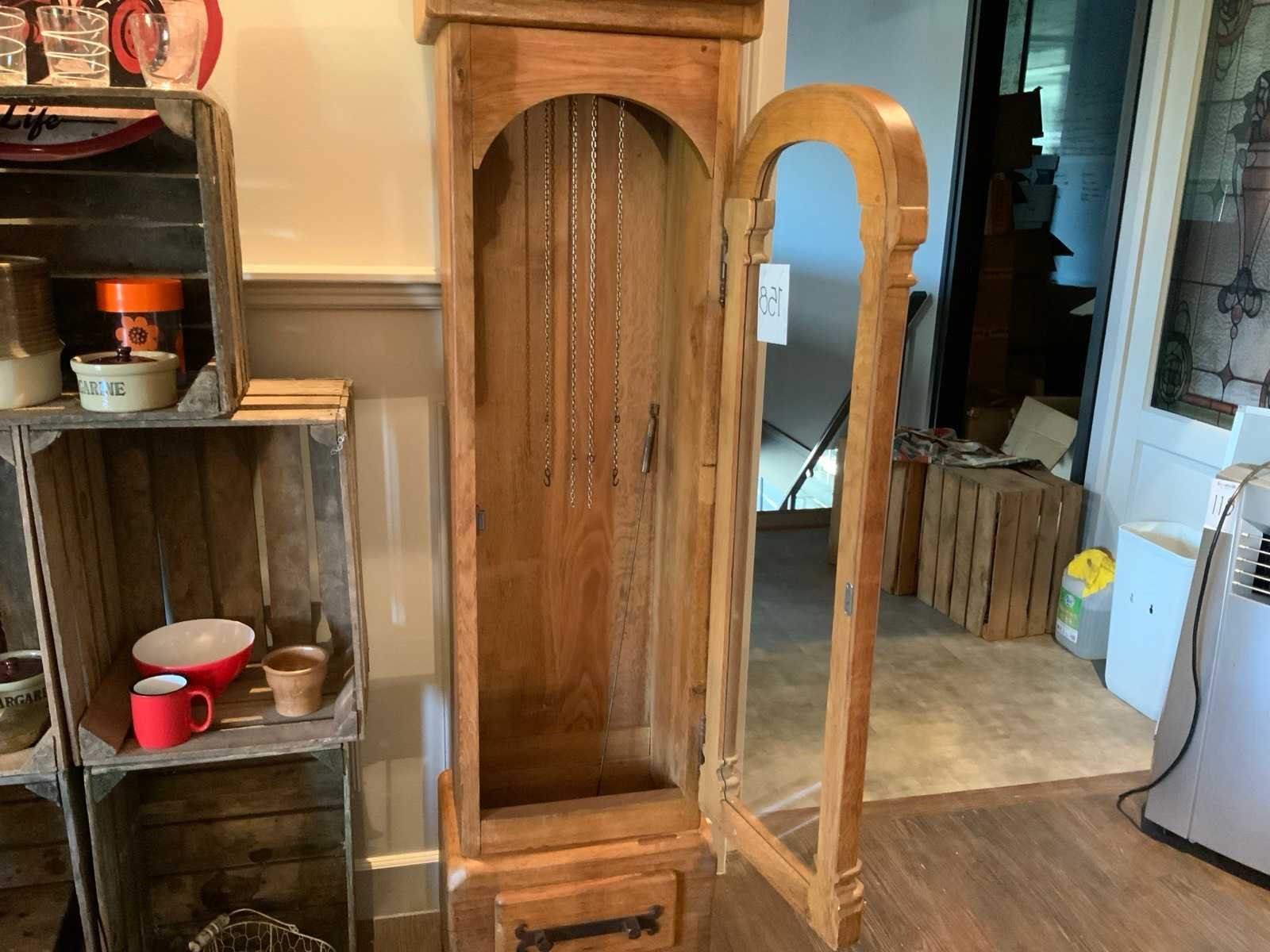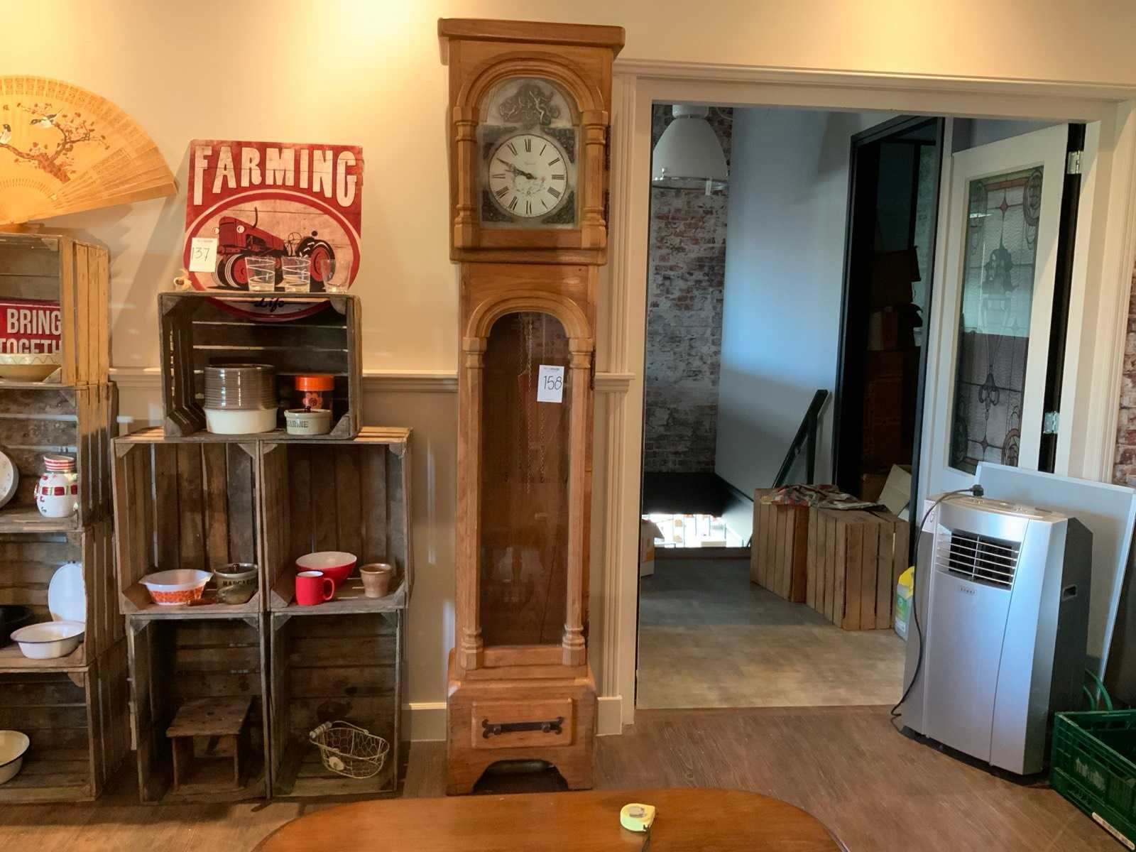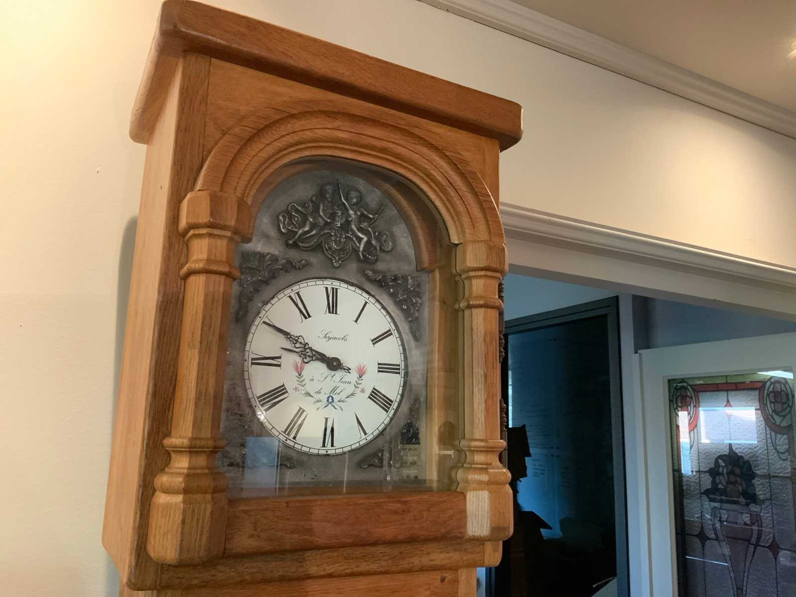 Uitgerust met slinger en antiek uurwerk. Merk: ’Serjacobs à St Jean de Mol Totale afmeting Breedte: 450mm Totale afmeting Hoogte: 2200mm