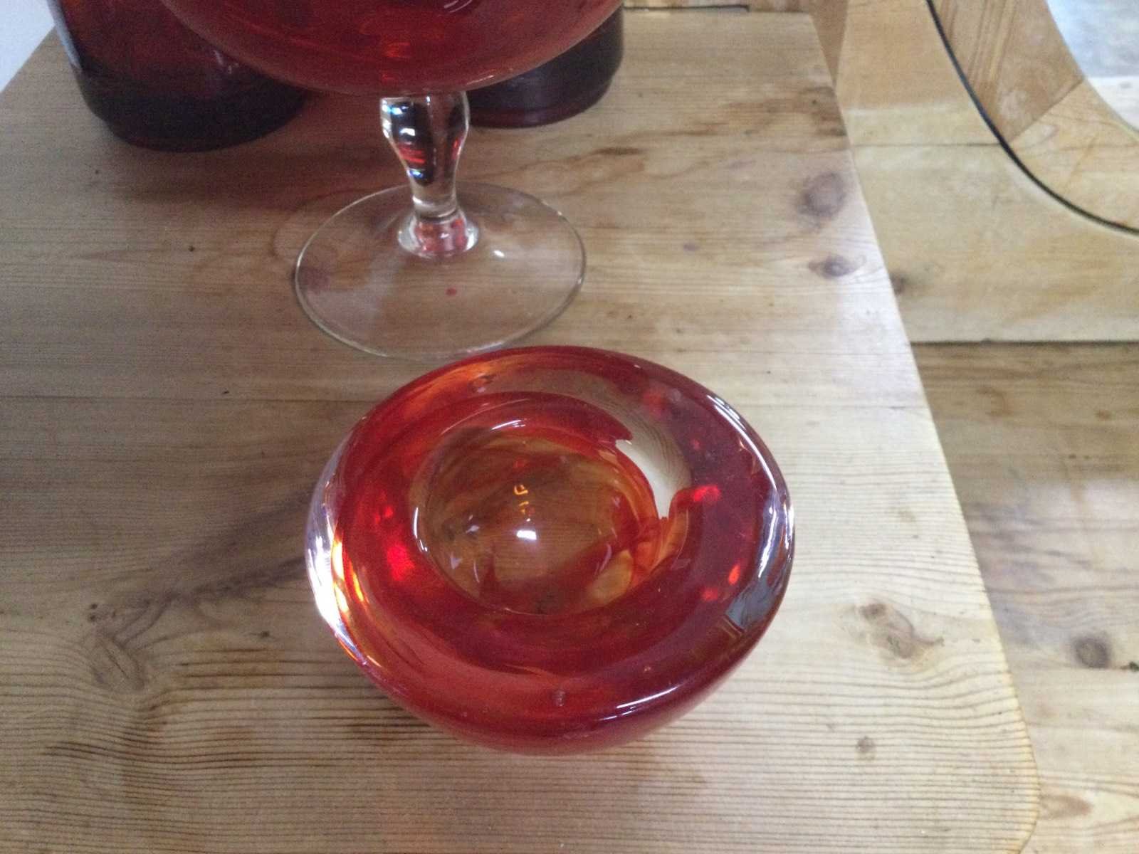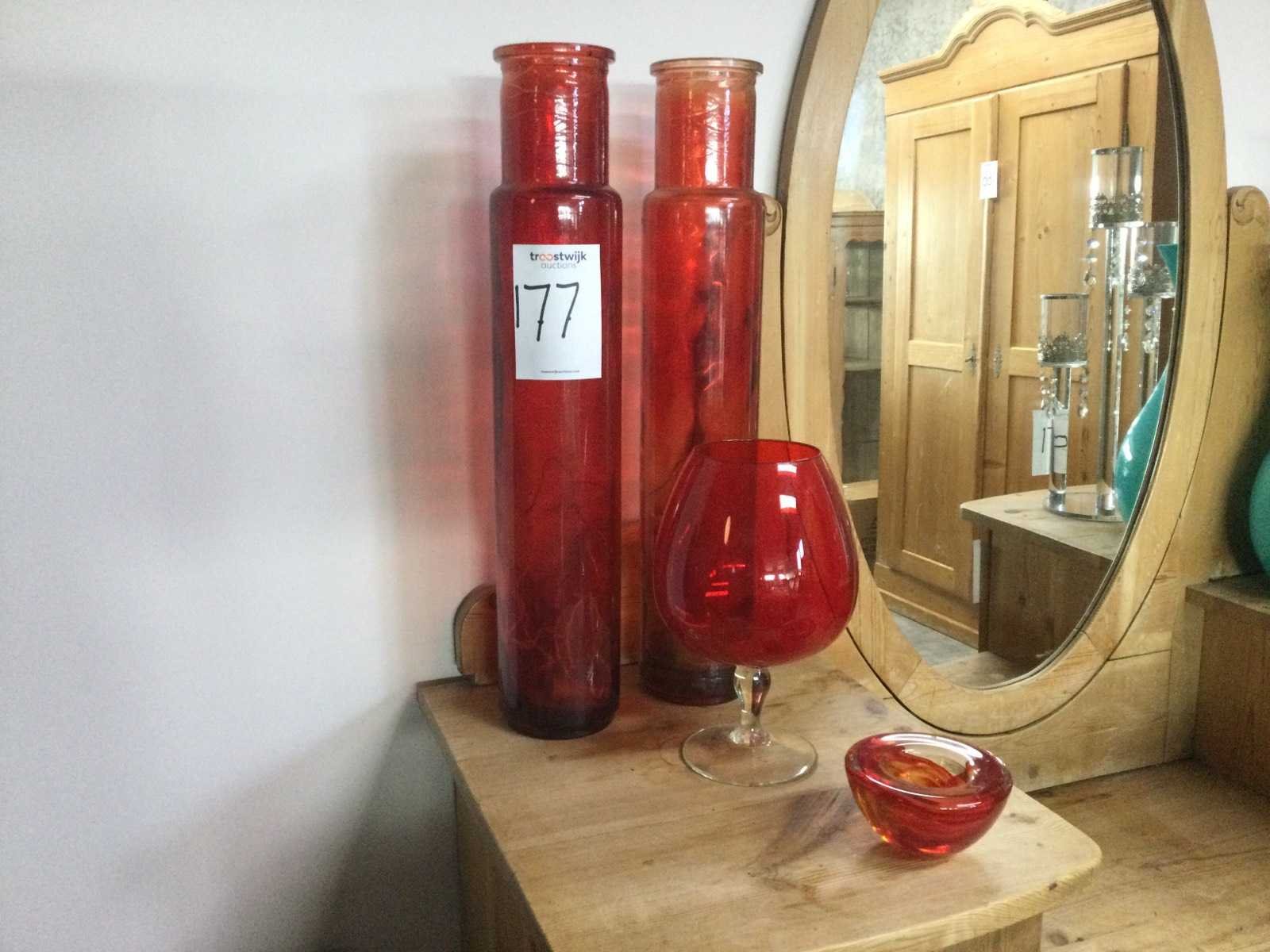 2 rode glazen vazen 56 cm., red brandy glas 26 cm., 1 design waxinelichthouder