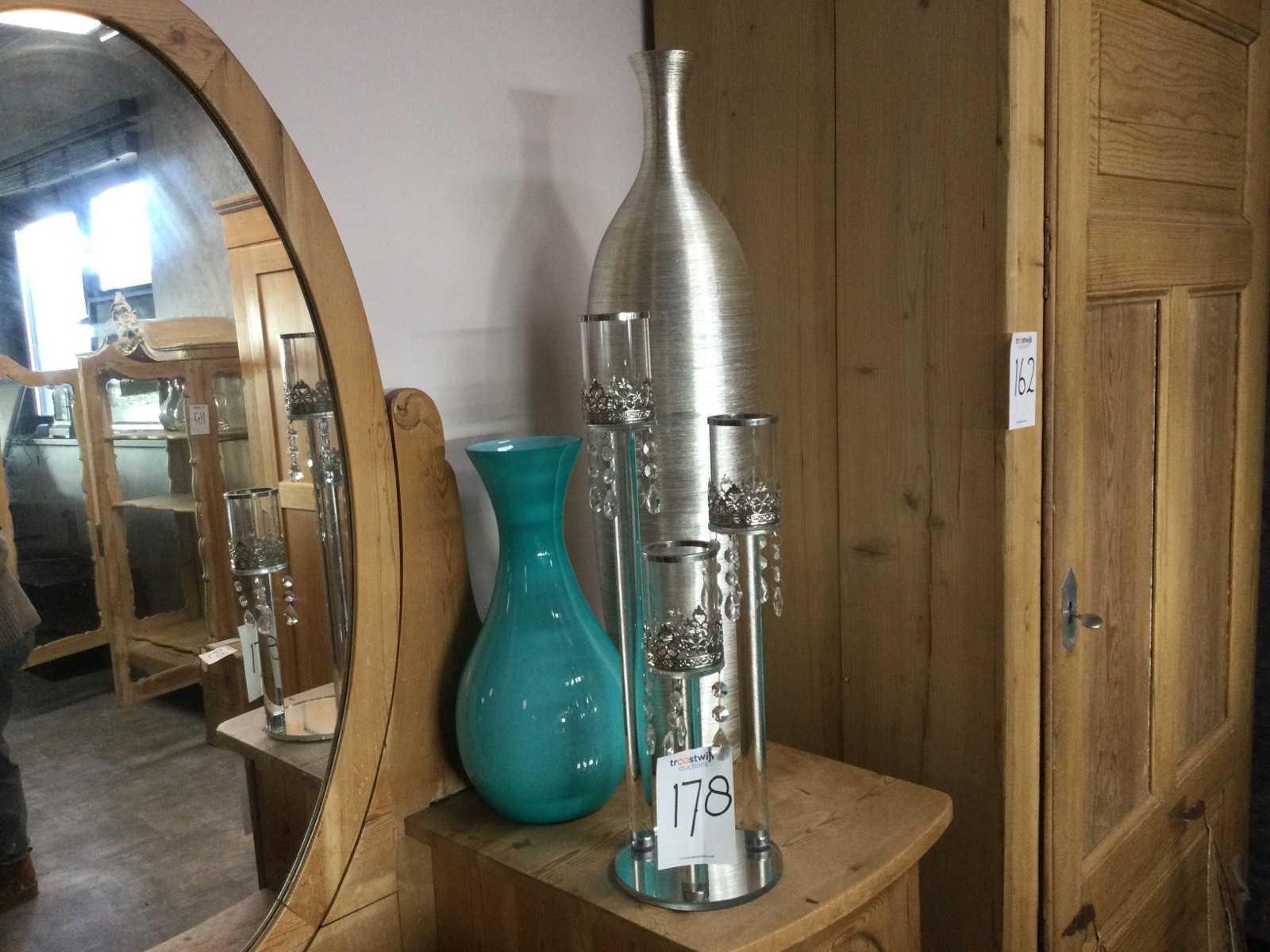 1 zilverkleurige stenen vaas 80 cm. hoog, 1 turquise vaas 41 cm., kaarsenstandaard