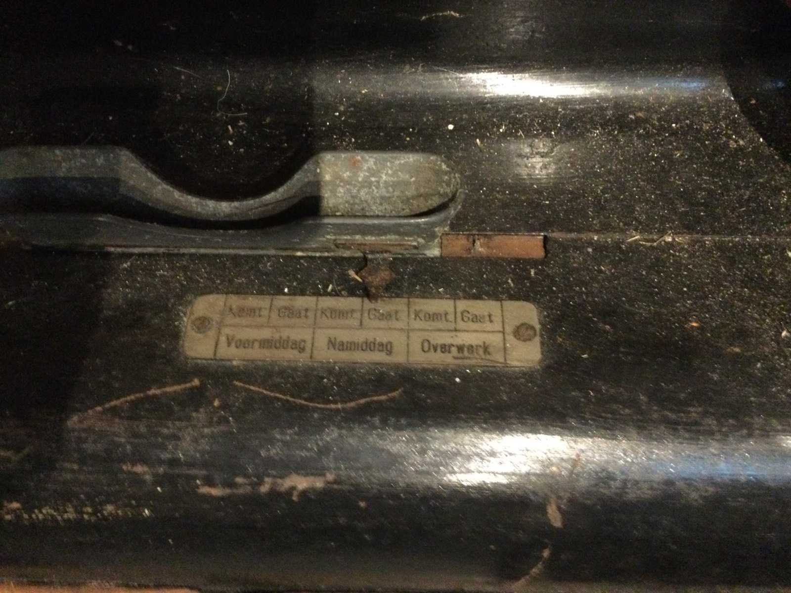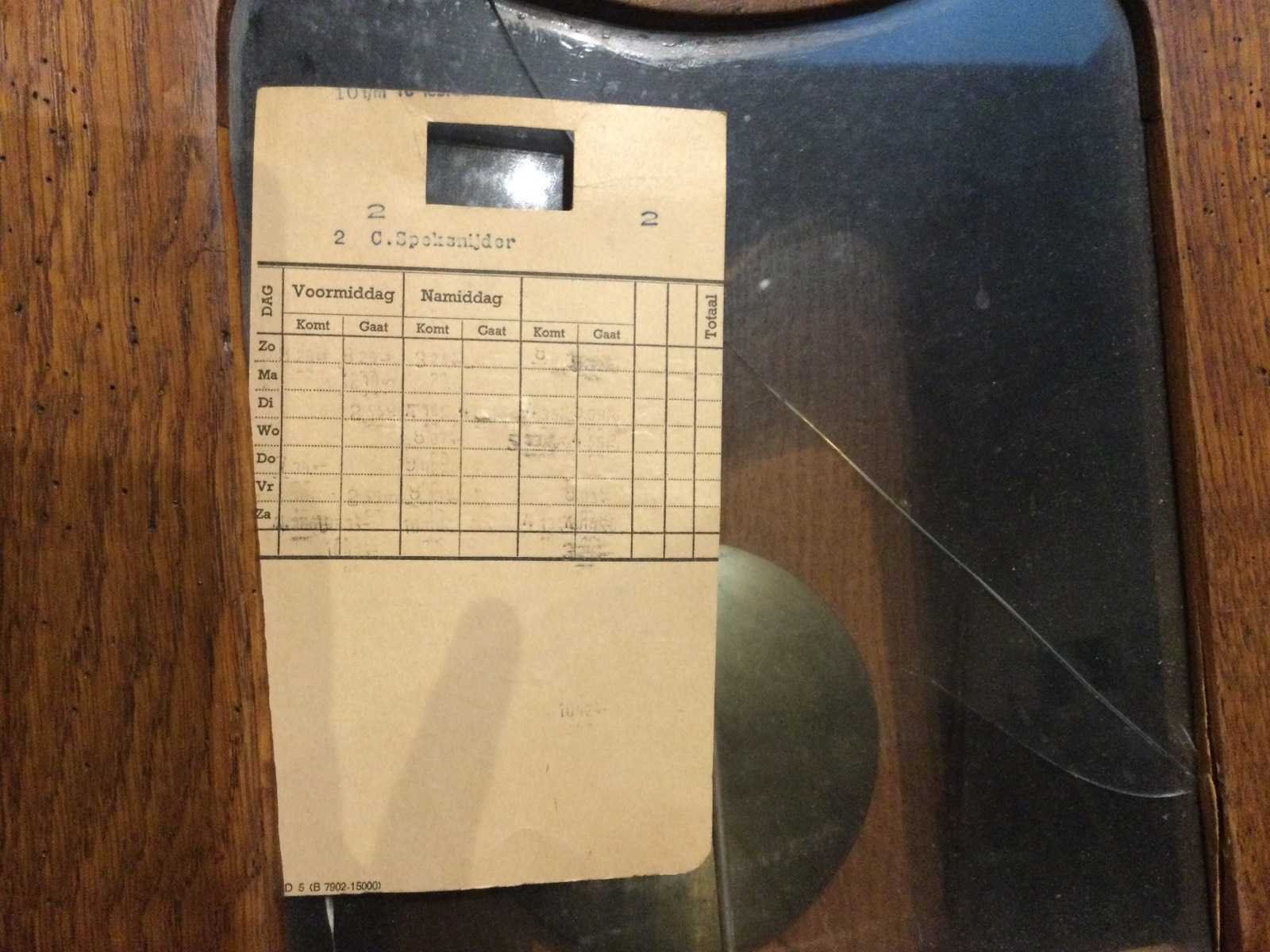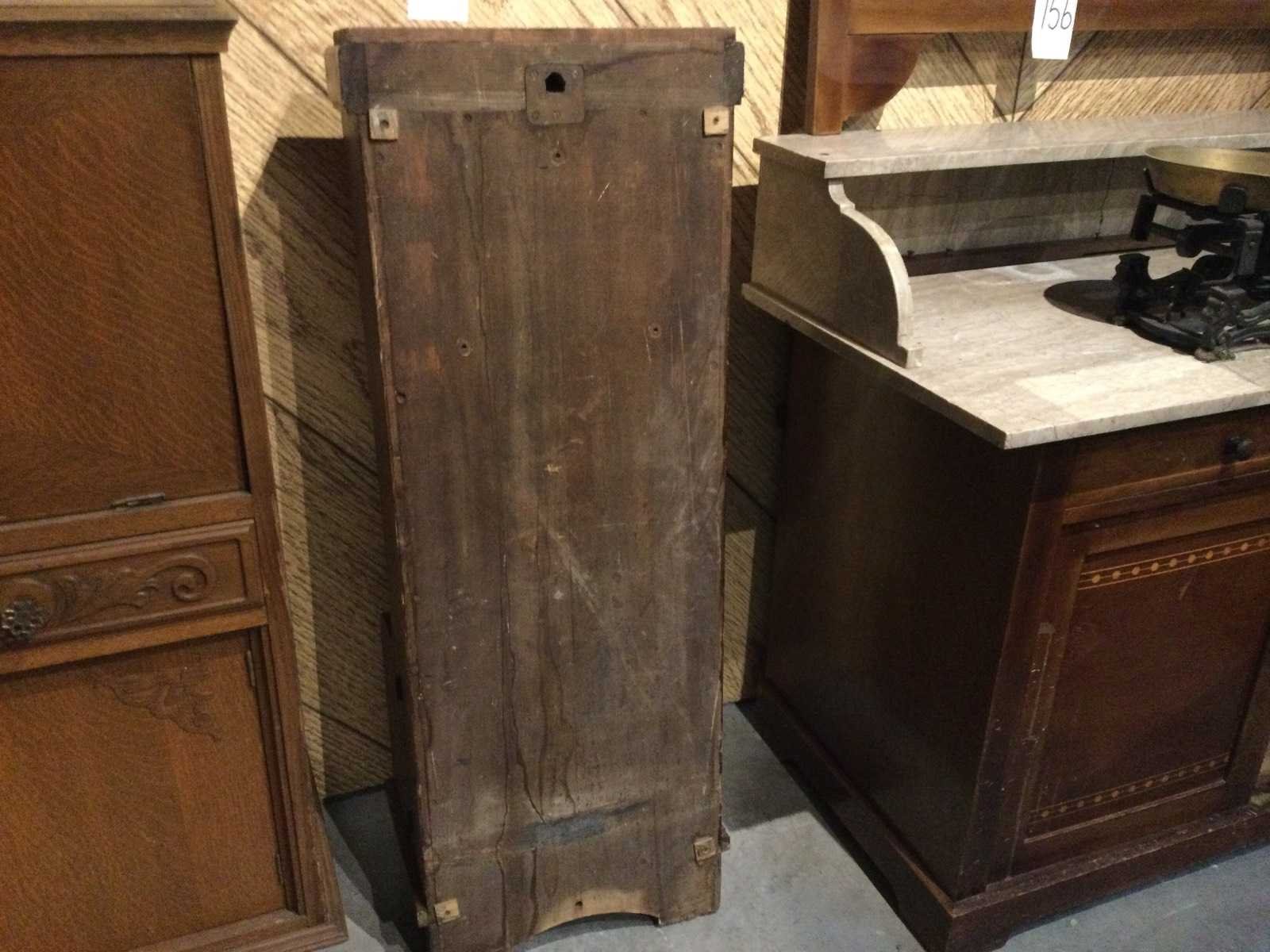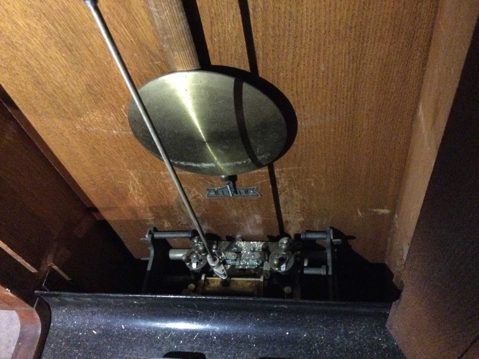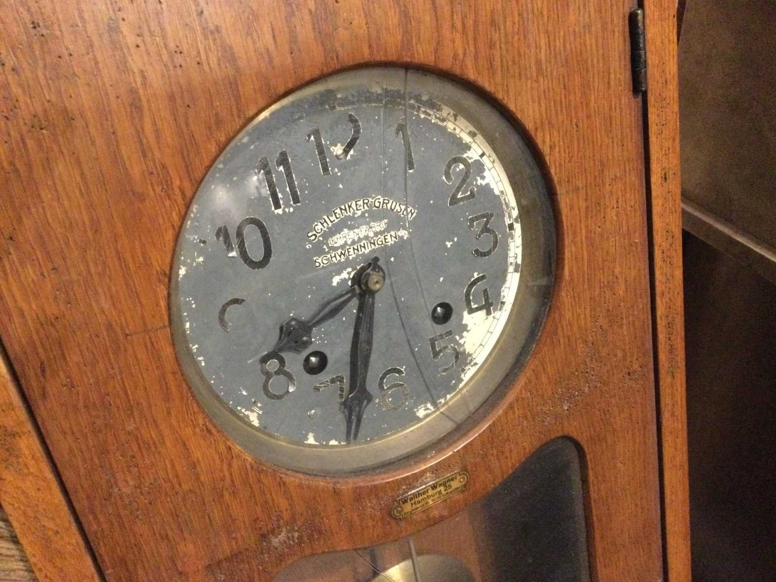 Werking onbekend, glas uurwerk gescheurd Fabrikant: Schlenker-Grusen Materiaal: Eikenhout Lengte: 30cm Breedte: 40cm Hoogte: 105cm