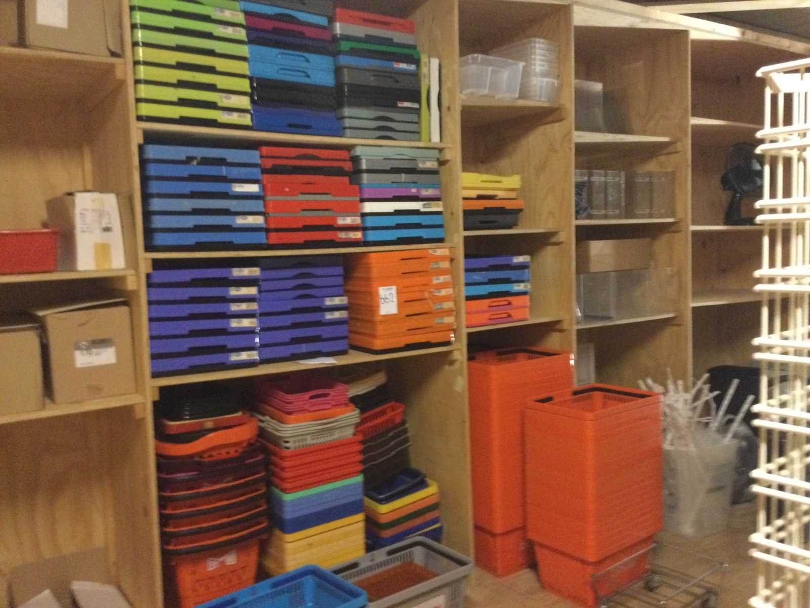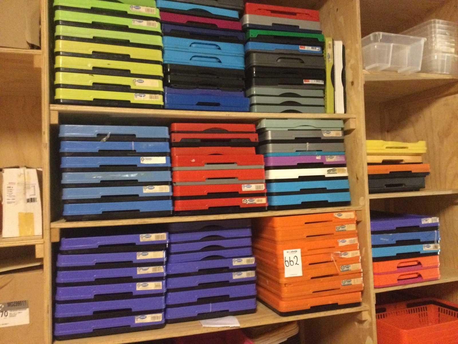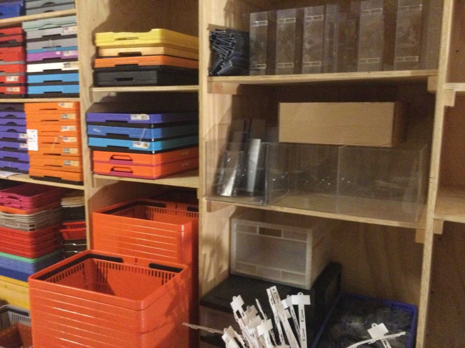 Diverse maten en kleuren, kratten opvouwbaar, divers displaymateriaal