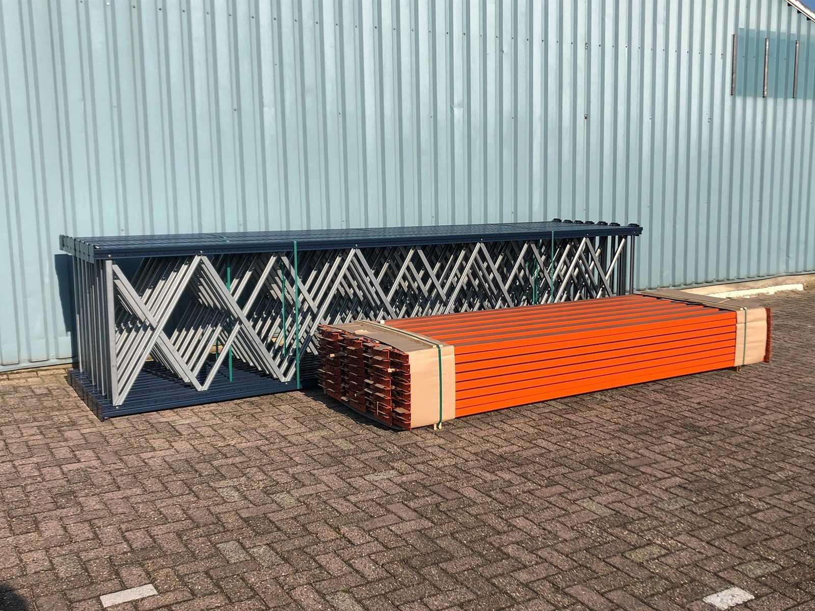 Palletstelling 39.0m lang met 2 niveaus en liggers 2.7m lang per vak. Ongebruikt super netjes Hoogte 500cm diepte 110cm 15 staanders 5000x1100 + 56 Liggers 2700mm Alles is gedemonteerd Incl voetplaten en borgpennen. (zonder de roosters op de laatste foto's, dit is een voorbeeld opgebouwd) Let op het juiste vervoer i.v.m. lengte en gewicht. Heftruck is aanwezig voor het laden. Sectie diepte: 2700mm Aantal staanders: 15 Aantal liggers: 56 Totale afmeting L: 3900cm Totale afmeting Hoogte: 500cm Lengte: 3900cm Breedte: 110cm Hoogte: 500cm