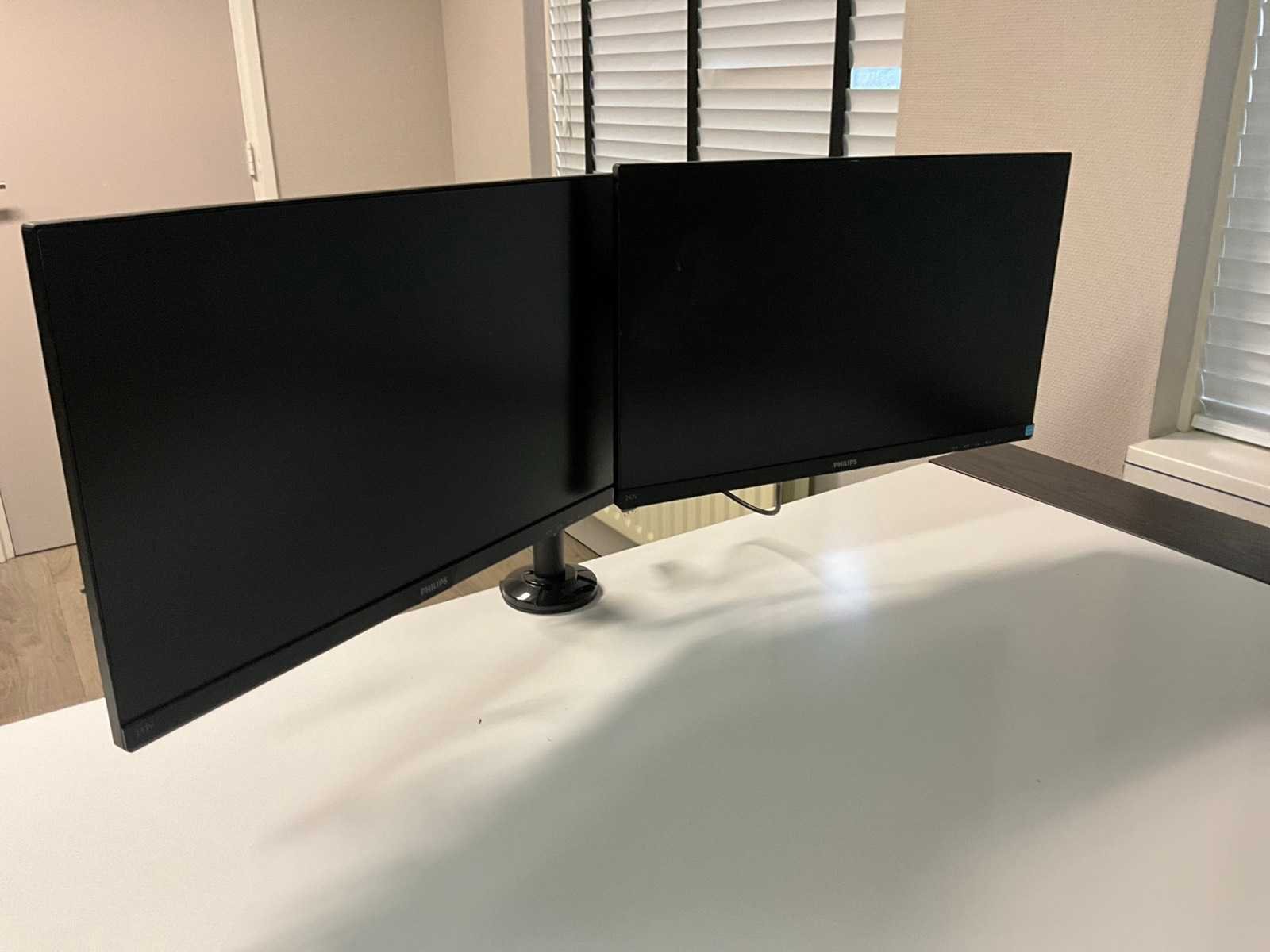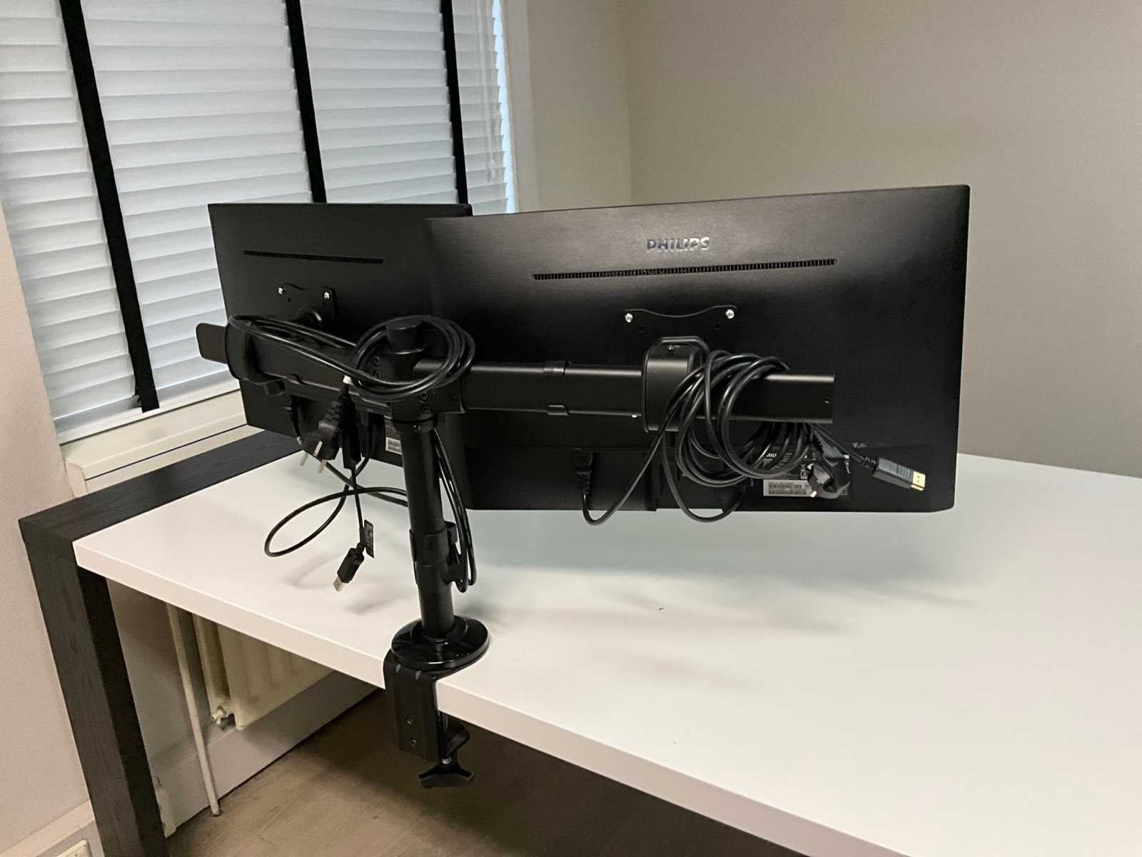 Inclusief 3 stoelen en 2 Philips beeldschermen op statief Lengte: 265cm Breedte: 90cm Hoogte: 77cm