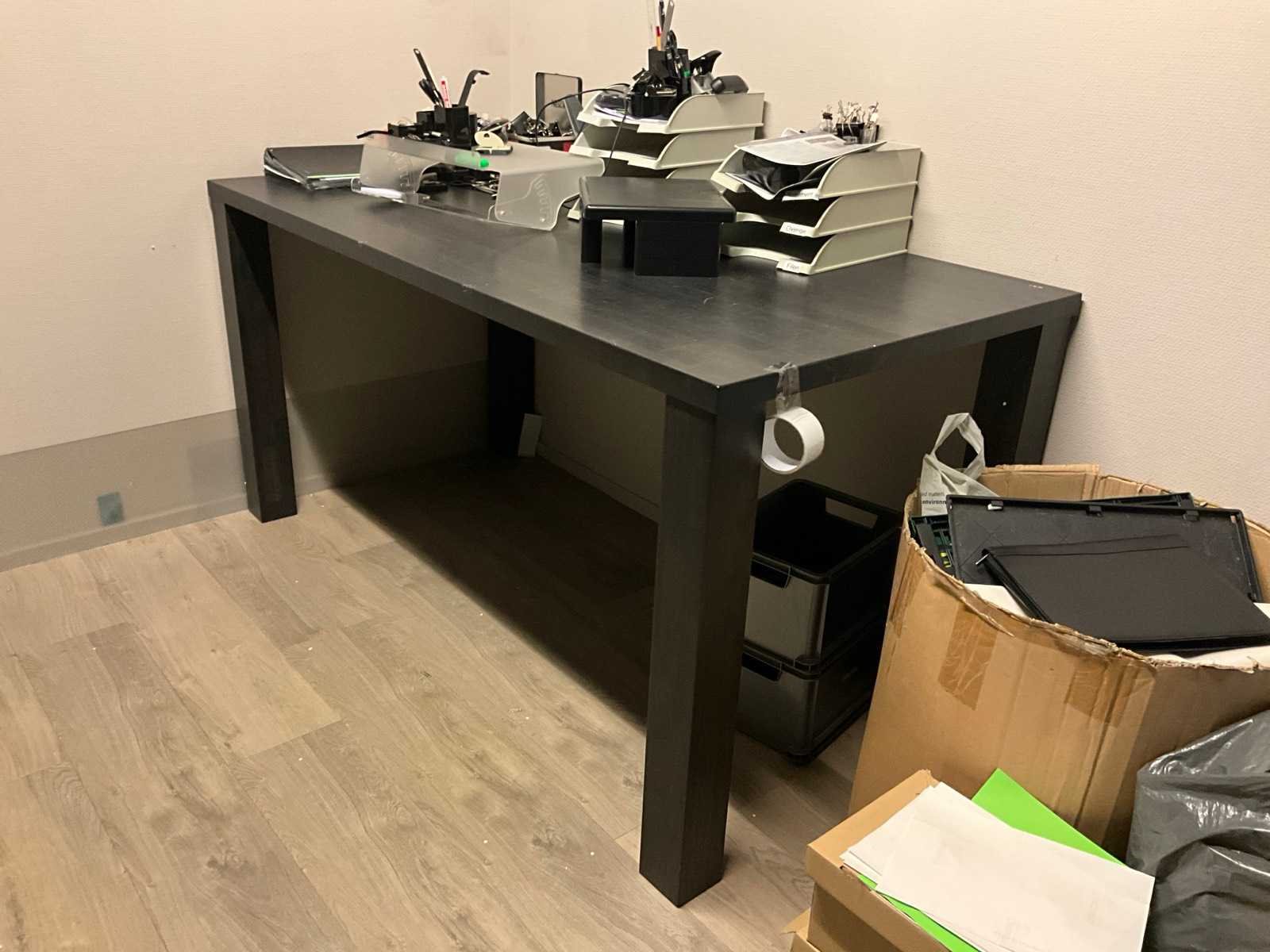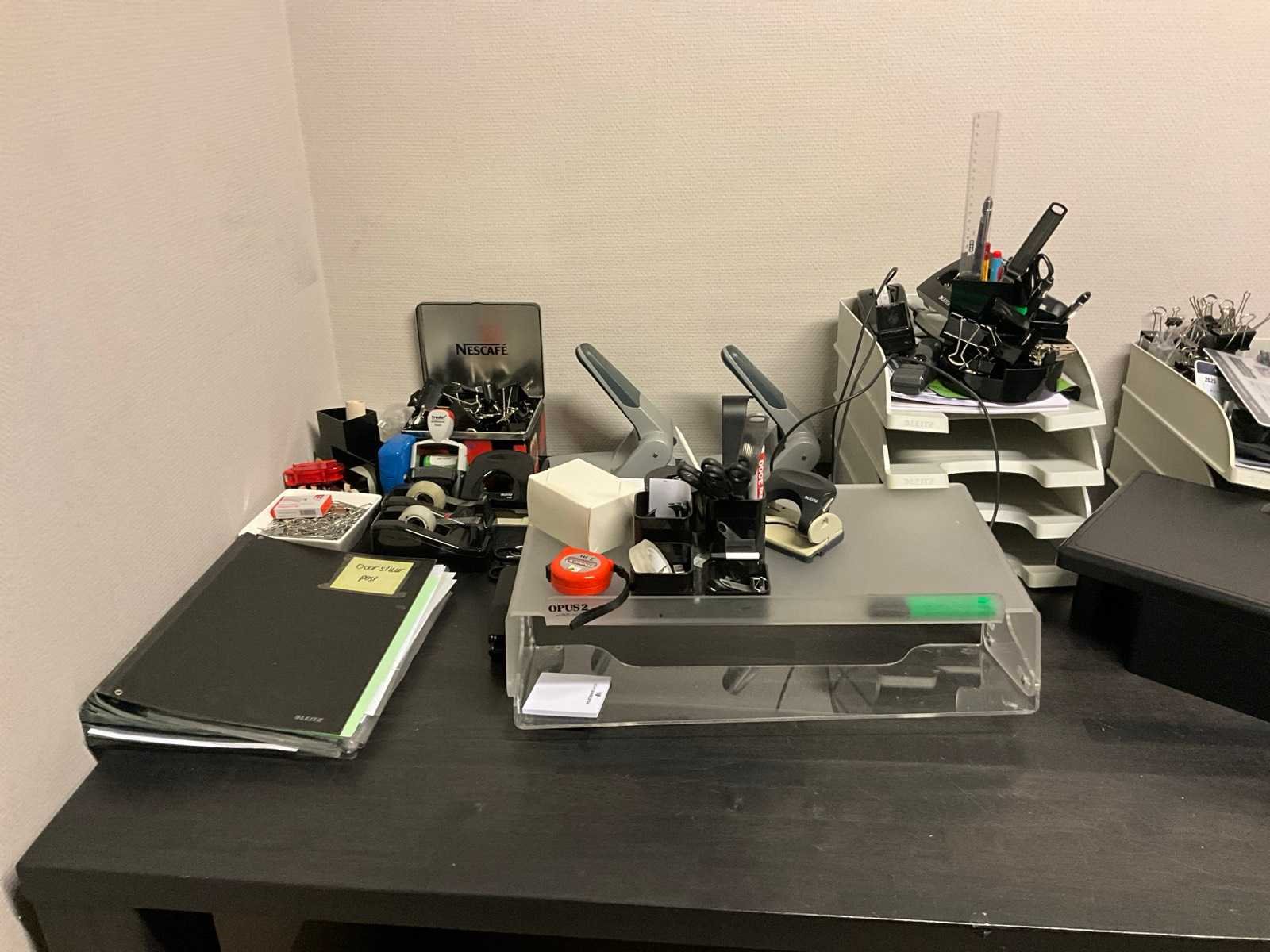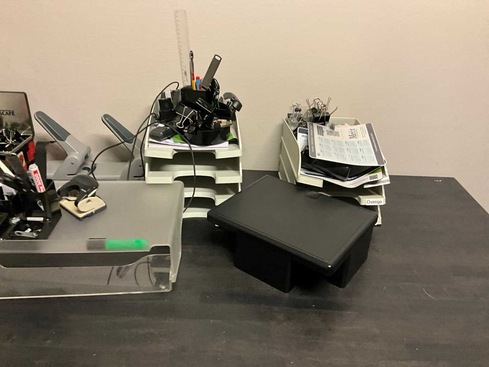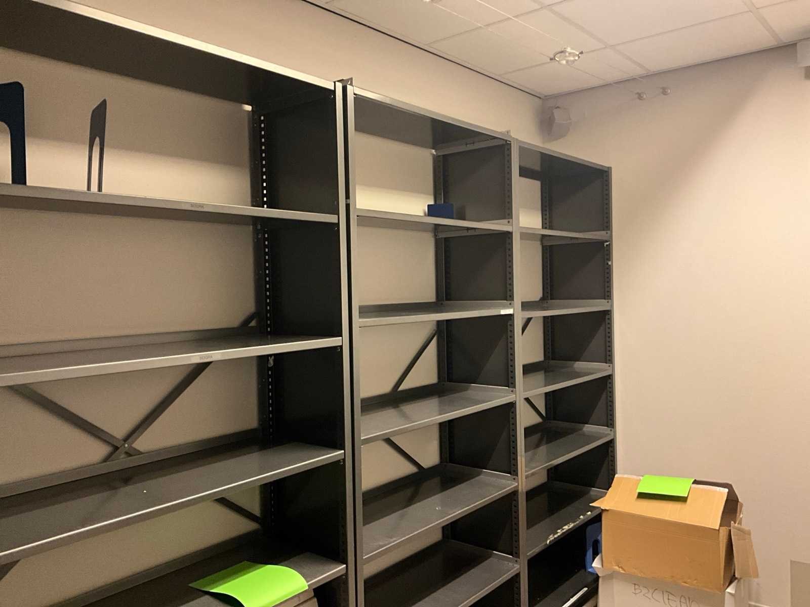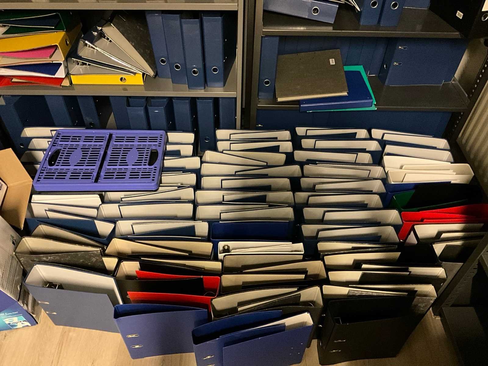 Waaronder Ahrend archiefkast ( 1200x450x1950 mm) en 4 metalen stellingen (2250x400 mm)1x inpaktafel, ordners en kantoorgerief