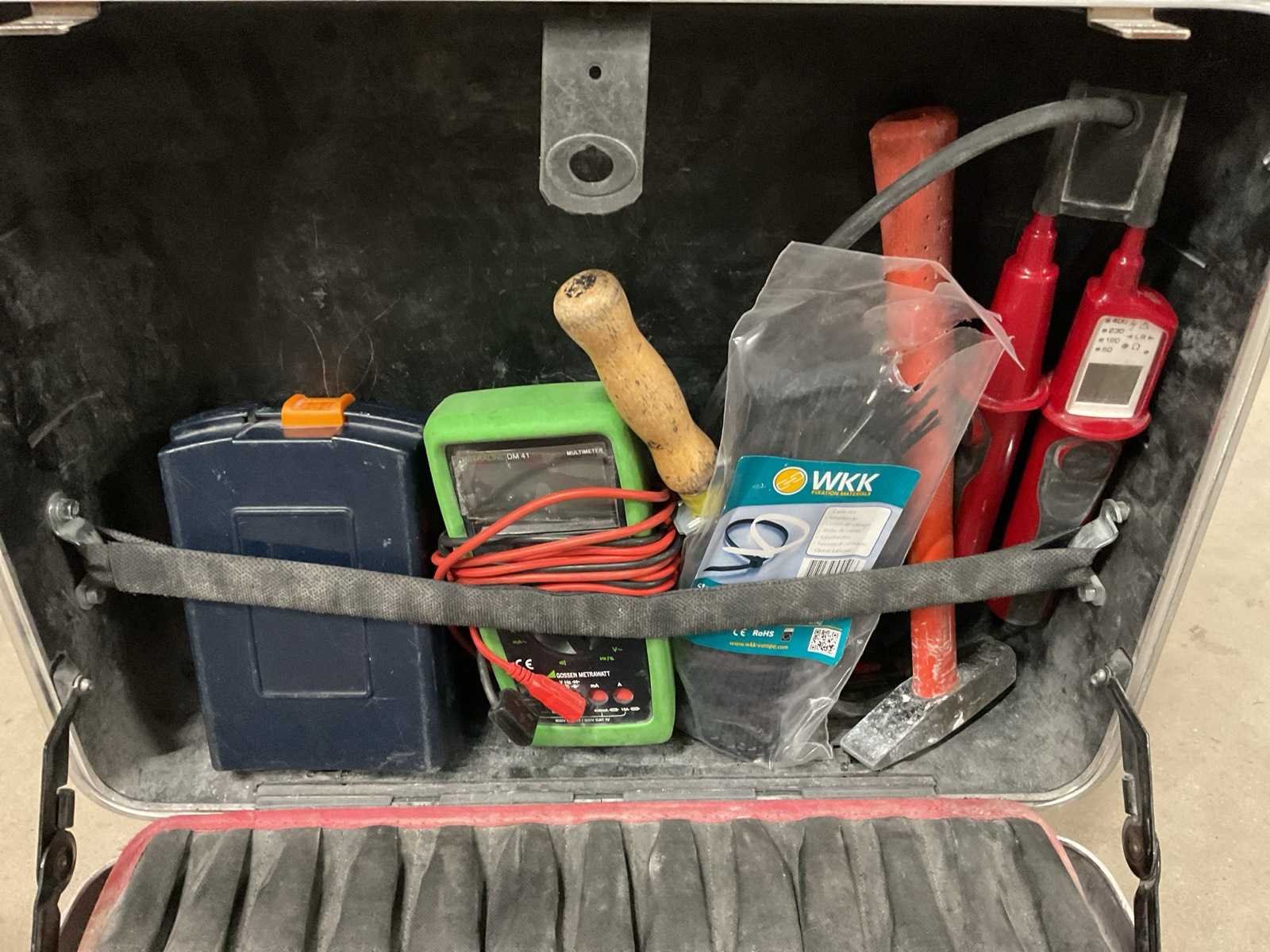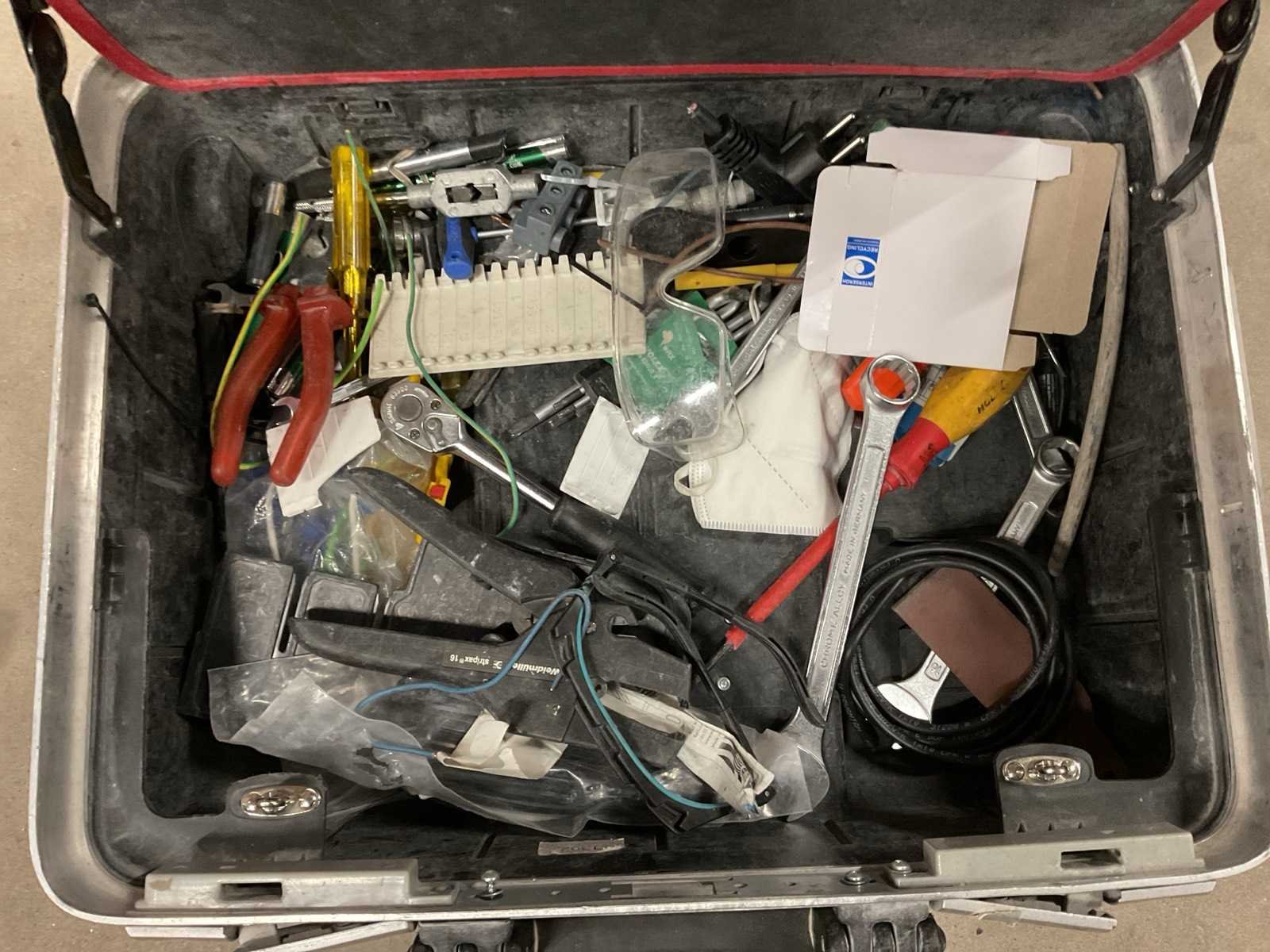 Handvat koffer zit los. Bestaande uit: o.a. meetgereedschap, tangen, krimptangen, inbussleutels, etc. Met koffer: true