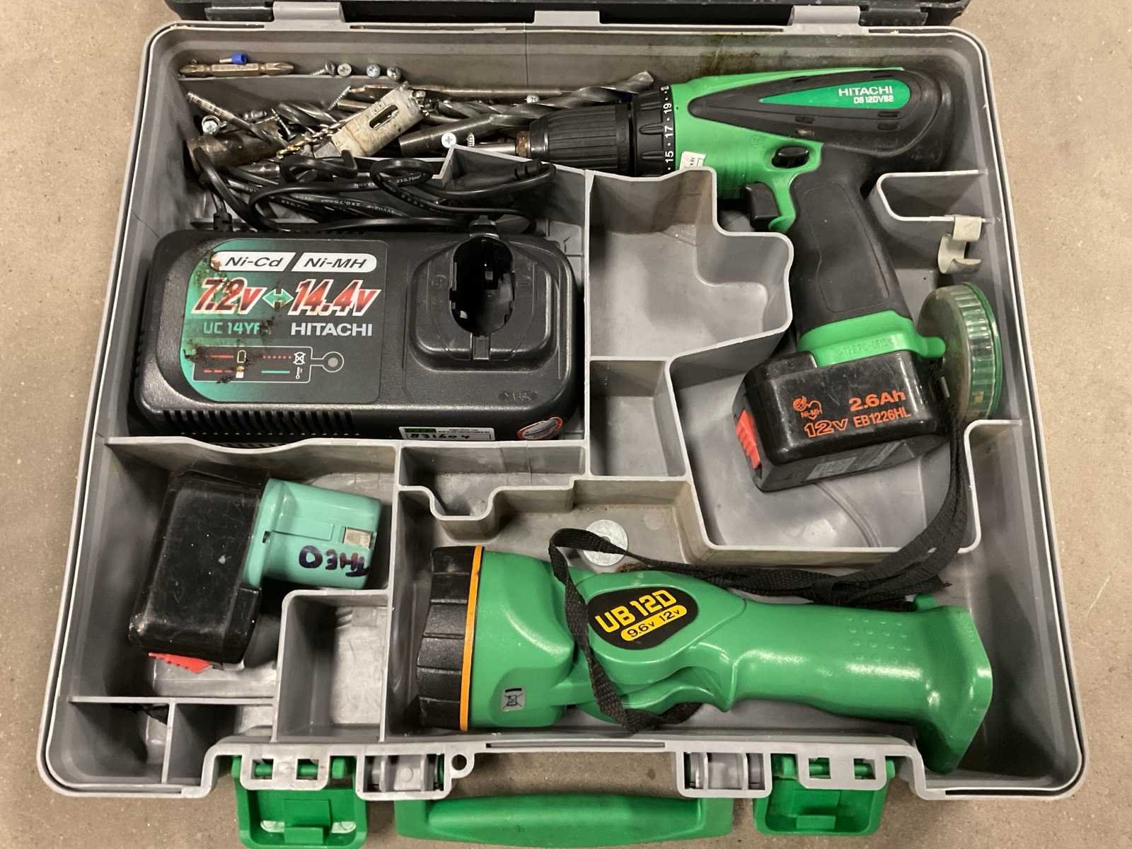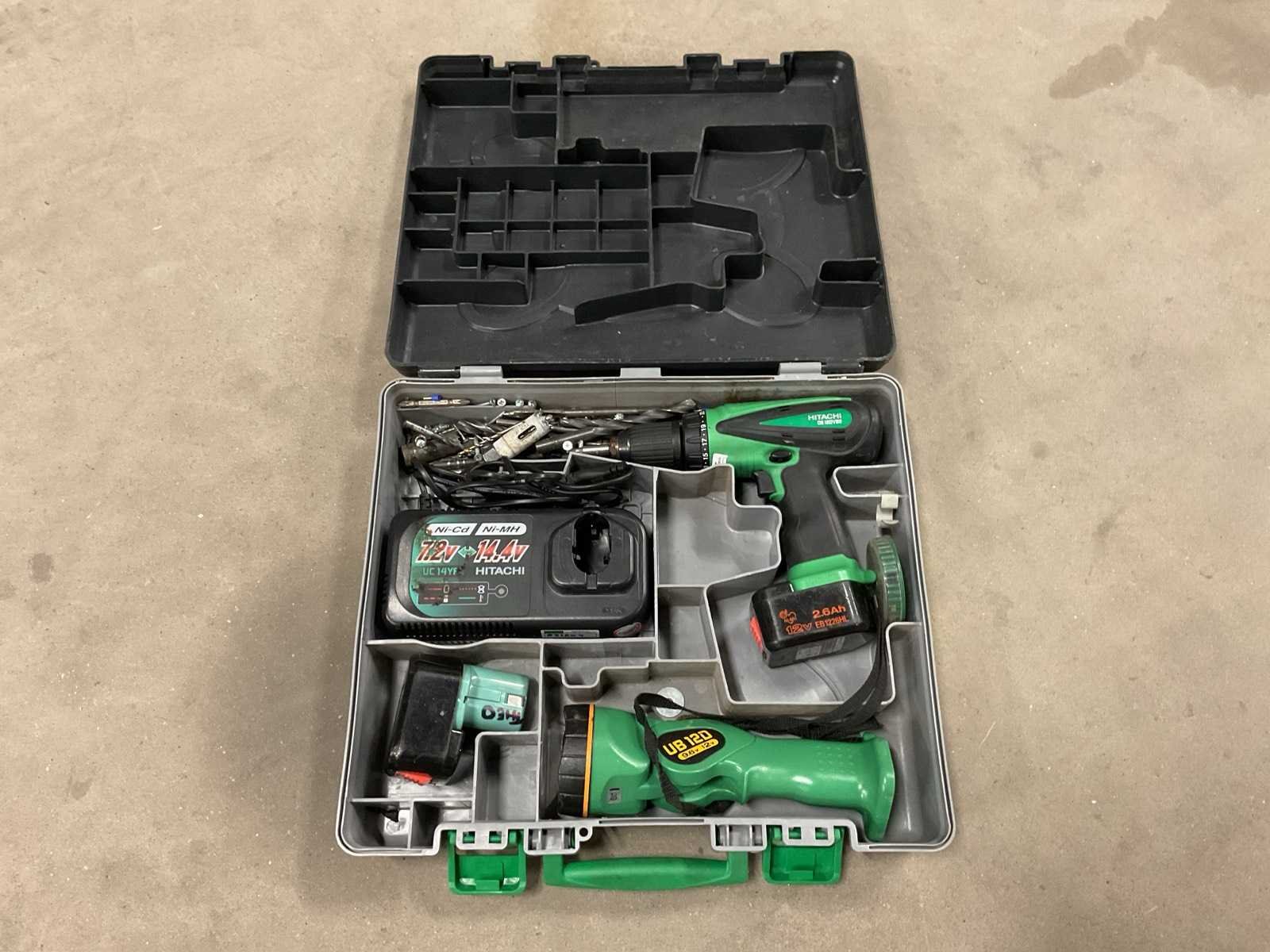 Bestaande uit: 1x accuboormachine en 1x accu schijnwerper Merk: Hitachi Type: DS 12DVB2 + UB 12D Accuspanning: 12V Aantal accu's: 2 Accu type: Ni-MH Accu lader: true Met koffer: true