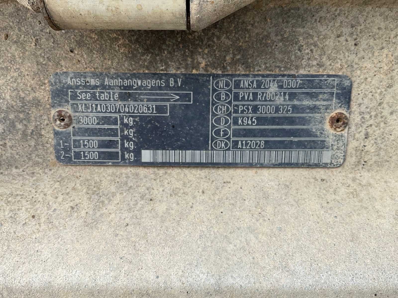 Merk: Anssems Model: PSX2 Bouwjaar: 2005 Chassisnummer: XLJ1A030704020631 Laadbak afmeting l: 330cm Laadbak afmeting b: 184cm Ledig gewicht: 465kg Laadvermogen: 2535kg Datum eerste toelating: 2005-04-05 Datum eerste toelating (NL): 2005-04-05 Kenteken: WL-SB-19 Hoogte: 245cm Lengte: 490cm Breedte: 184cm