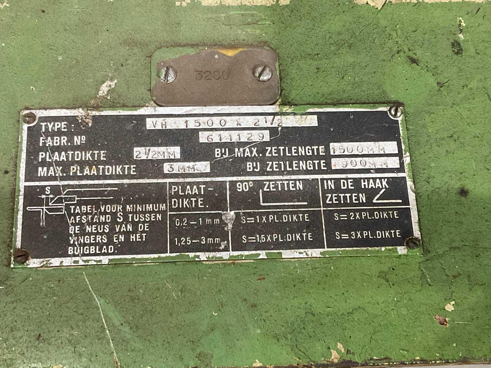 Bij max zetlengte 1500 mm Type: VH1500x2 1/2 Serienummer: 611129 Max. plaatdikte: 3mm Afmeting l: 780mm Afmeting b: 2200mm Afmeting h: 1440mm