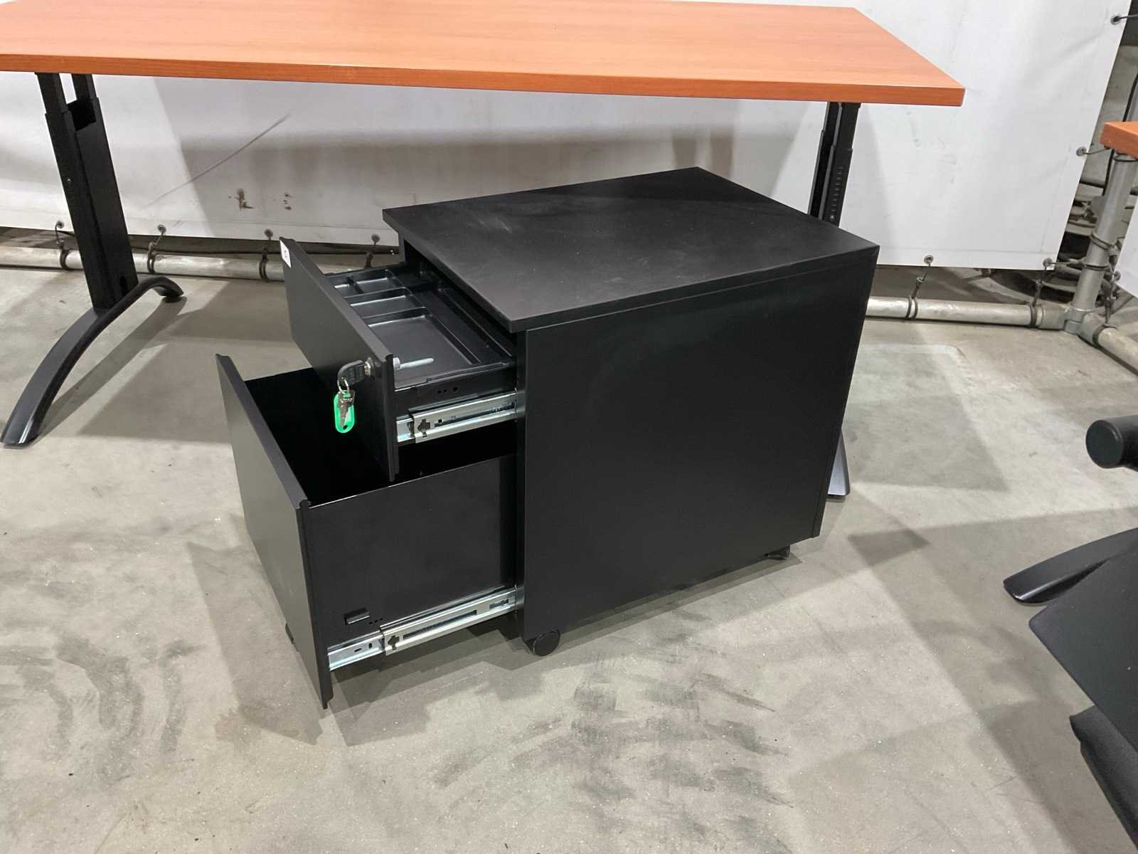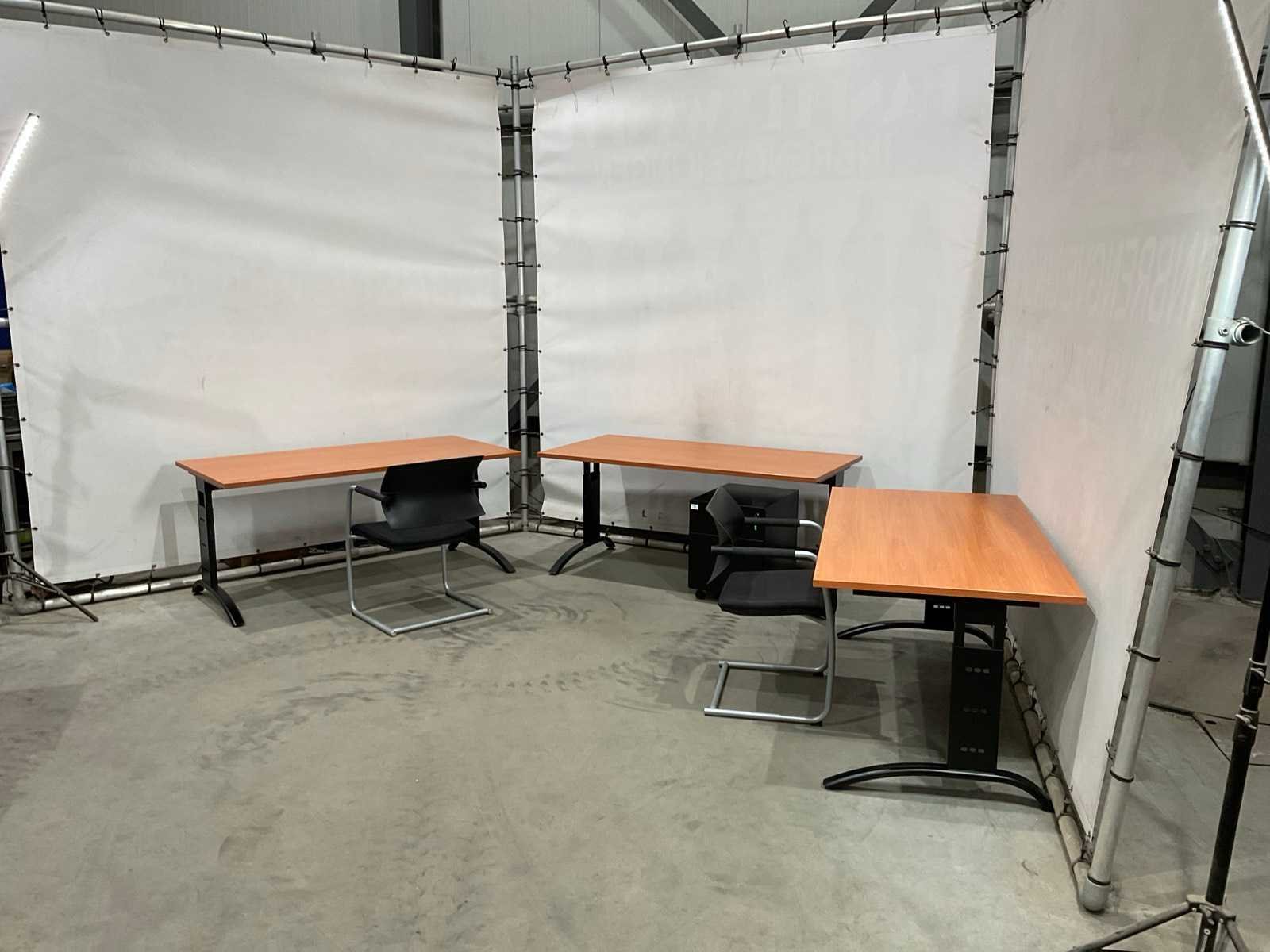 3x bureau tafel; tafelbladen van kersenhout ; zwarte poten; 2x stoel ; merk air junior; ladenblok merk dorma ; verrijdbaar met hangmappenlade Merk: Actif Lengte: 160cm Breedte: 80cm Hoogte: 72cm