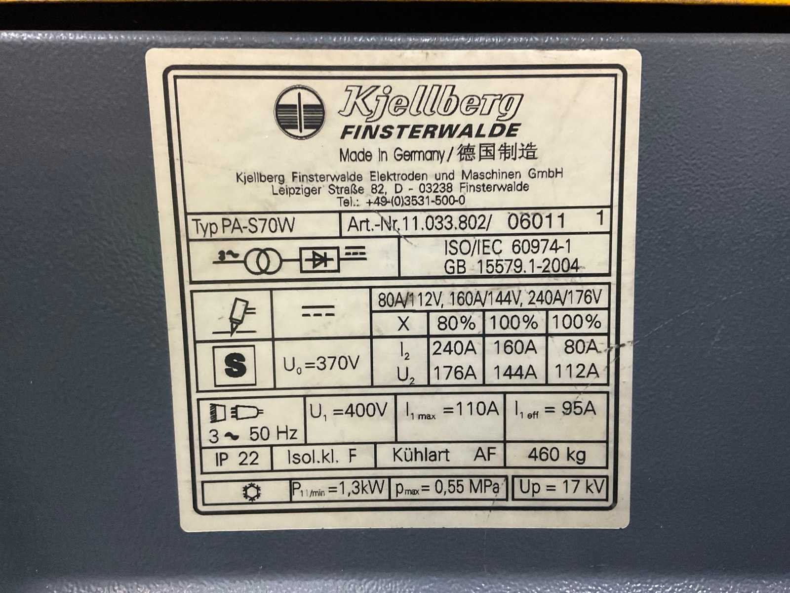 Merk: Kjellberg Type: PA-S70 W Afmeting l: 1290mm Afmeting b: 850mm Afmeting h: 1050mm