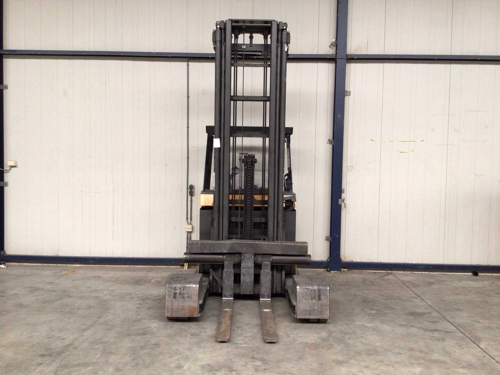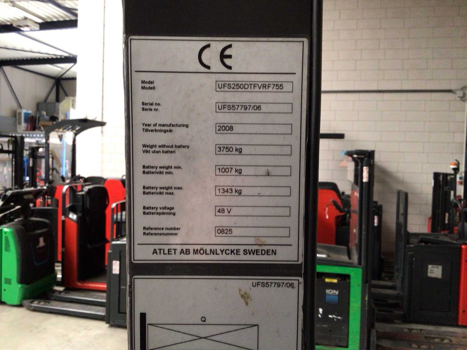 Inclusief lader 4 weg reachtruck met vorkenspreider van 1500 mm spreiding Merk: Atlet Type: UFS250DTFVRF755 Bouwjaar: 2008 Serienummer: UFS57797/06 Brandstof: Elektrisch Mast: Triplex Soort band: Vulkolan Aantal wielen: 5 Afgelezen urenstand: 3645 Accu lader: true Free-lift: true Side-shift: true Hydraulisch verstelbare lepels: true Triple mast: true Eigen gewicht: 4757kg Hefvermogen: 2500kg Lepellengte: 1150mm Hefhoogte: 7550mm Minimale doorrijhoogte: 3395mm Totale afmeting L: 2600mm Totale afmeting Breedte: 1350mm Totale afmeting Hoogte: 3395mm Elektrisch: true Vol rubber banden: true